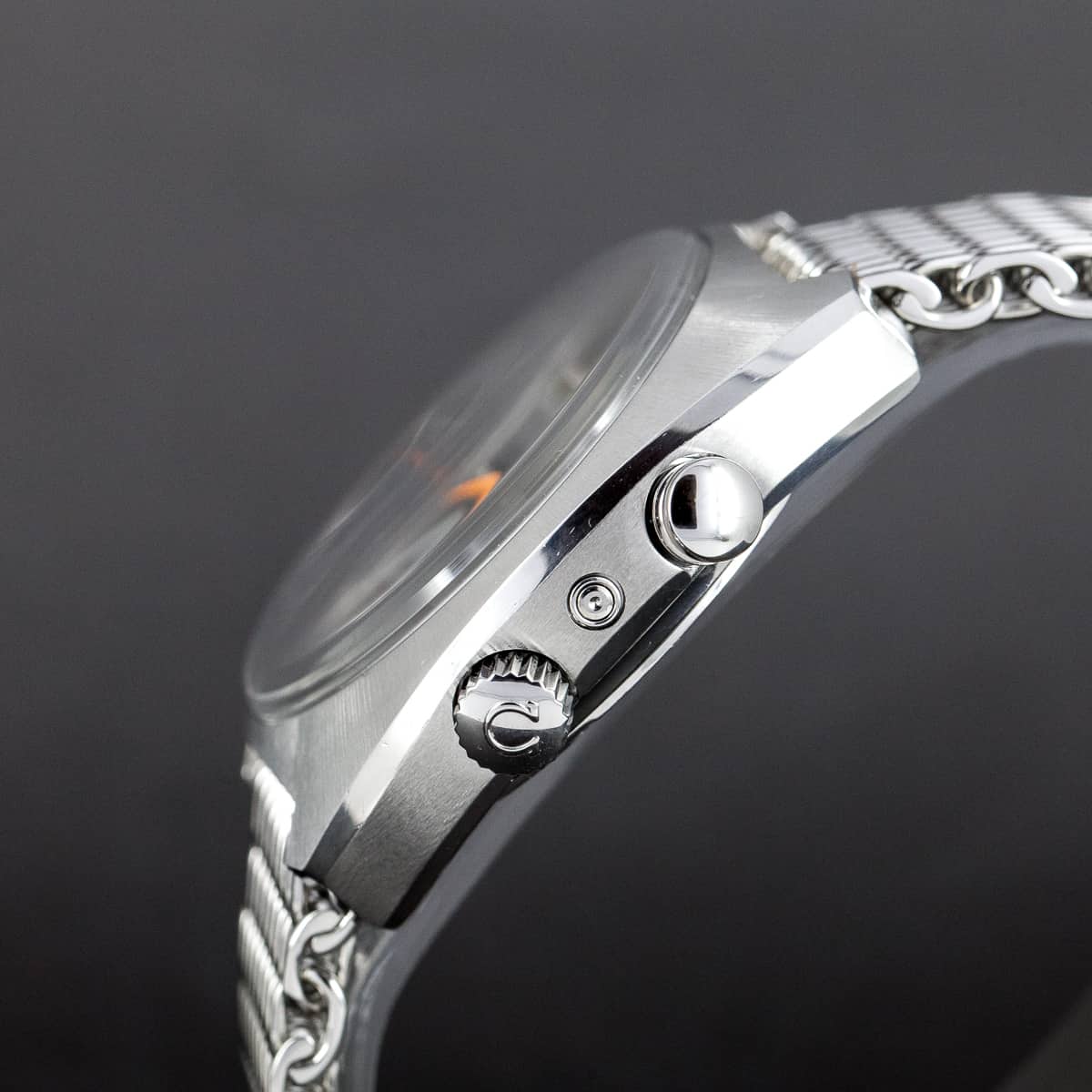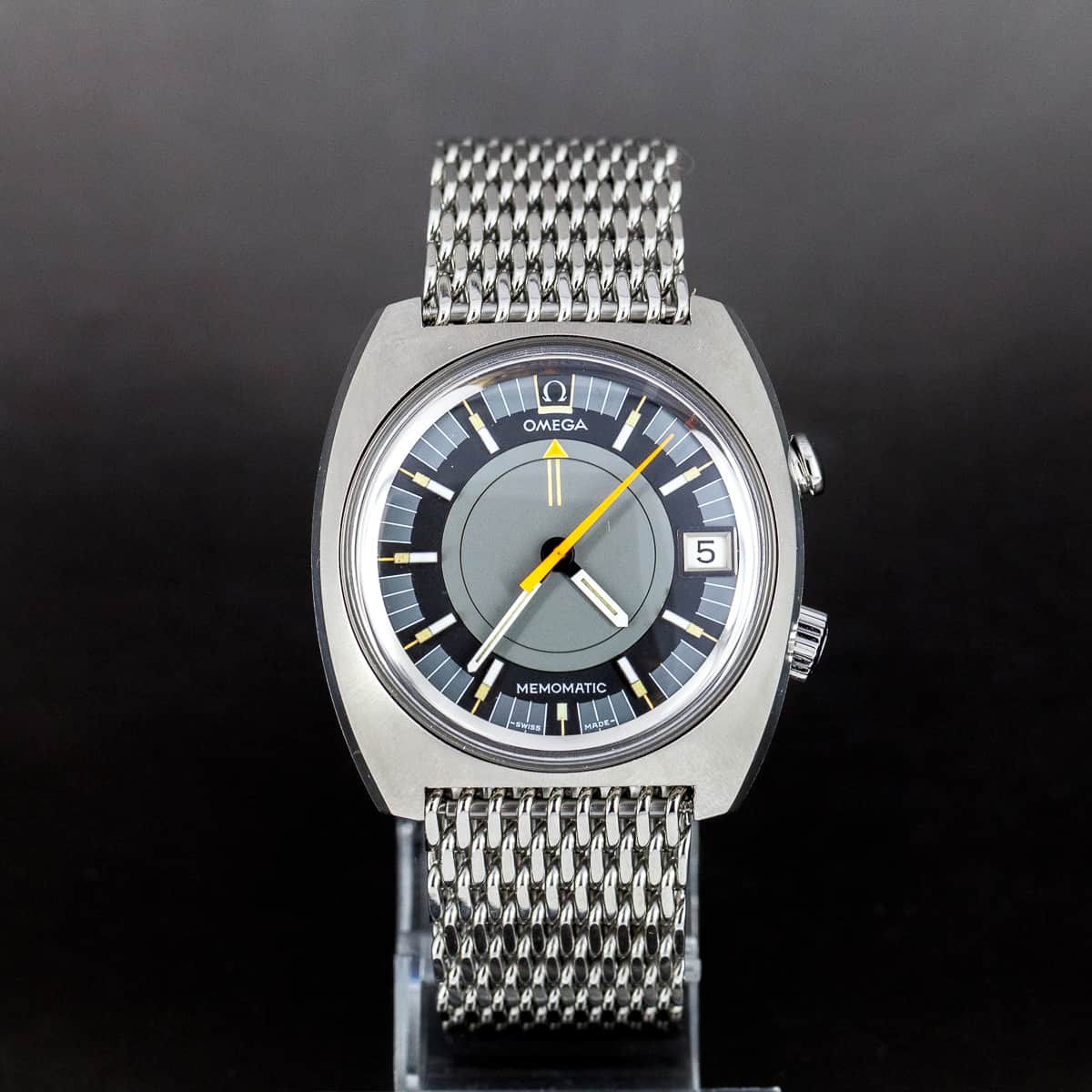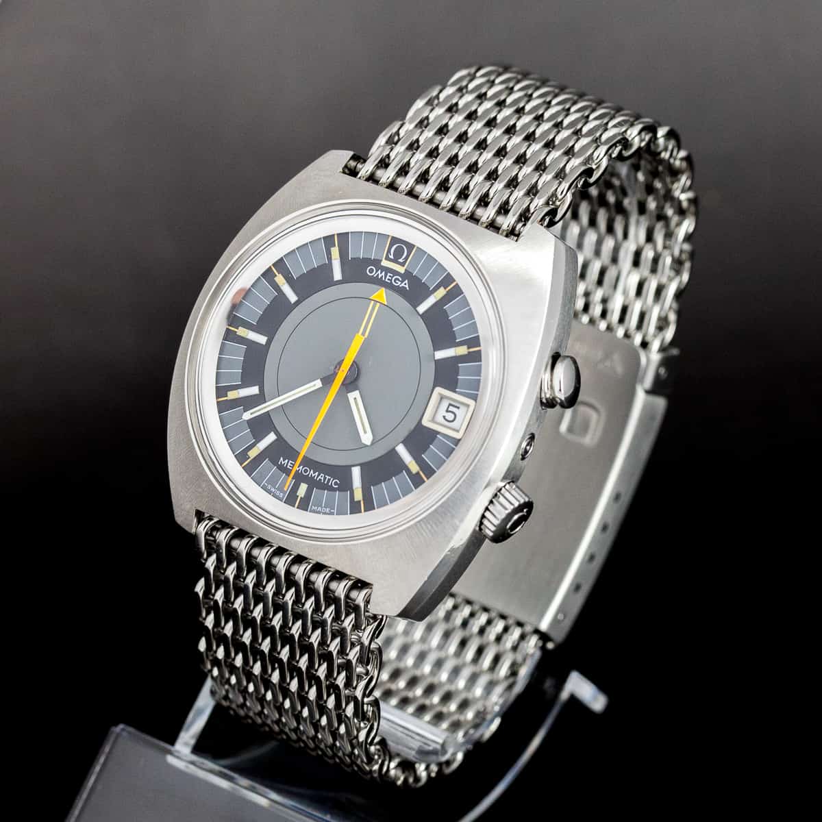 Omega Seamaster Memomatic vuodelta 1970. Ref.166.072. Koneisto on Omegan cal.980 automaattikoneisto herättäjämekansimilla. Kello on juuri täydellisesti kunnostettu. Alkuperäinen harmaa-oranssi kellotaulu. Omegan alkuperäinen off-shore teräsranneke. Kuoren koko 40×50mm.