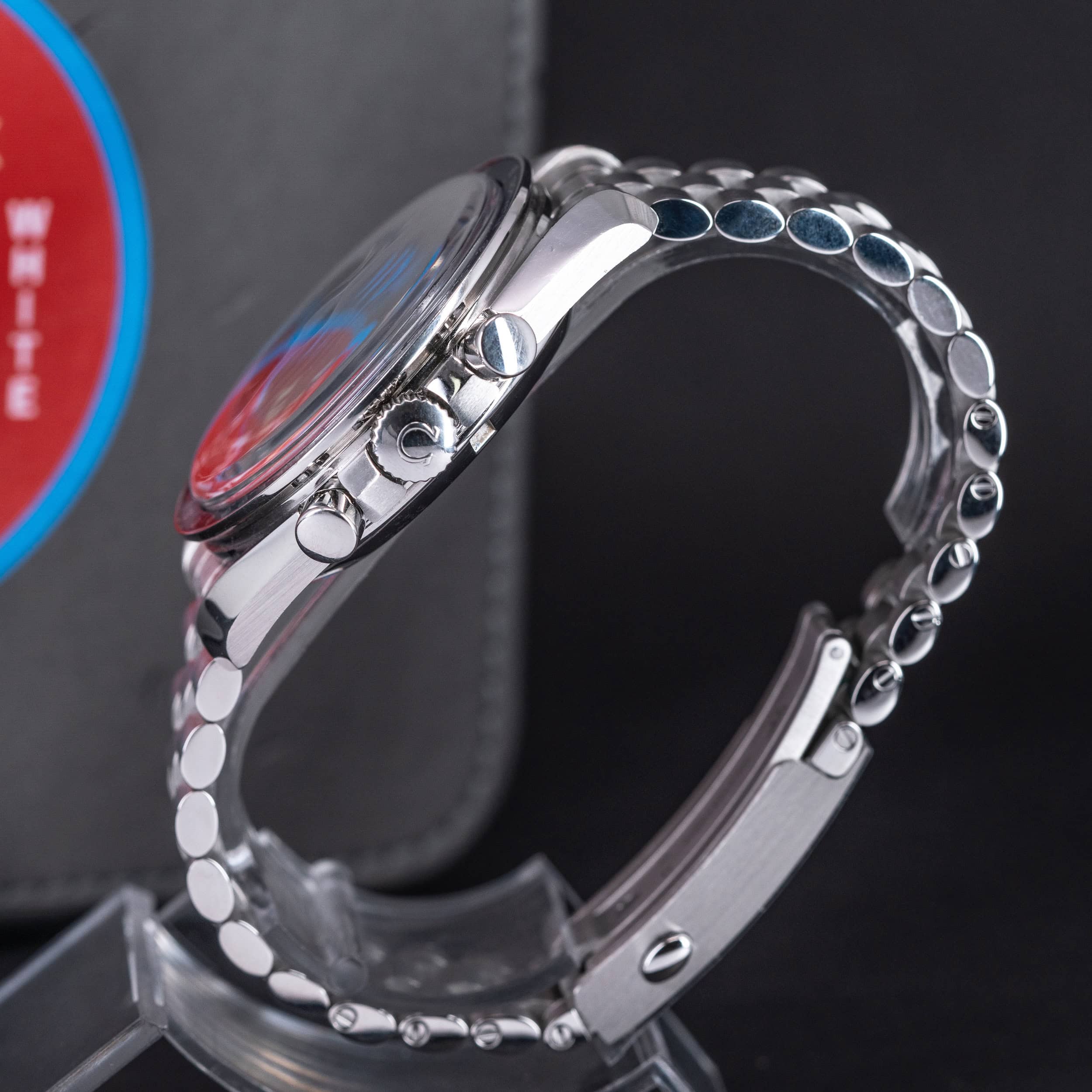 Kellossa on virheetön Gemini-mallin sininen panda kellotaulu ja teräksenväriset superluminova osoittimet. Teräskuori on erittäin hyvässä kunnossa. Kuori on roiskevesitiivis, testattu +3.0/-0,4 bar. Kuoren koko on 42 mm.