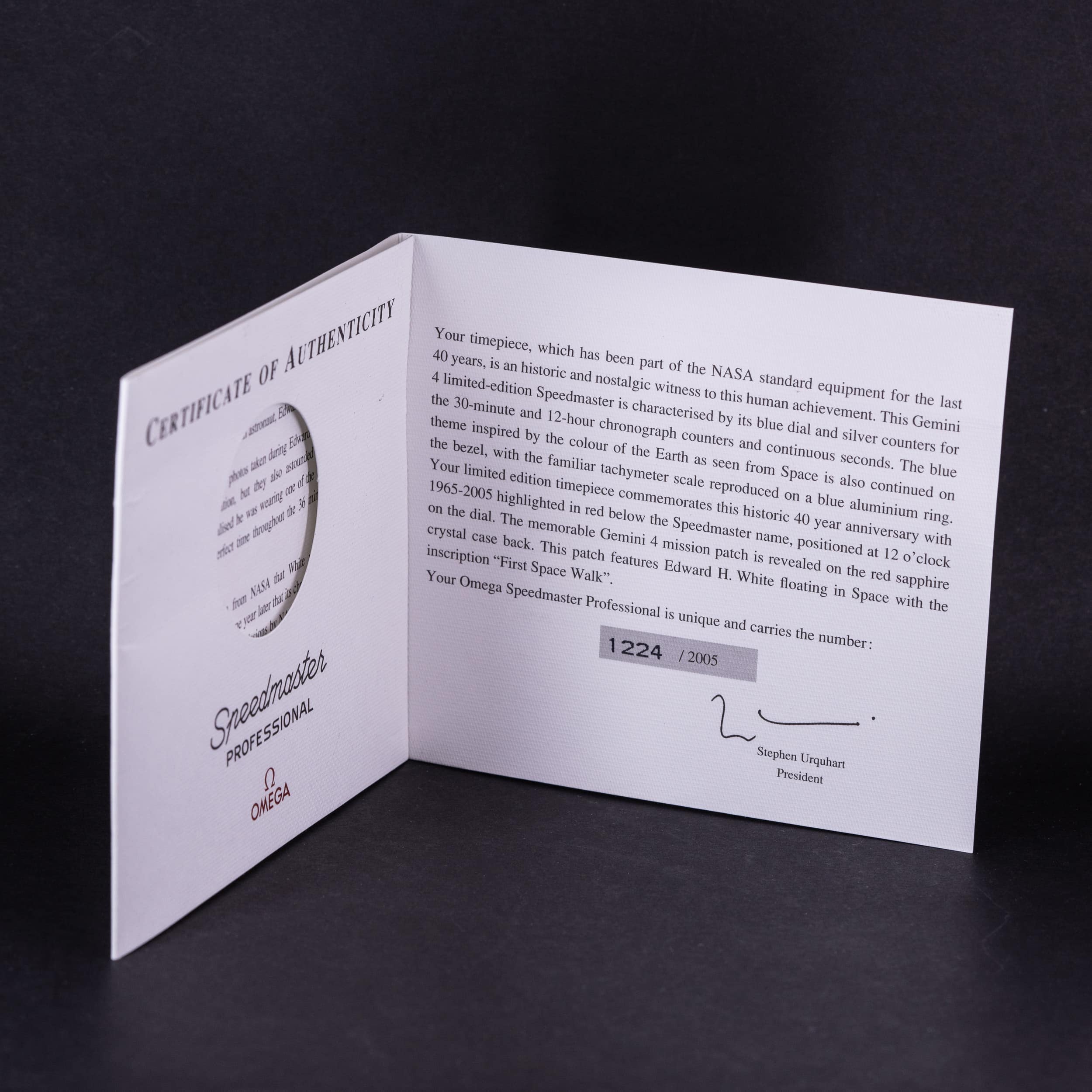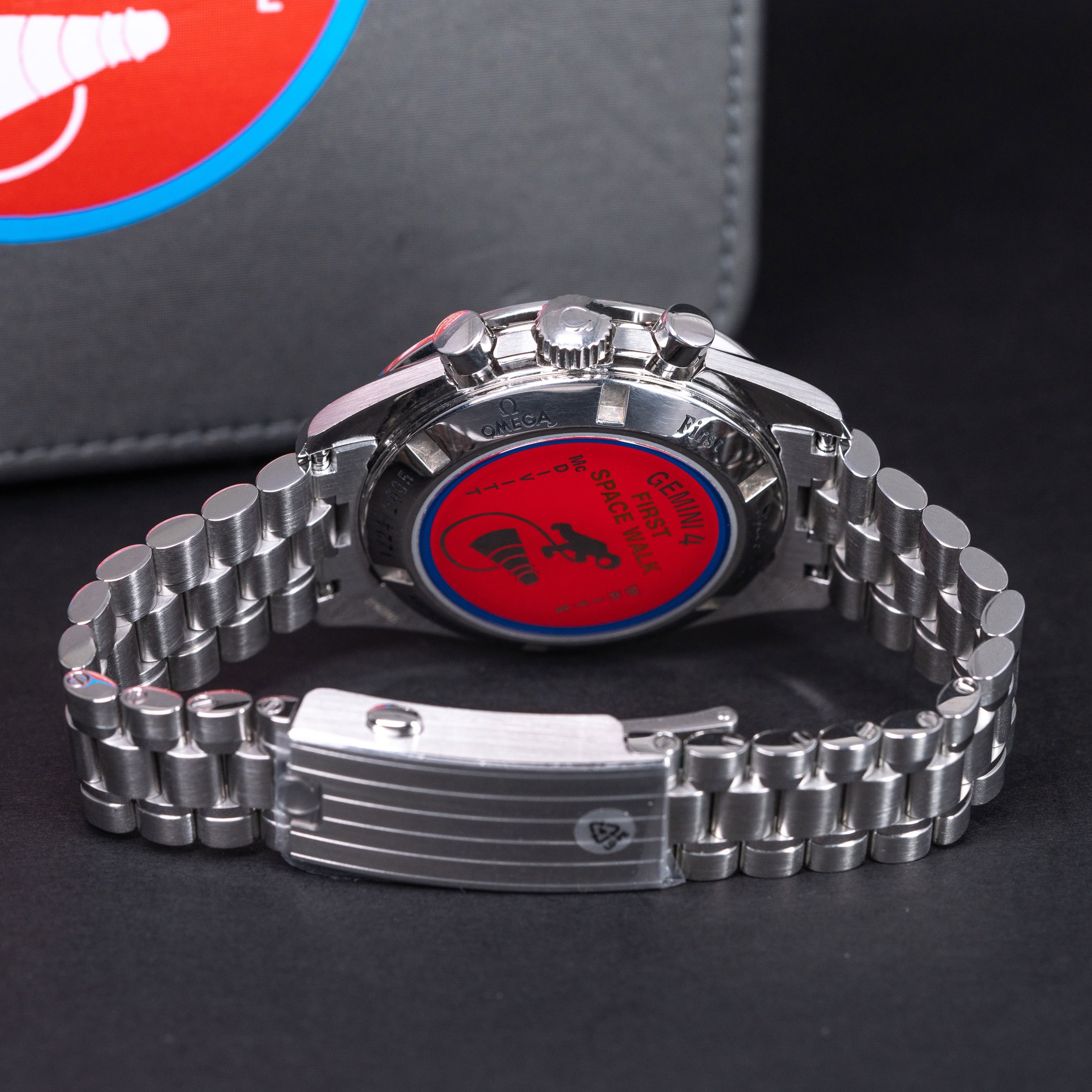 Omega valmisti näitä kelloja 2005 kappaletta ja niille tehtiin oma Limited Edition laatikko, sekä jokaiseen kelloon kuuluva numeroitu todistus. Sinisen kellotaulun ja sinisen lasisarjan lisäksi erikoisuutena on takapohjassa, safiirilasin päällä oleva GEMINI-4 lentotunnus. Punaisen tunnuksen teksti on ”First space walk, McDivitt, White”. Takapohjan reunalla kiertää kaiverrettu teksti: First space walk 40th anniversary.