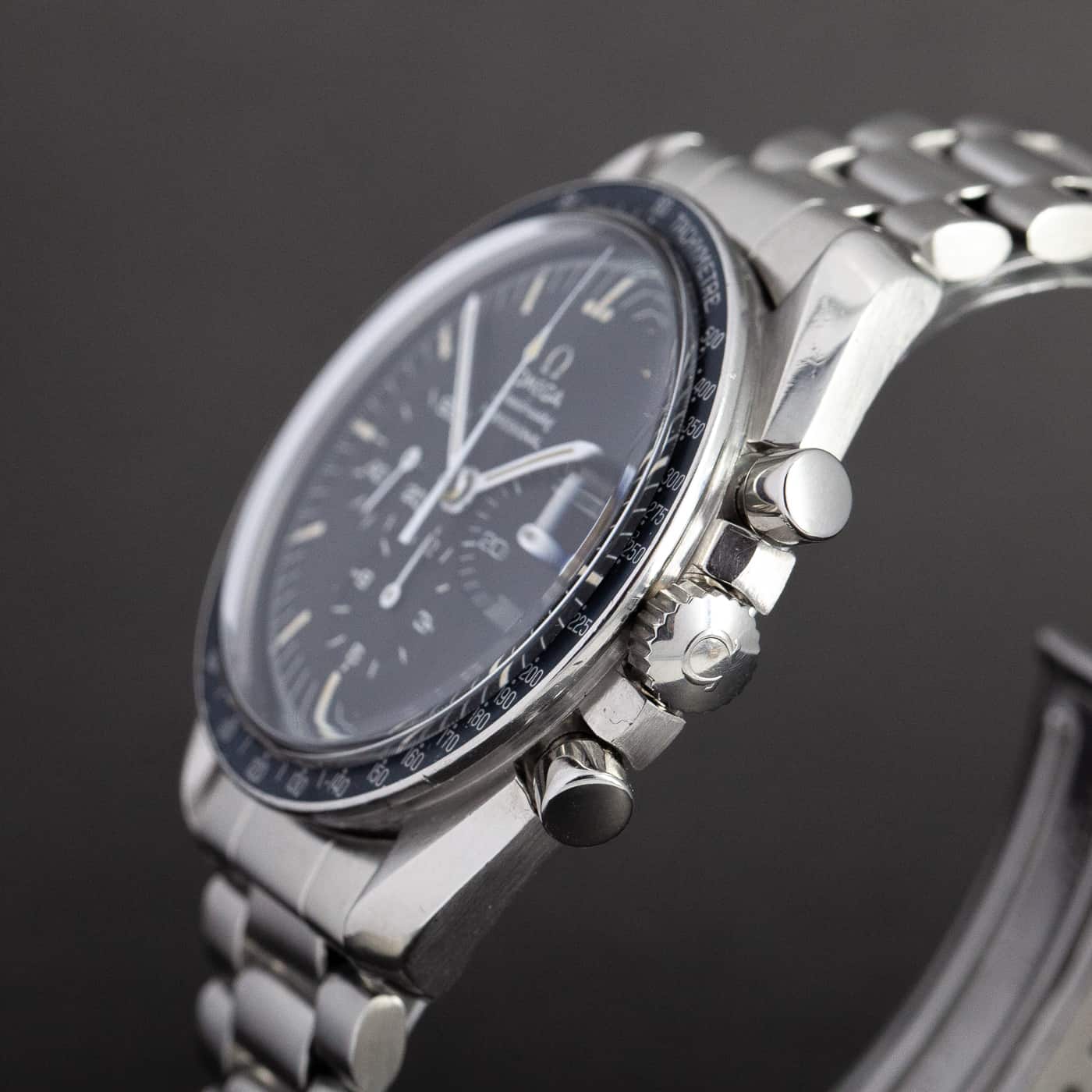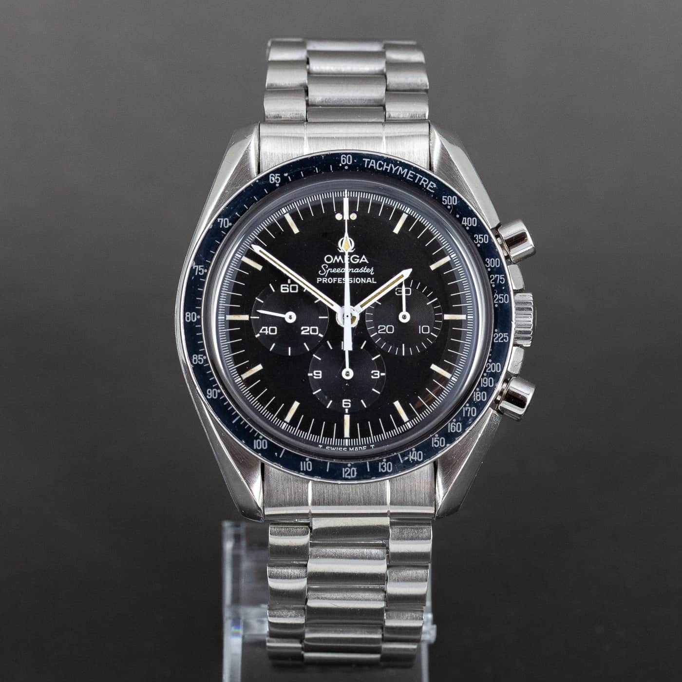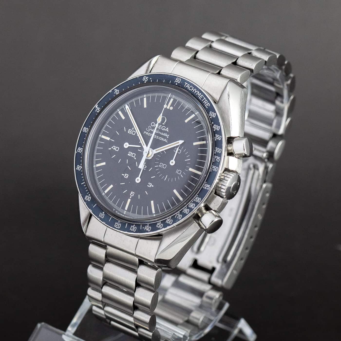 Harvinainen Omega Speedmaster ref.145.022-69 ”Straight writing” loppuvuodelta 1969. Täysin alkuperäinen kokonaisuus. Hienosti ikääntynyt tritium step-dial ja tritium osoittimet. Alkuperäinen siniseen sävyttynyt DN90 bezel. Juuri täysin kunnostettu cal.861 koneisto. Alkuperäinen teräsranneke ref.1171. Kuoren koko 42mm.