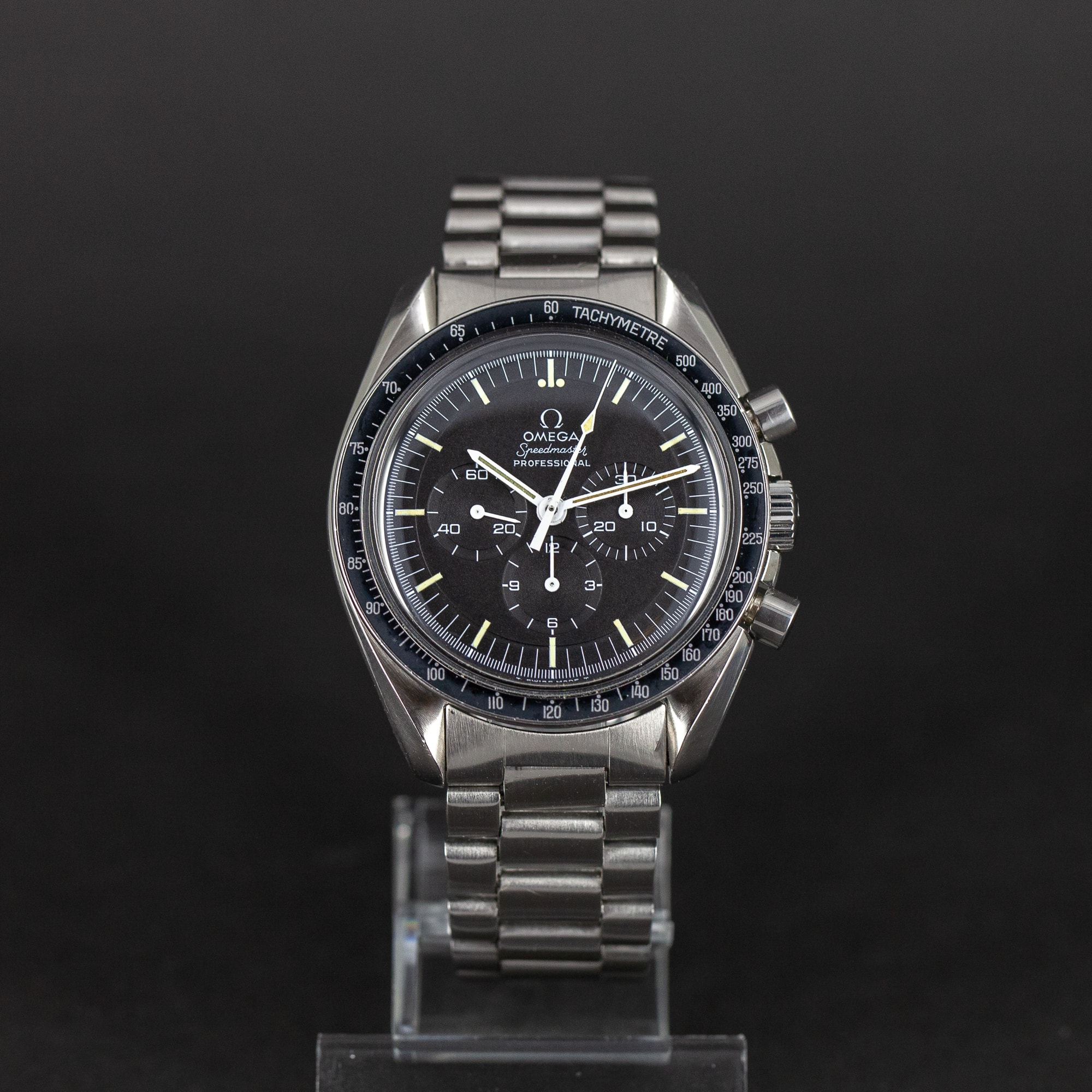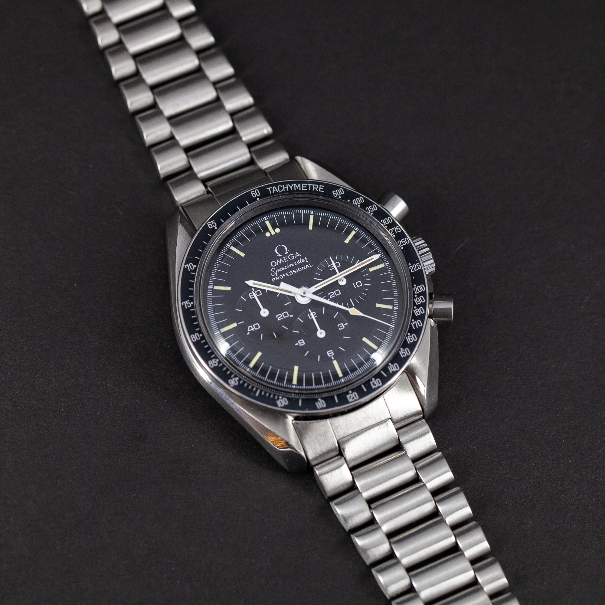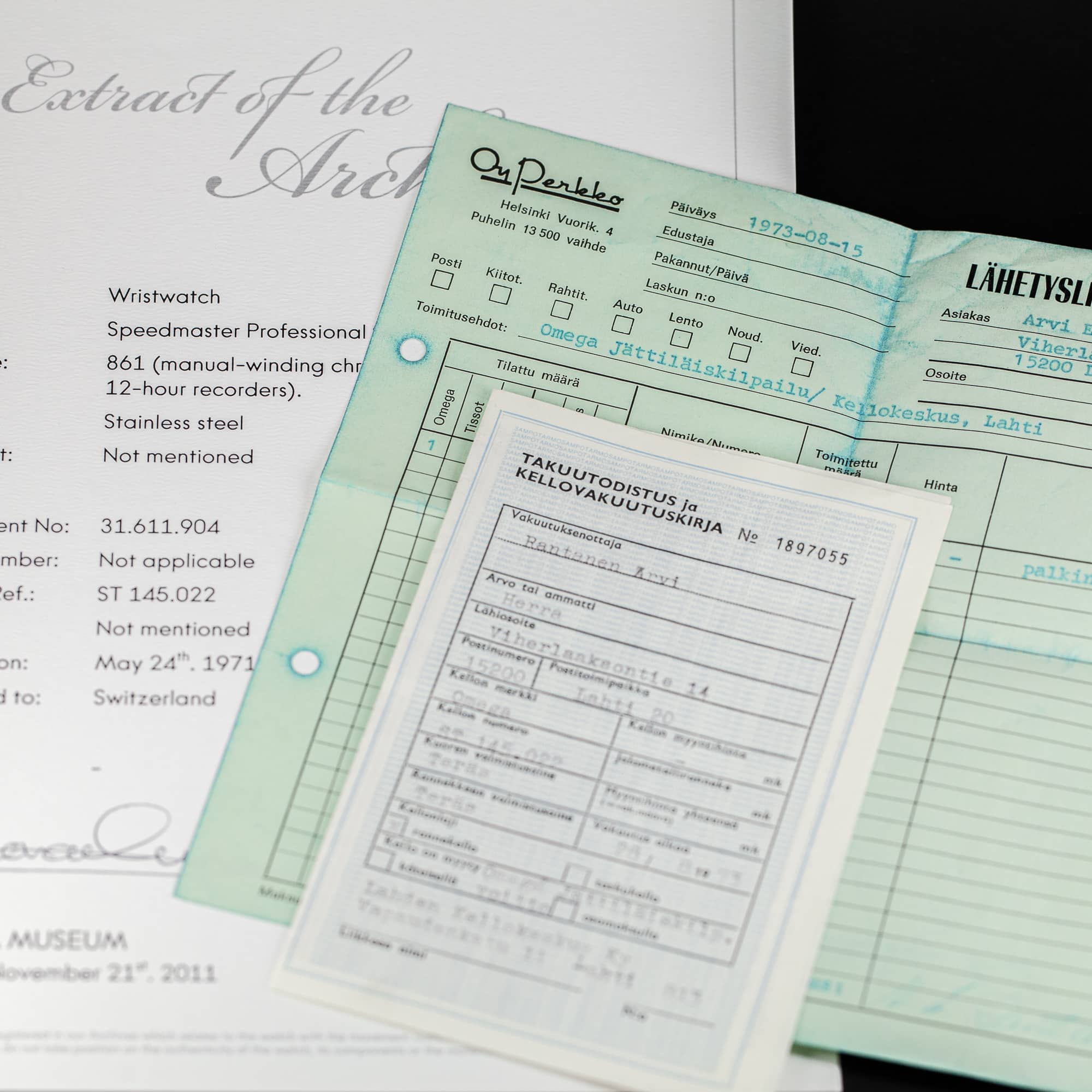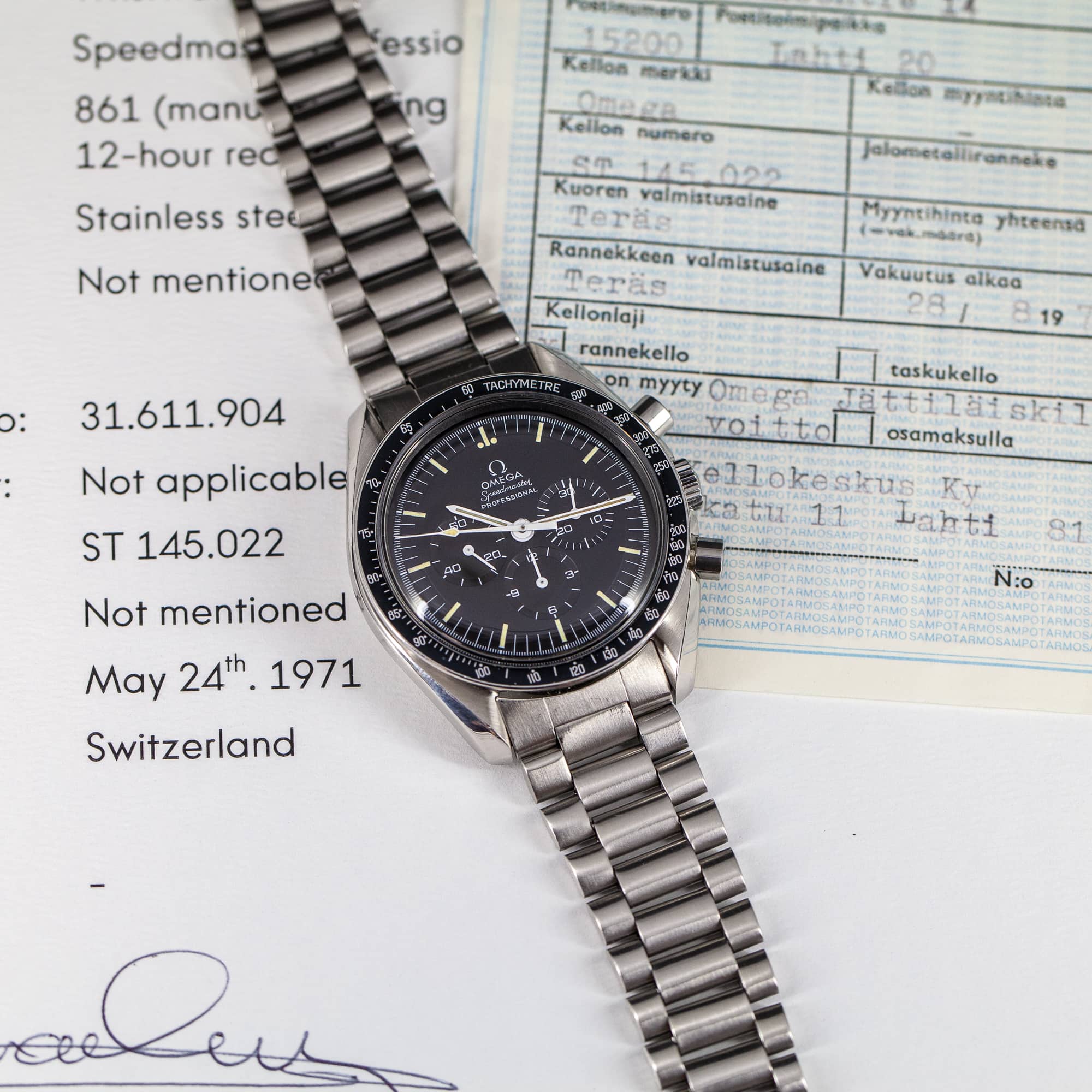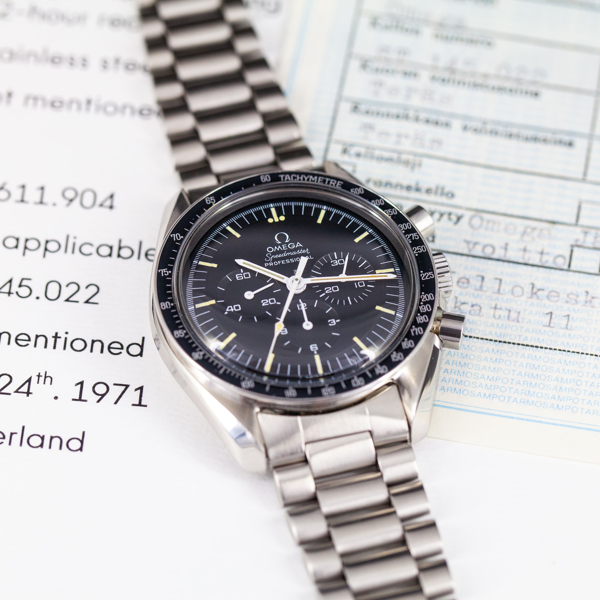 Omega Speedmaster Professional vuodelta 1971. Ref. 145.022-71. Huippukuntoinen porrastettu kellotaulu ja tritium osoittimet. Alkuperäinen siniharmaan sävyinen DN90-bezel on hyvässä kunnossa. Juuri täysin kunnostettu Omegan cal.861 kronografikoneisto. Kuoria ei ole hiottu/kiillotettu huollon yhteydessä ja ne ovat hyvässä kunnossa. Alkuperäinen Omegan vanha no.11 (1171) teräsranneke. Mukana takuupaperit, kuitit, Extract from Archives todistus.