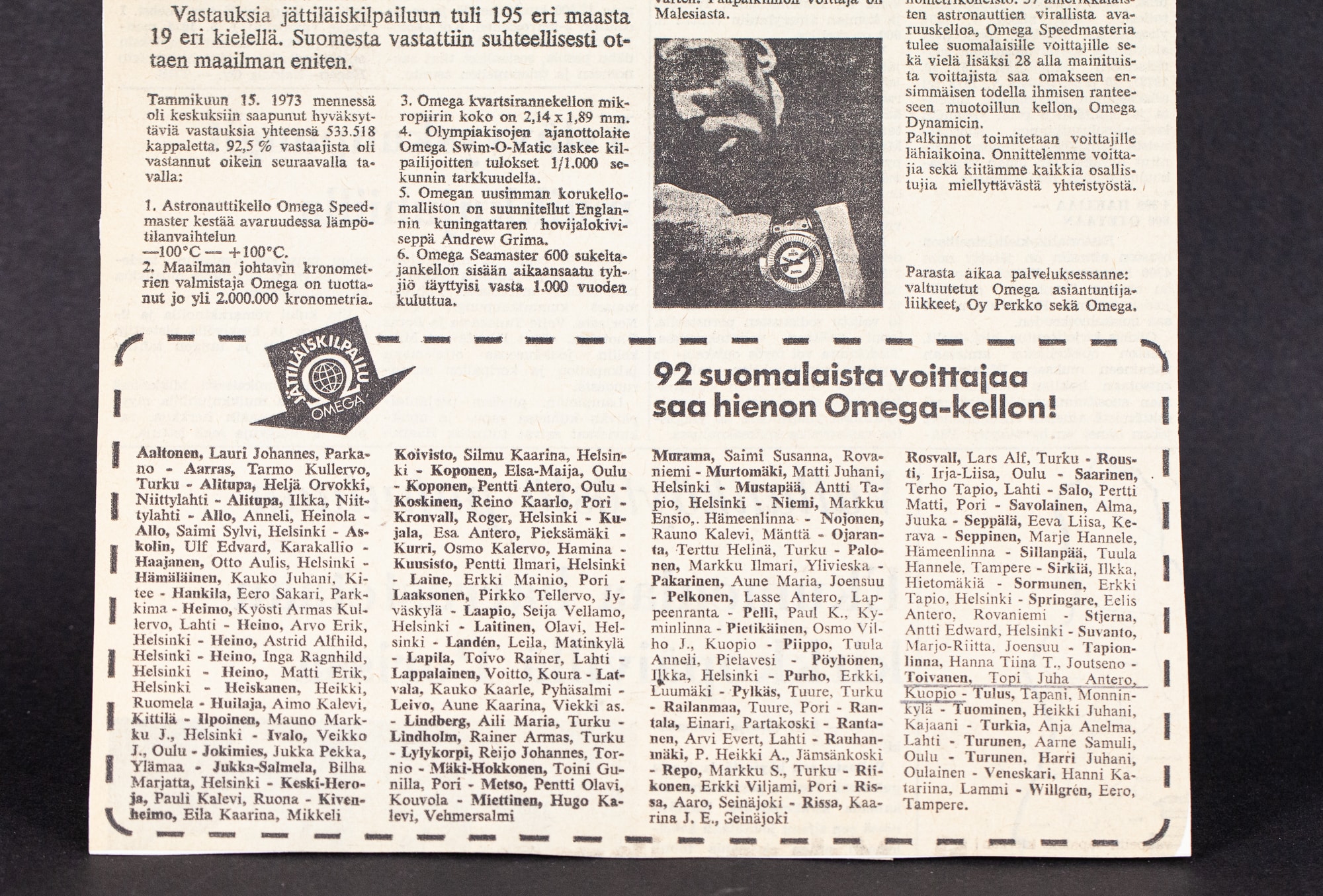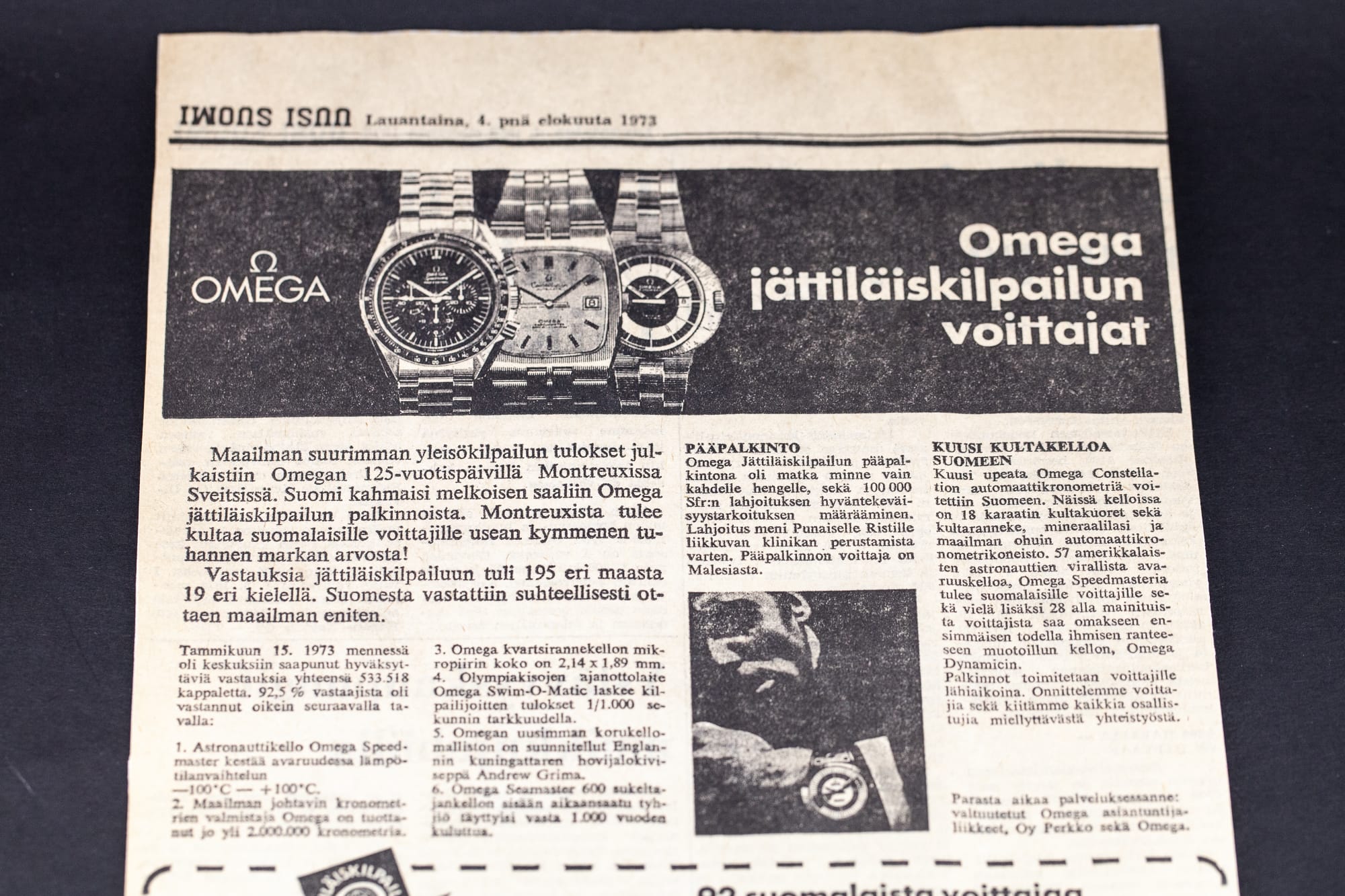 Omega järjesti 1973 yrityksen 125 vuotisjuhlan kunniaksi maailmanlaajuisen yleisökilpailun. Kilpailuun osallistuttiin 195 eri maasta ja vastauksia tuli yhteensä 533.518 kpl. Kilpailun tulokset julkistettiin Montreuxissa Sveitsissä. Suomeen saatiin kilpailusta palkintona 6 kpl 18k Omegan Constellation Chronometer malleja, 57 Omega Speedmaster Professional mallia ja 28 Omega Dynamic mallia.