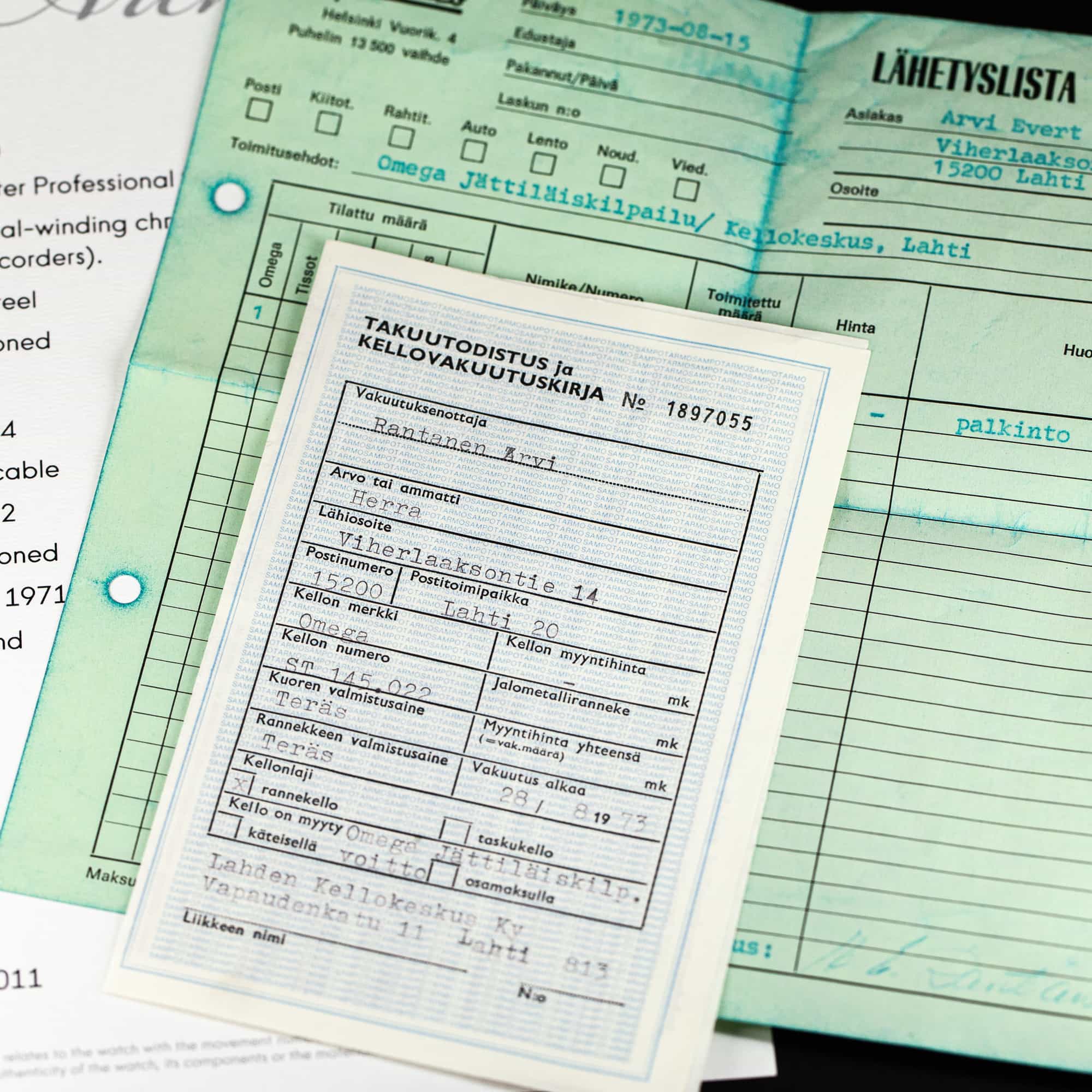 Tämä kello on Omegan vuonna 1973 järjestämästä maailmanlaajuisesta kilpailusta saatu palkinto. Kellon mukana tulee alkuperäiset Lahden kellokeskuksen takuupaperit ja kuitit, joissa on maininta tuosta kilpailusta. Mukana tulee myös Omega museon Extract from Archives-dokumentti joka vahvistaa, että kello on valmistettu 1971. Mukana tulee myös Uusi Suomi-lehden alkuperäinen artikkeli joka kertoo tuosta kilpailusta.