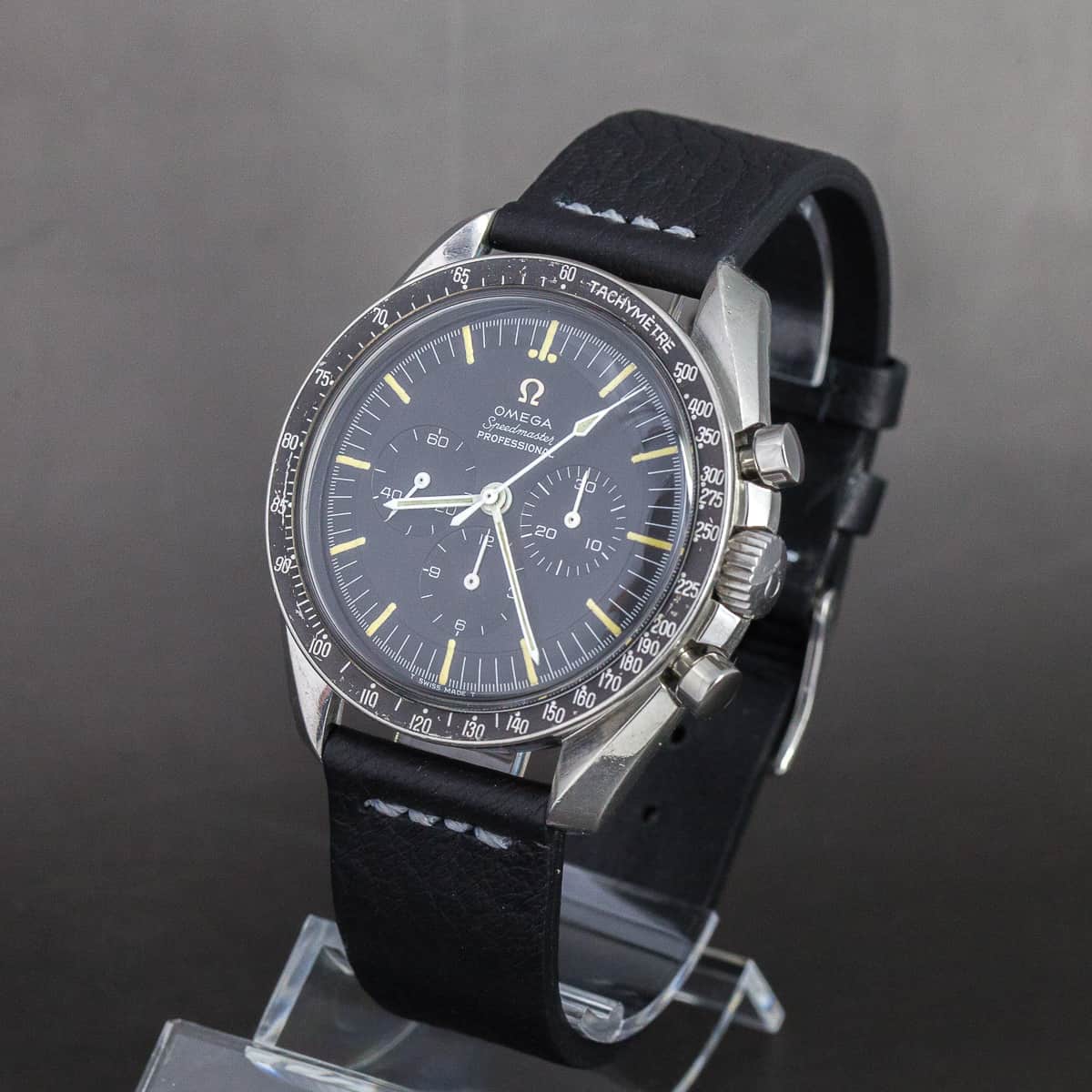 Harvinainen Omega Speedmaster ref.105.012-65 vuodelta 1965. Juuri täysin huollettu cal.321 koneisto. Kello on valmistettu koneiston sarjanumeron ja kuoren ref.numeron mukaan vuonna 1965.  Kuorta ei ole kiillotettu/hiottu huollon yhteydessä. Kellon koko 42mm ilman nuppia. Suomikello, kellon koko omistushistoria on tiedossa ja toimitetaan kellon mukana uudelle omistajalle.