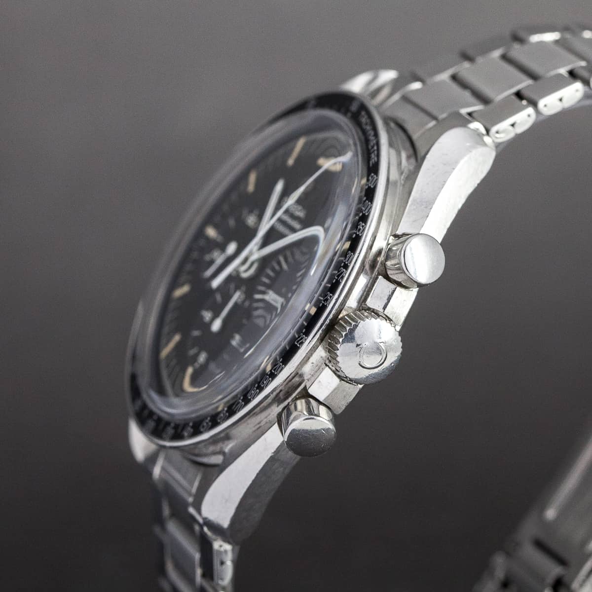 Lähes virheetön alkuperäinen DO90 lasisarja ja virheetön, kauniisti ikääntynyt porrastettu tritium kellotaulu. Alkuperäiset osoittimet. Ranneke on hieno Omegan ref.1039/516 jousto teräsranneke vuodelta 1971.
