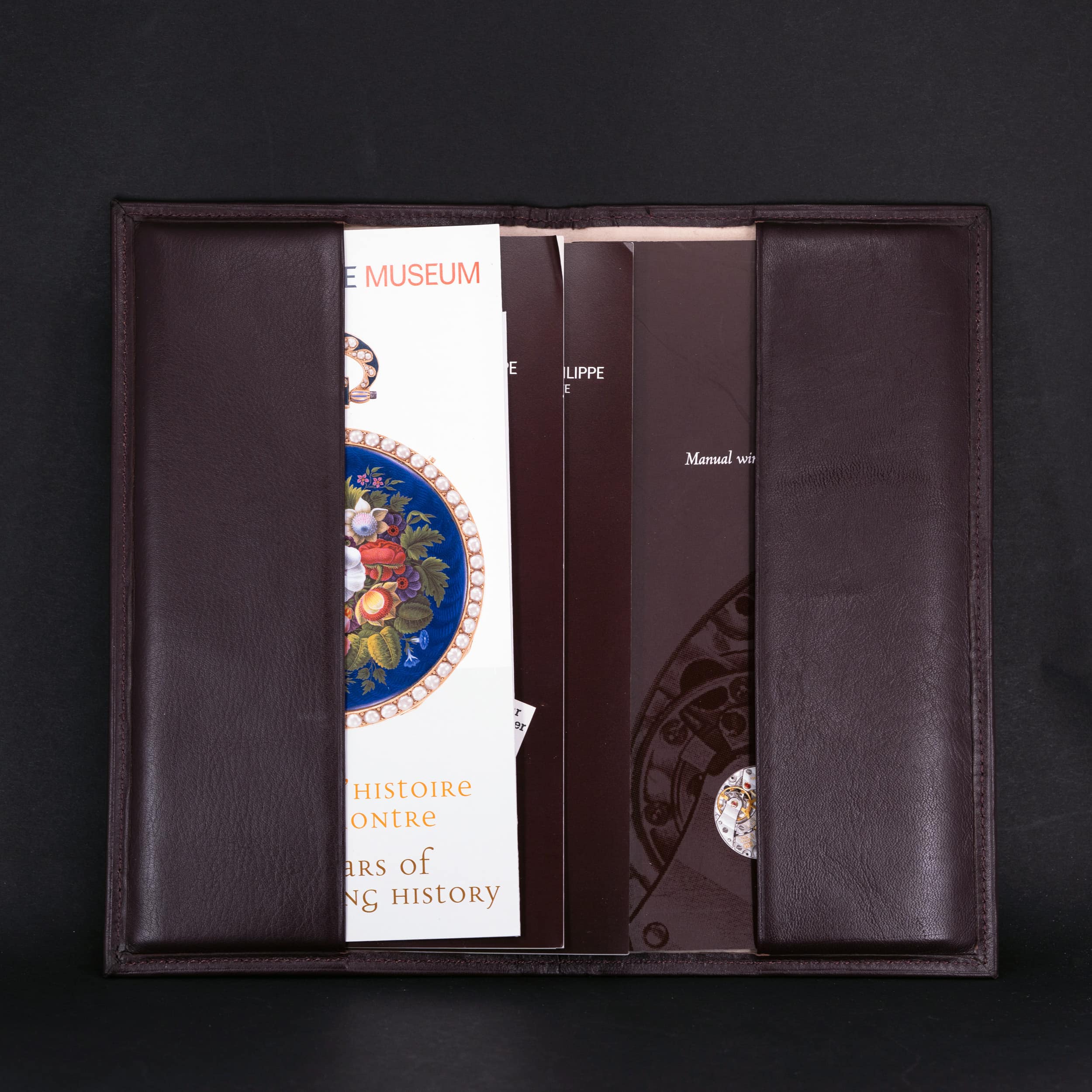 Kokonaisuuteen kuuluu seuraavat osat: Patek Philippe nahkainen kotelo, jossa on kellon käyttoohjeet, mallistoesite, Certificate-of-Authenthicity -todistus, alkuperäinen ostokuitti, suojapussi kellolle ja muita PP:n dokumentteja.