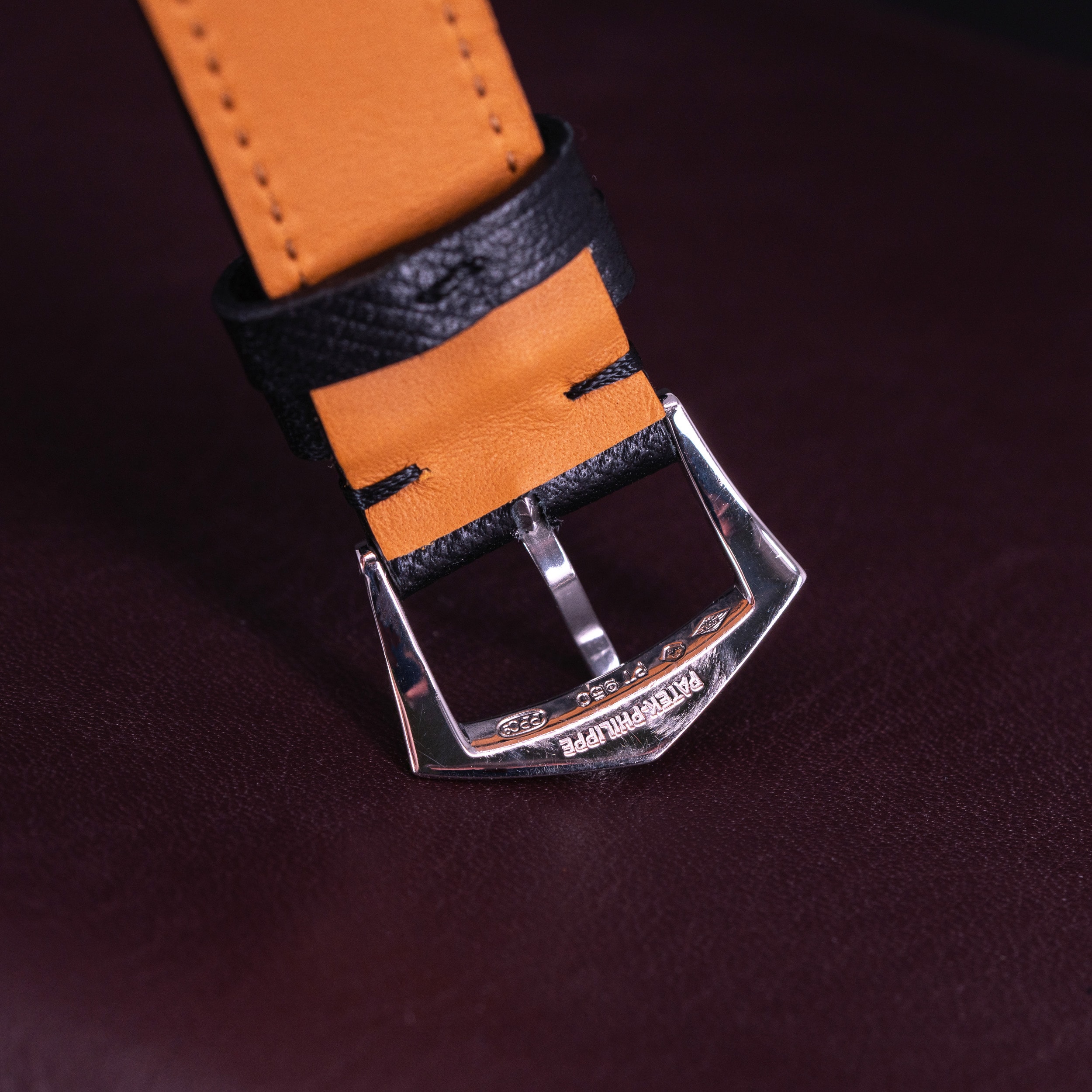 Kellon ohut nahkaranneke on meidän omasta mallistosta. Rannekkeessa on alkuperäinen PP: n platina solki. Mukana tulee myös PP:n oma alligaattori ranneke.