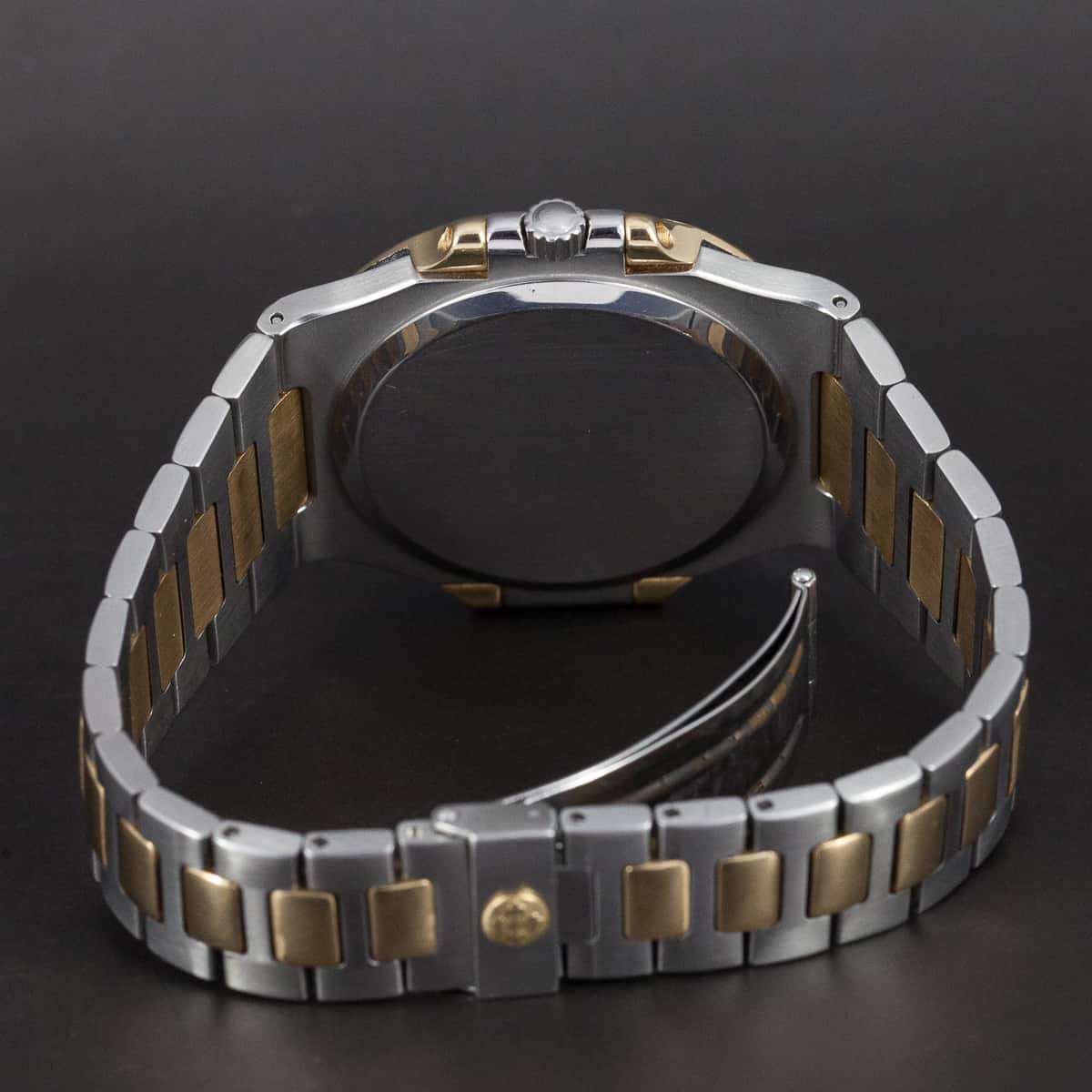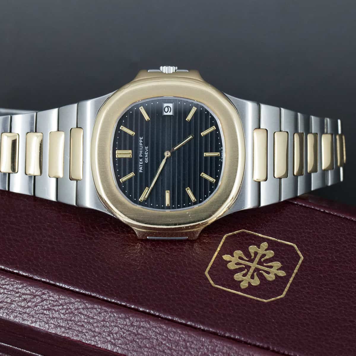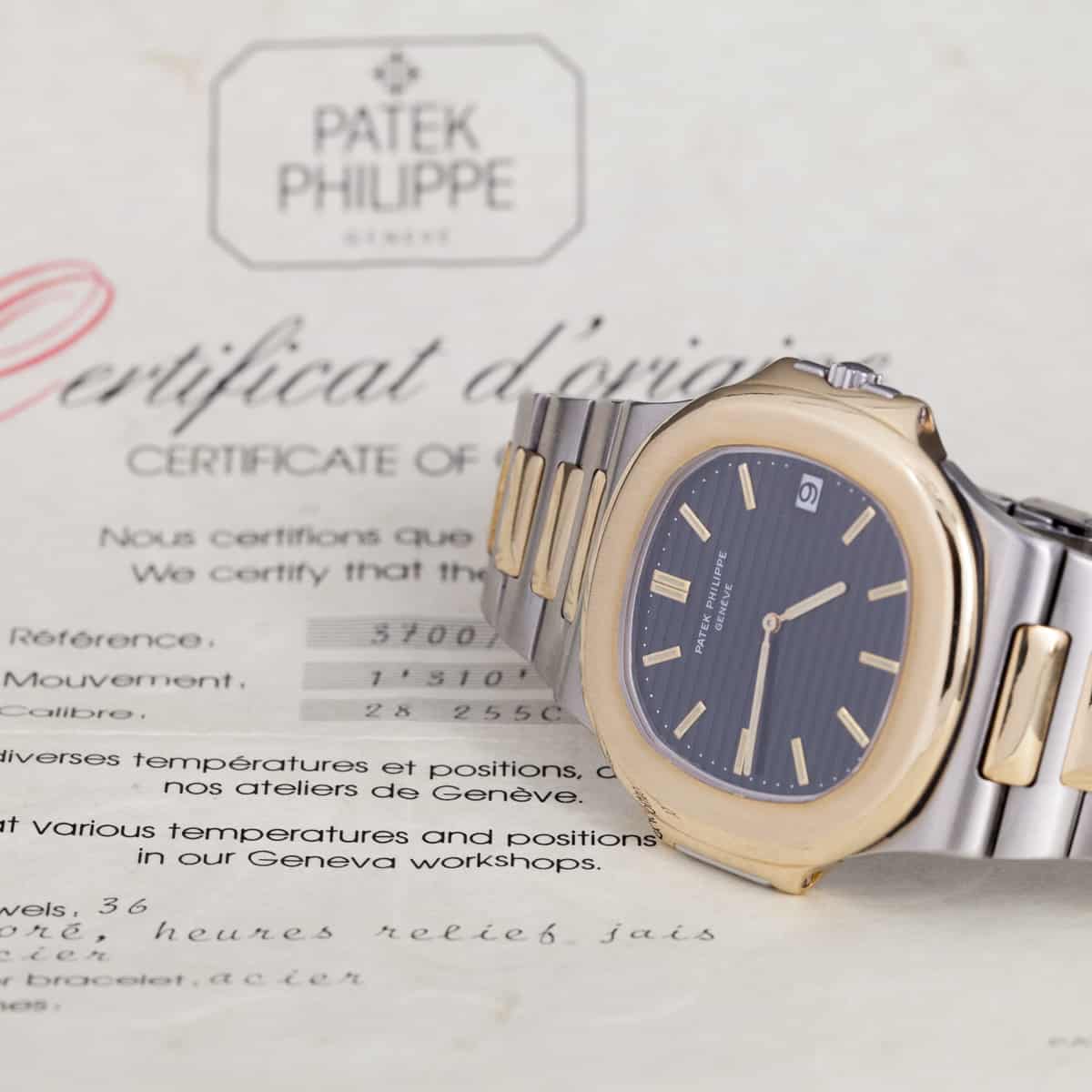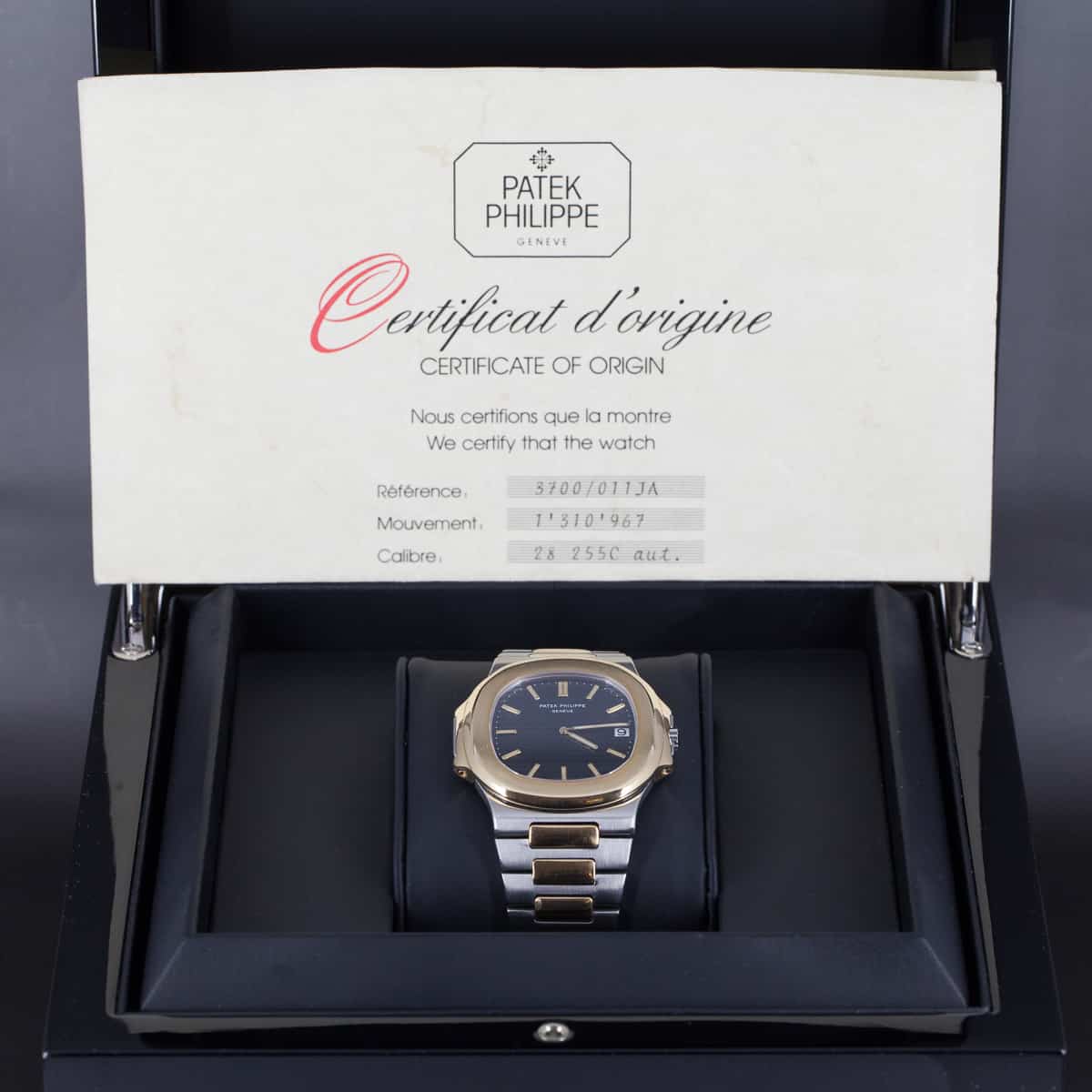 Hyvin harvinainen Patek Philippe Nautilus “Jumbo” ref. 3700-11AJ vuodelta 1985. Teräs-kulta malli kapenevalla rannekkeella (AJ). Mukana on alkuperäiset paperit ja kellolaatikko (ei alkuperäinen). Patek Philippe cal. 28.255C automaattikoneisto on testattu ja hyvässä kunnossa. Kello on vesitiivis. Kuoren koko on Jumbo mallissa 42mm x 38mm.