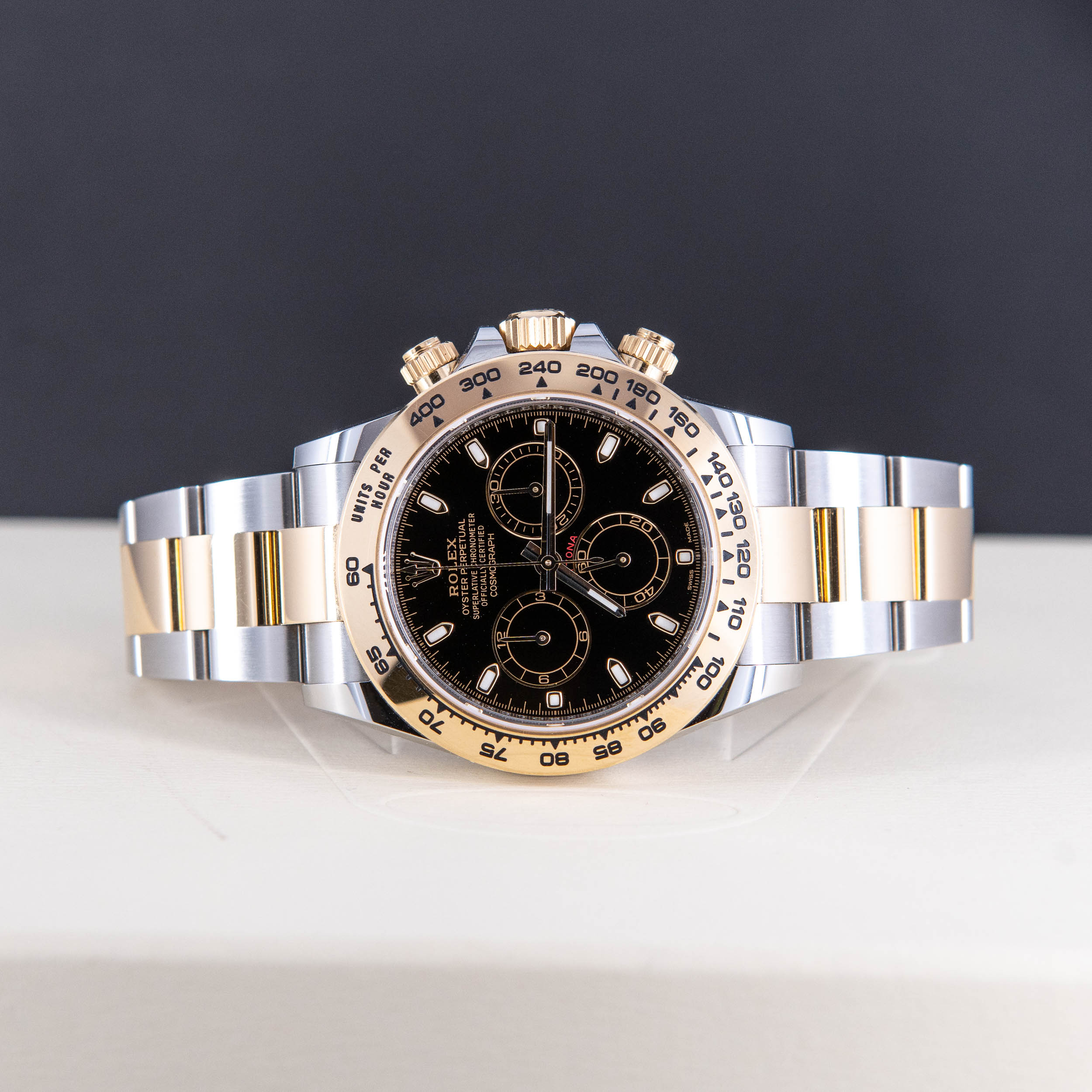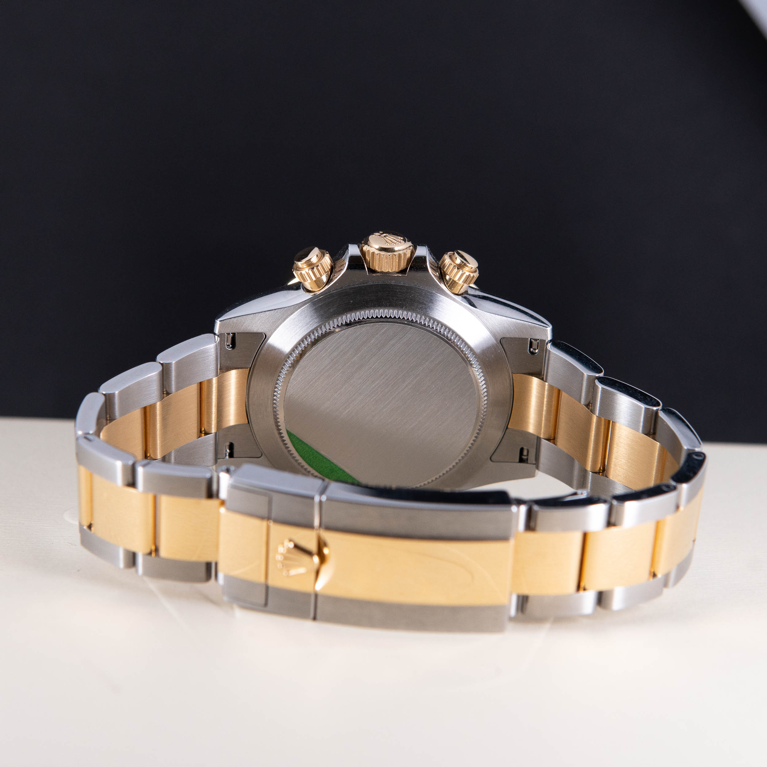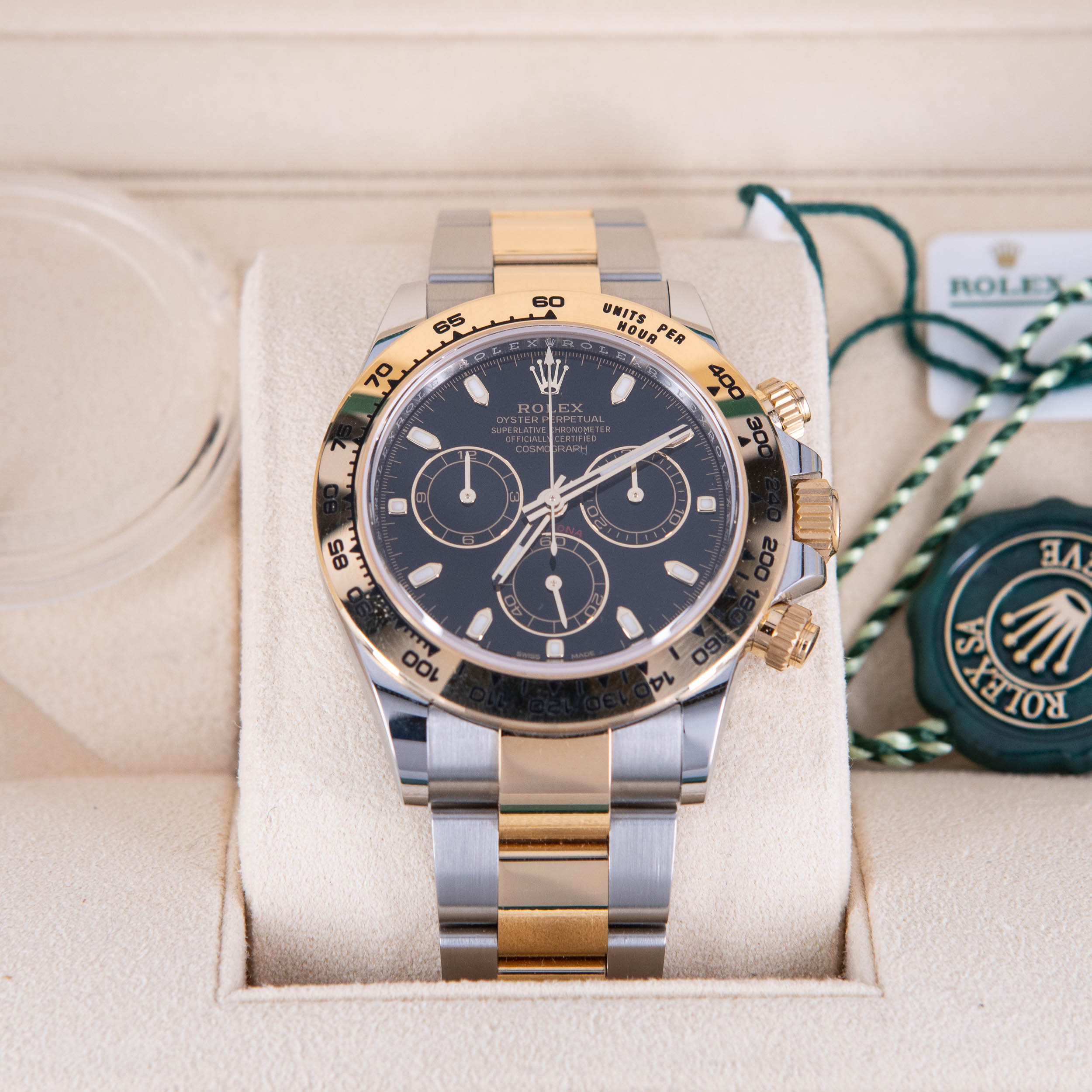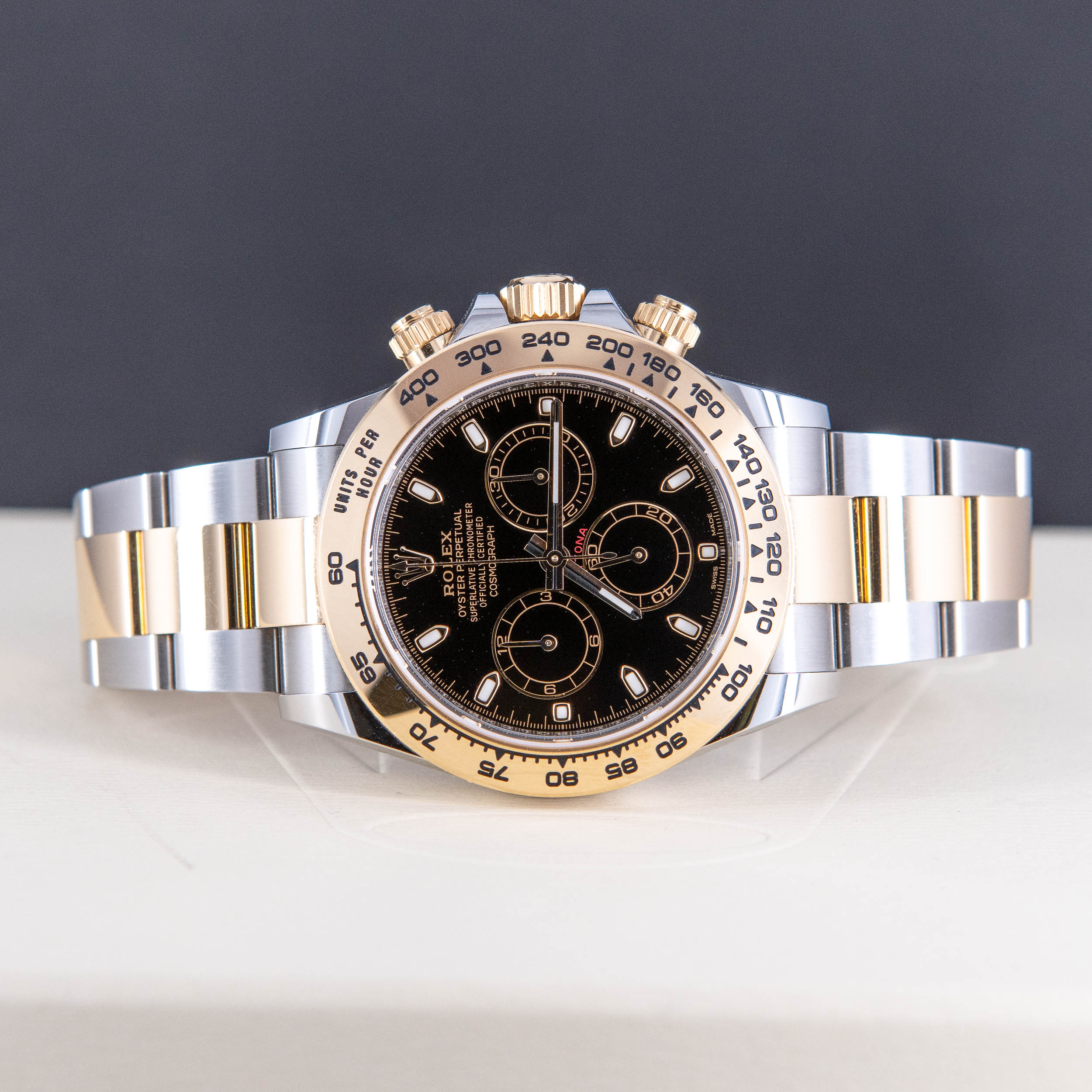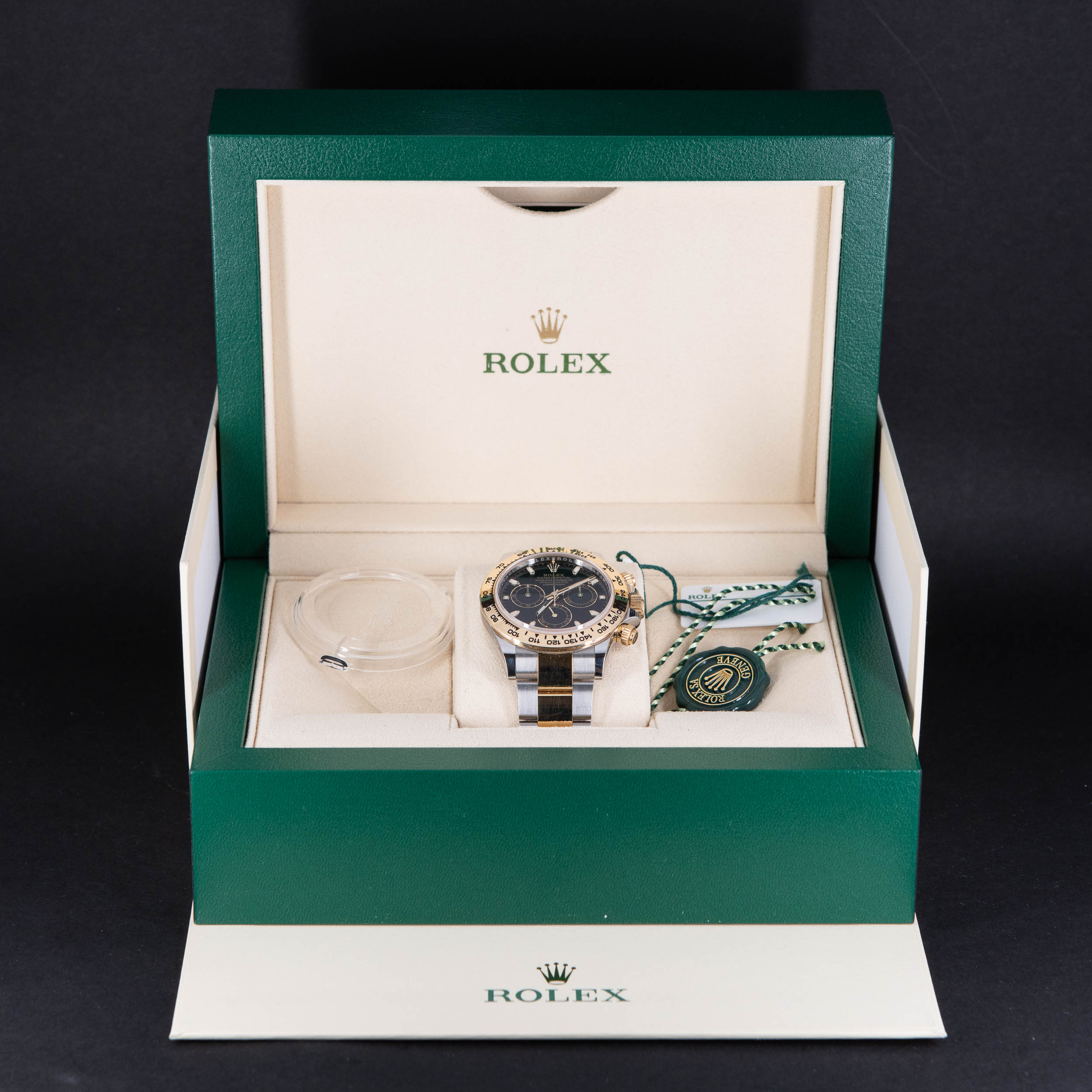 Rolex Oyster Perpetual Cosmograph Daytona 116503 vuodelta 2020. Full-set, suomikello, uudenveroinen, ostettu 11/2020. Musta Daytona Cosmograph kellotaulu chromalight loistemassalla ja kultaisilla osoittimille. Rolesor teräs-kulta kuori ja ranneke. Kellossa on Rolexin 4130 kronometri kronografikoneisto. Sukellustiivis. Kuoren koko on 40mm.