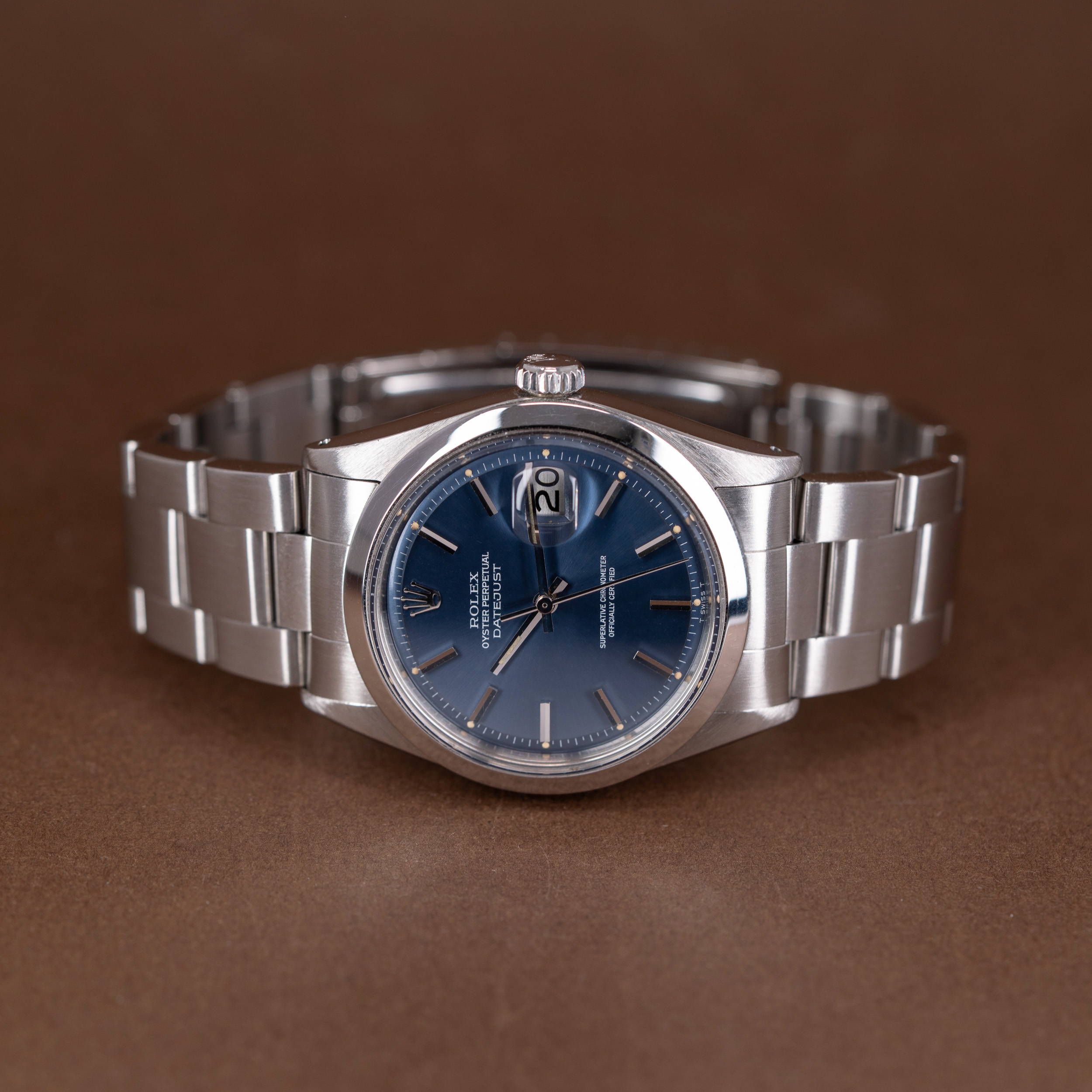 Harvinaisen kaunis Rolex Oyster Perpetual Datejust ref. 1600. Sarjanumeron 395xxxx mukainen valmistusvuosi on 1975.