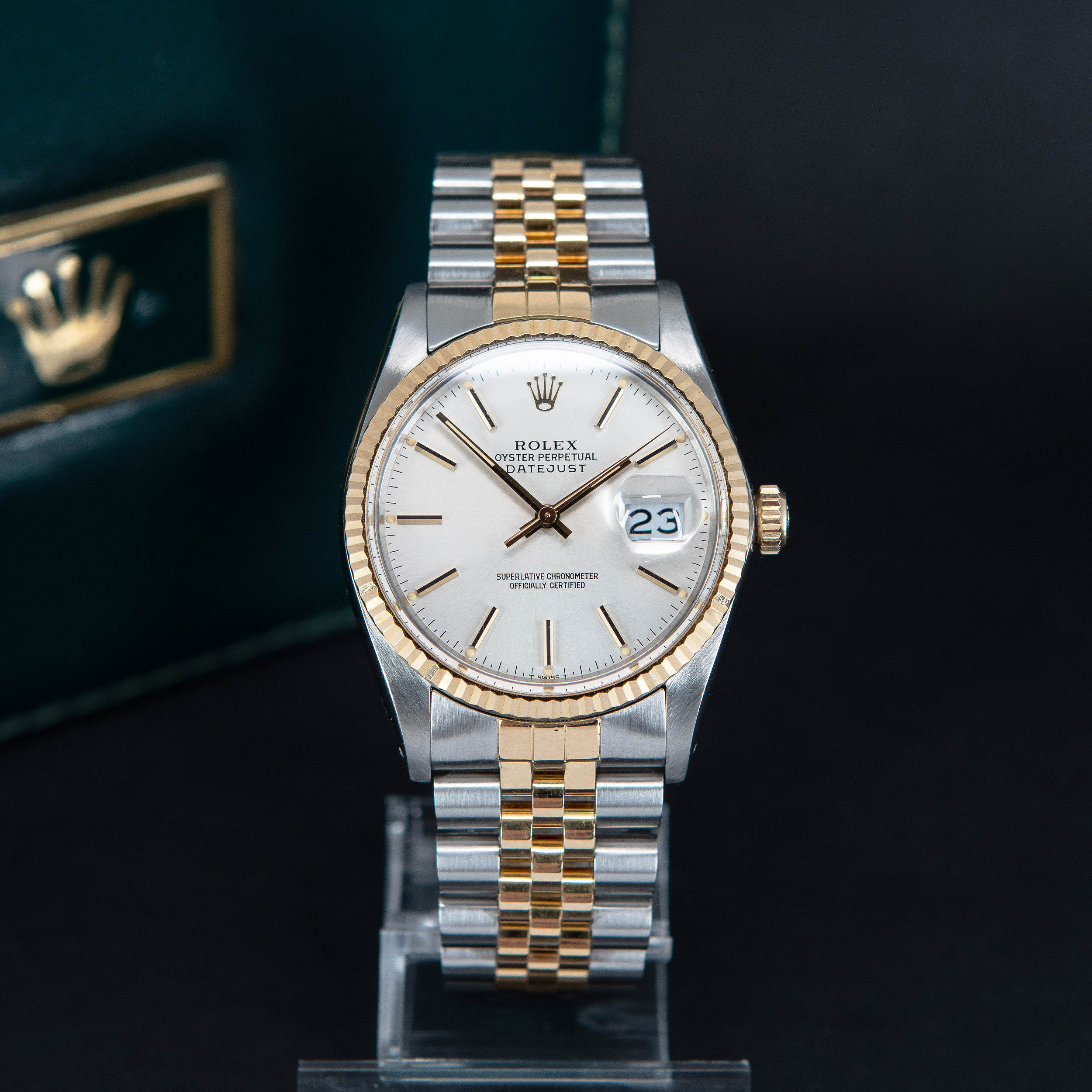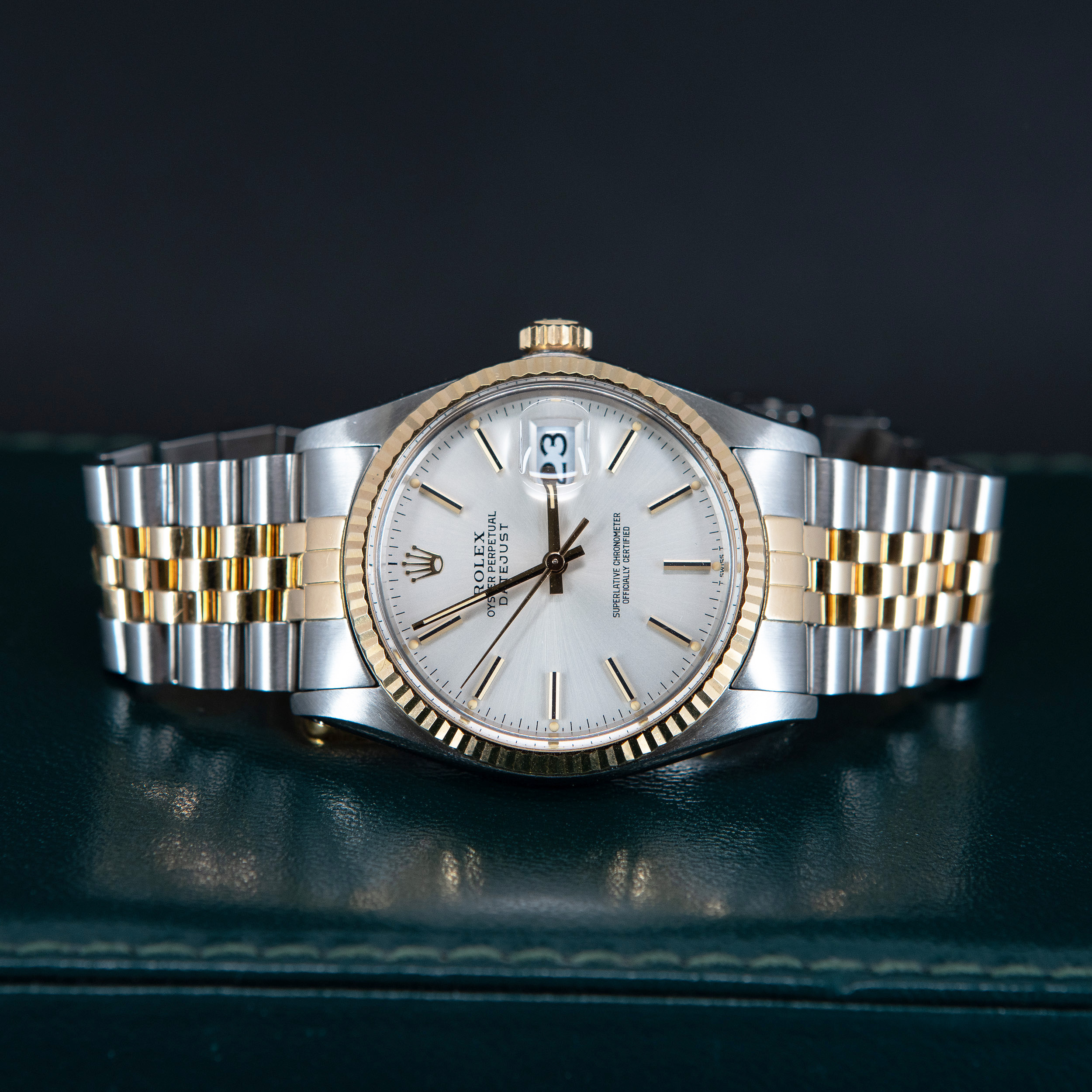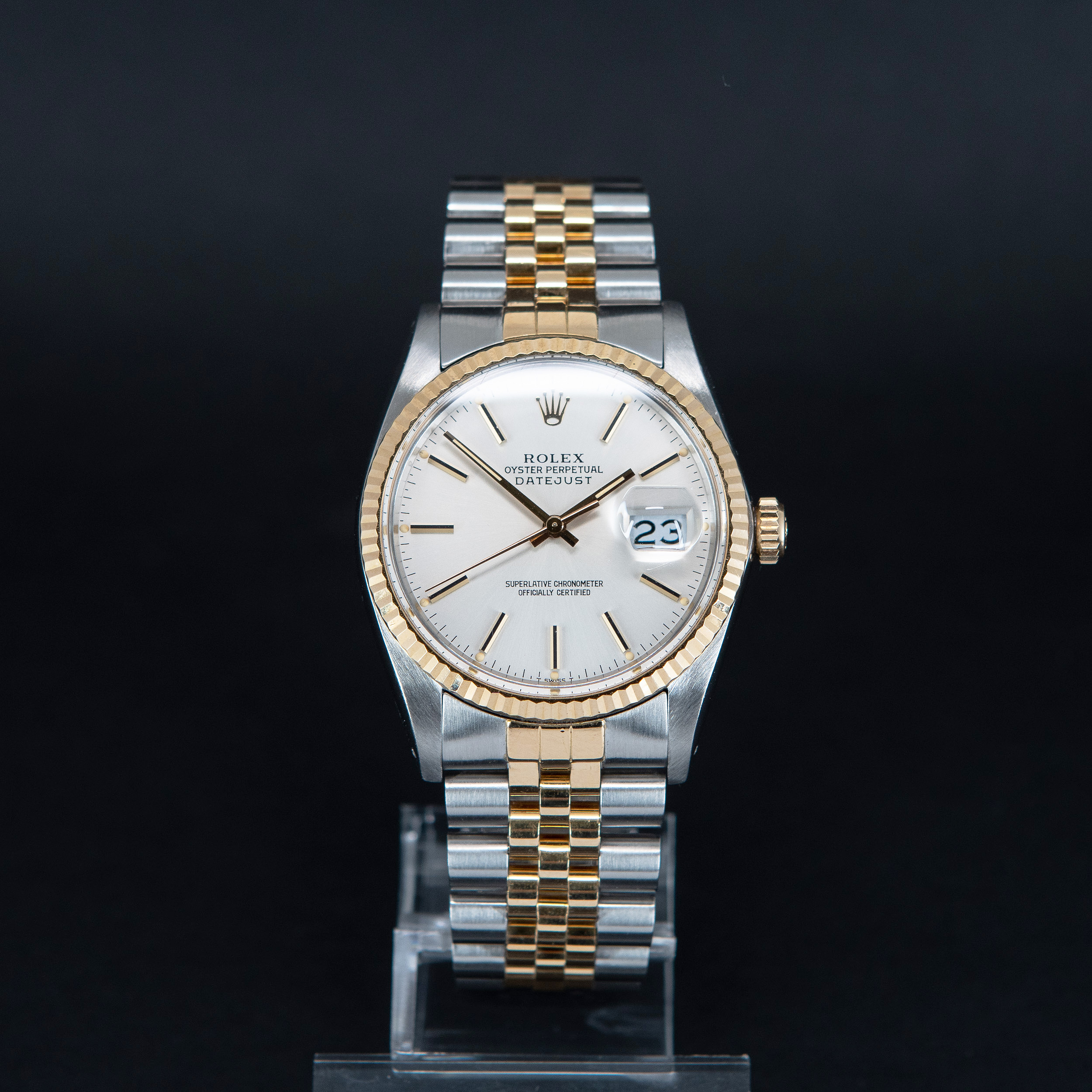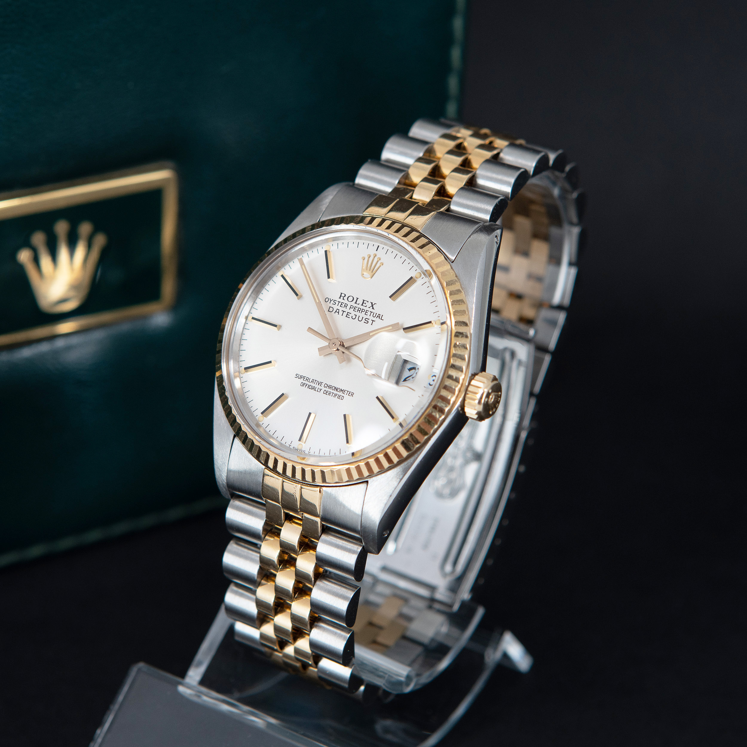 Rolex Oyster Perpetual Datejust 16013 vuodelta 1984. Full-set, suomikello. Erittäin hyväkuntoinen ja kunnostettu yksilö. Virheetön hopeoitu tritium kellotaulu ja -osoittimet. Hyväkuntoinen fluted 18k bezel ja teräskuori. Kello on yhä vesitiivis, testattu +3.0/-0,7bar. Kuoren koko on 36mm.