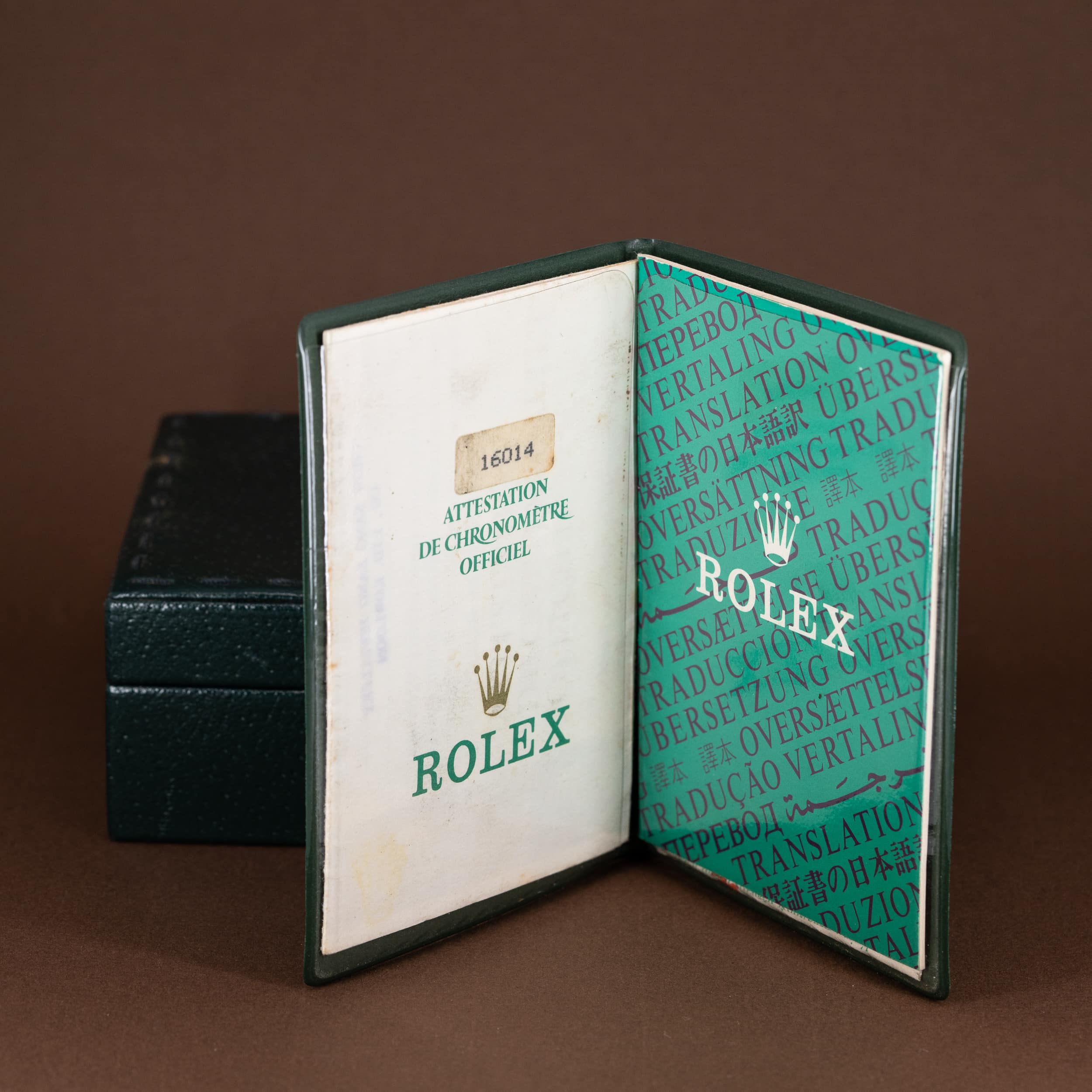 Kellon mukana tulee alkuperäinen Rolexin kellolaatikko, vihreä dokumenttitasku, kronometritodistus vuodelta 1987 sekä käännösvihko.