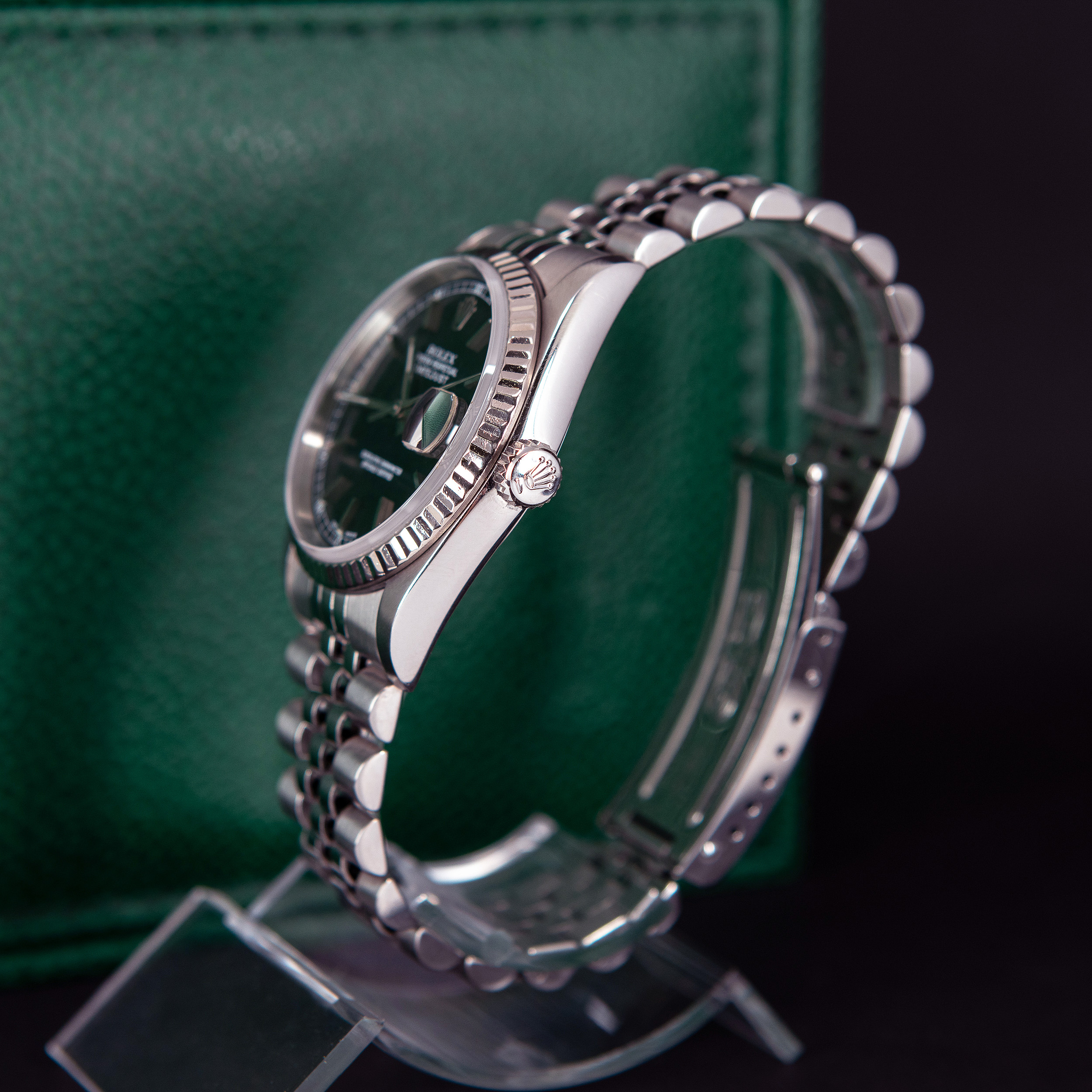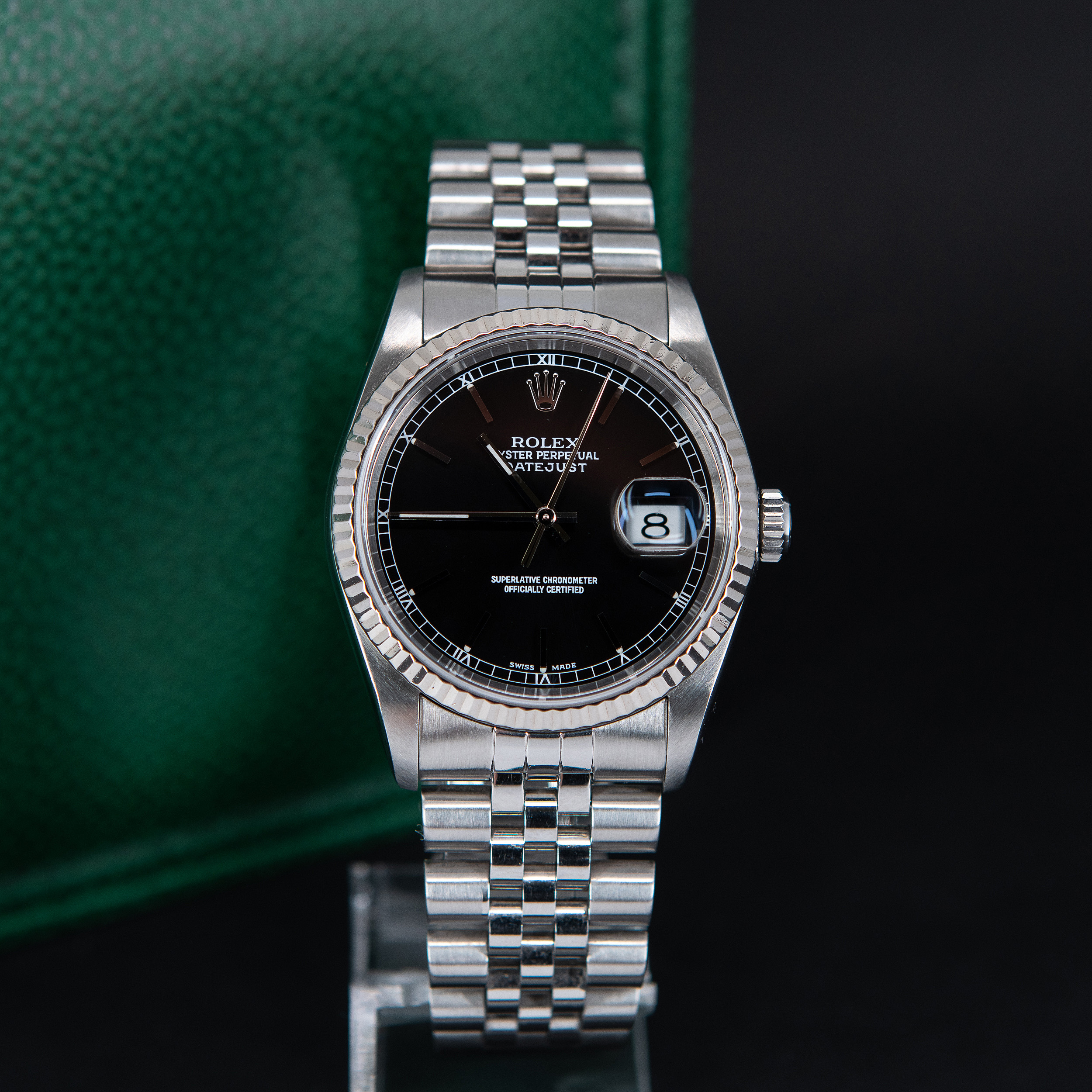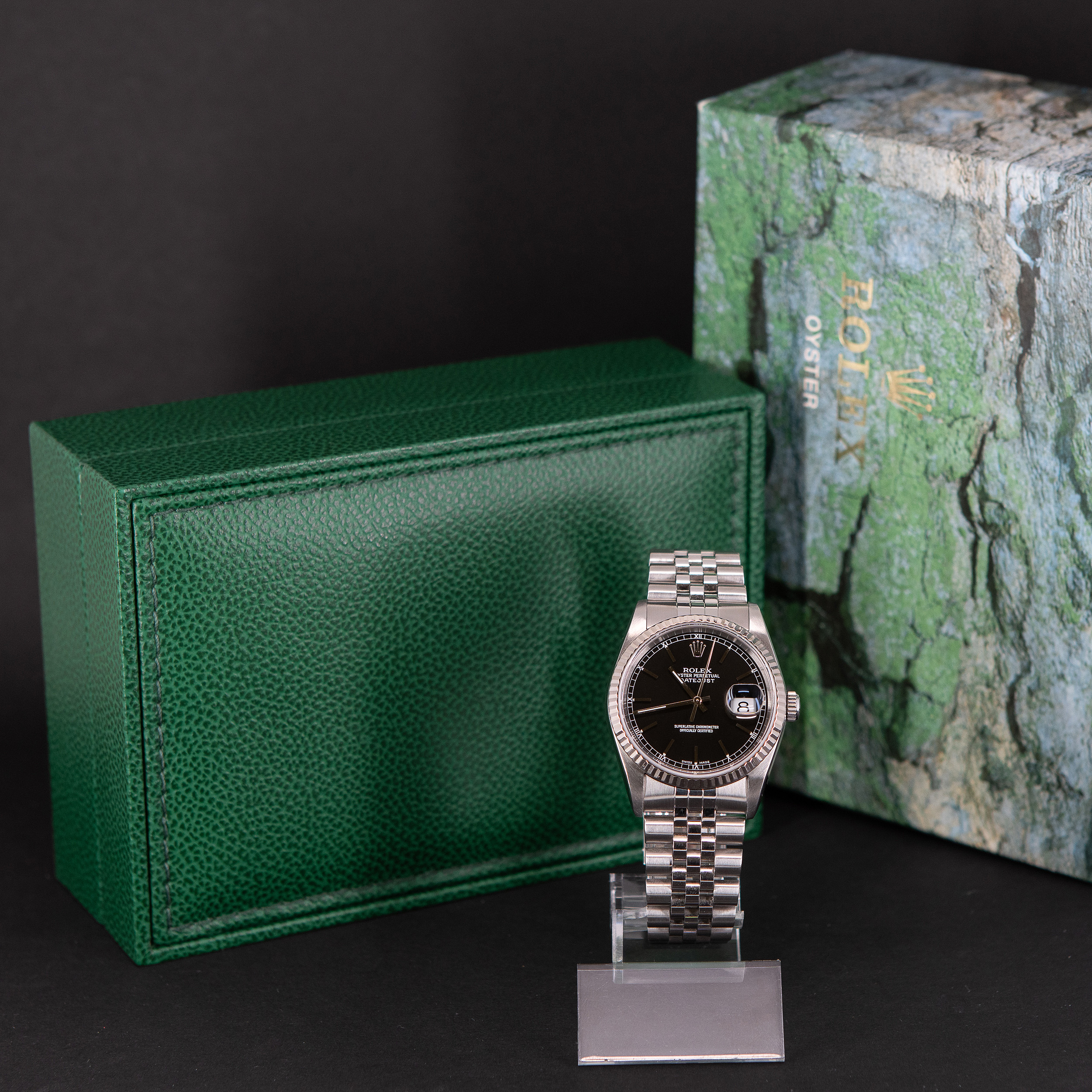 Rolex Oyster Perpetual Datejust 16234. Y-sarjaa vuodelta 2001-2002. Virheetön musta luminova kellotaulu ja -osoittimet. Valkokultainen lasisarja. Teräskuori on hyväkuntoinen. Kuori on vesitiivis, testattu +10/-0,7bar. Kuoren koko on 36mm.