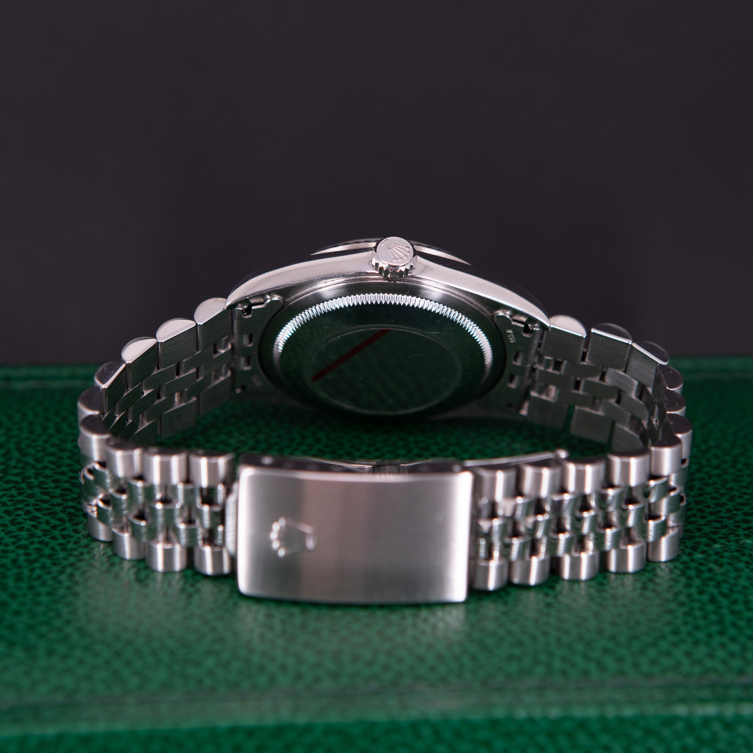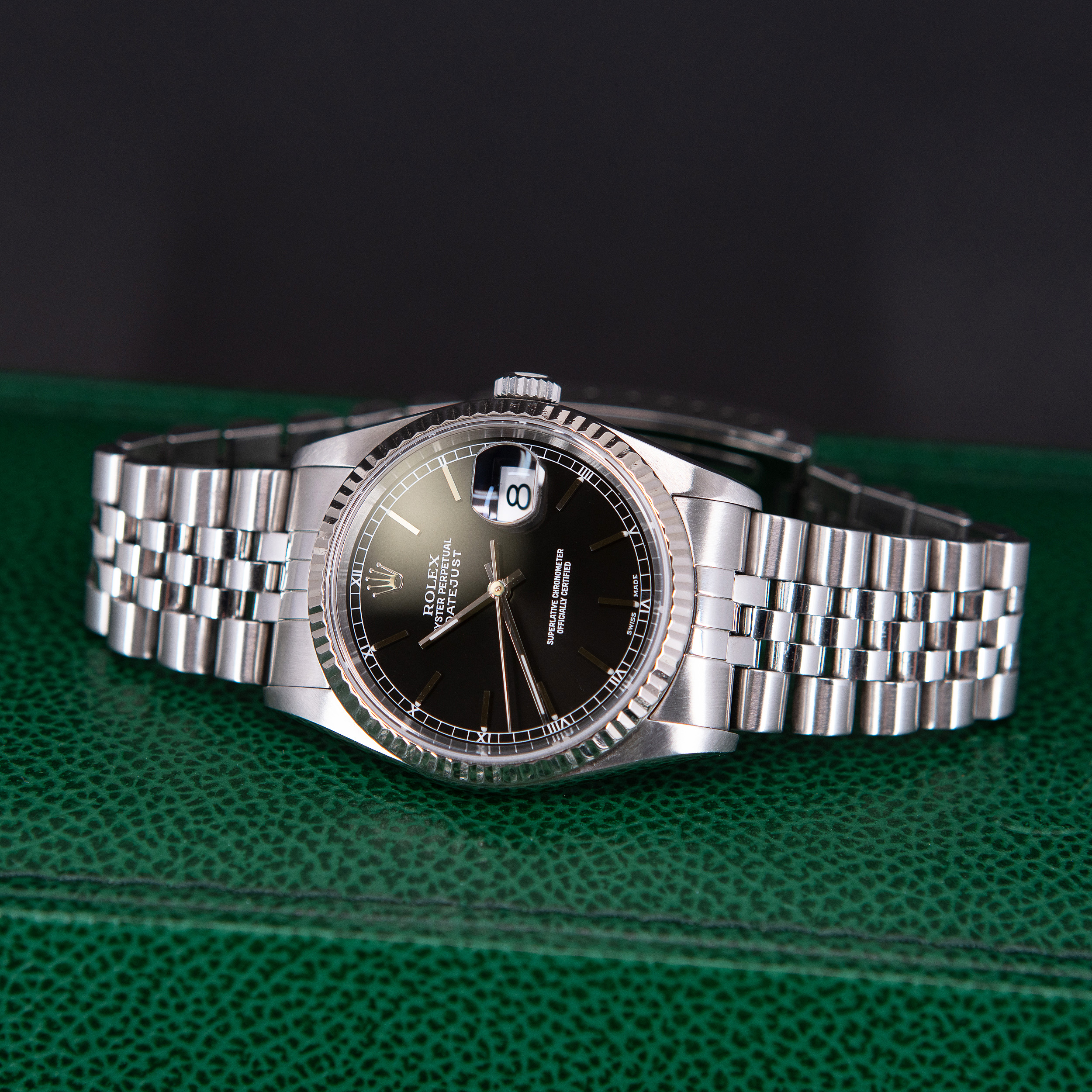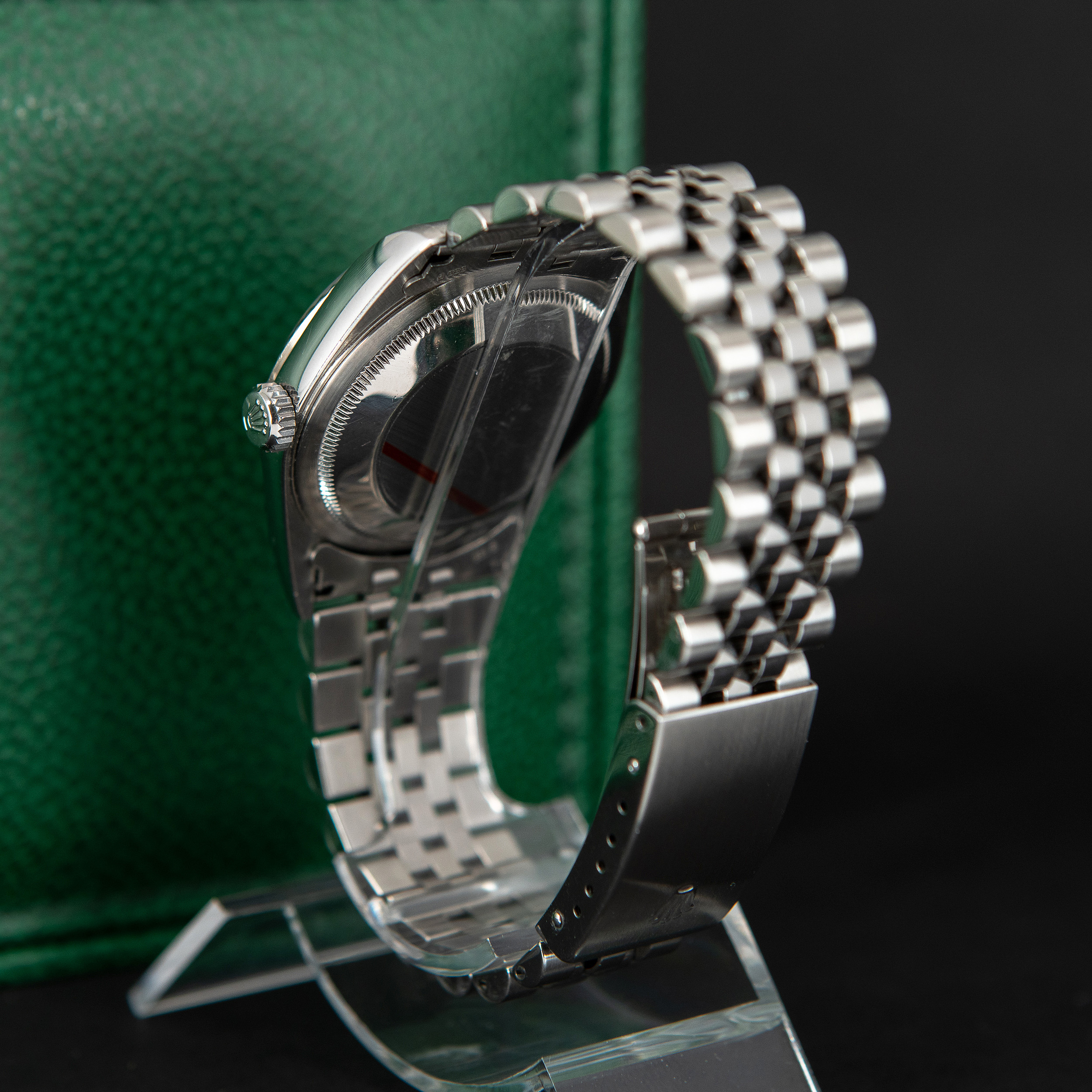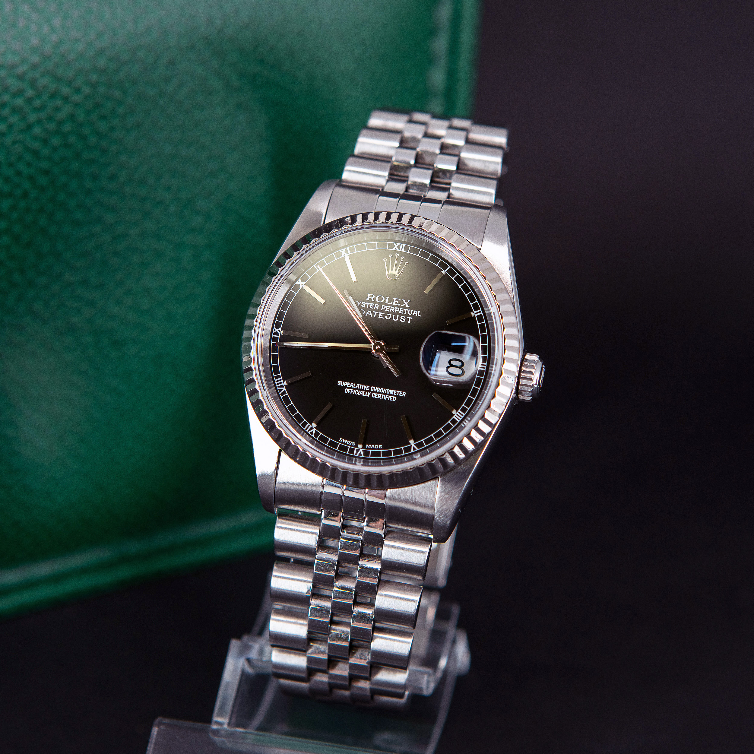 Rolex Oyster Perpetual Datejust 16234. Y-sarjaa vuodelta 2001-2002. Virheetön musta luminova kellotaulu ja -osoittimet. Valkokultainen lasisarja. Teräskuori on hyväkuntoinen. Kuori on vesitiivis, testattu +10/-0,7bar. Kuoren koko on 36mm.