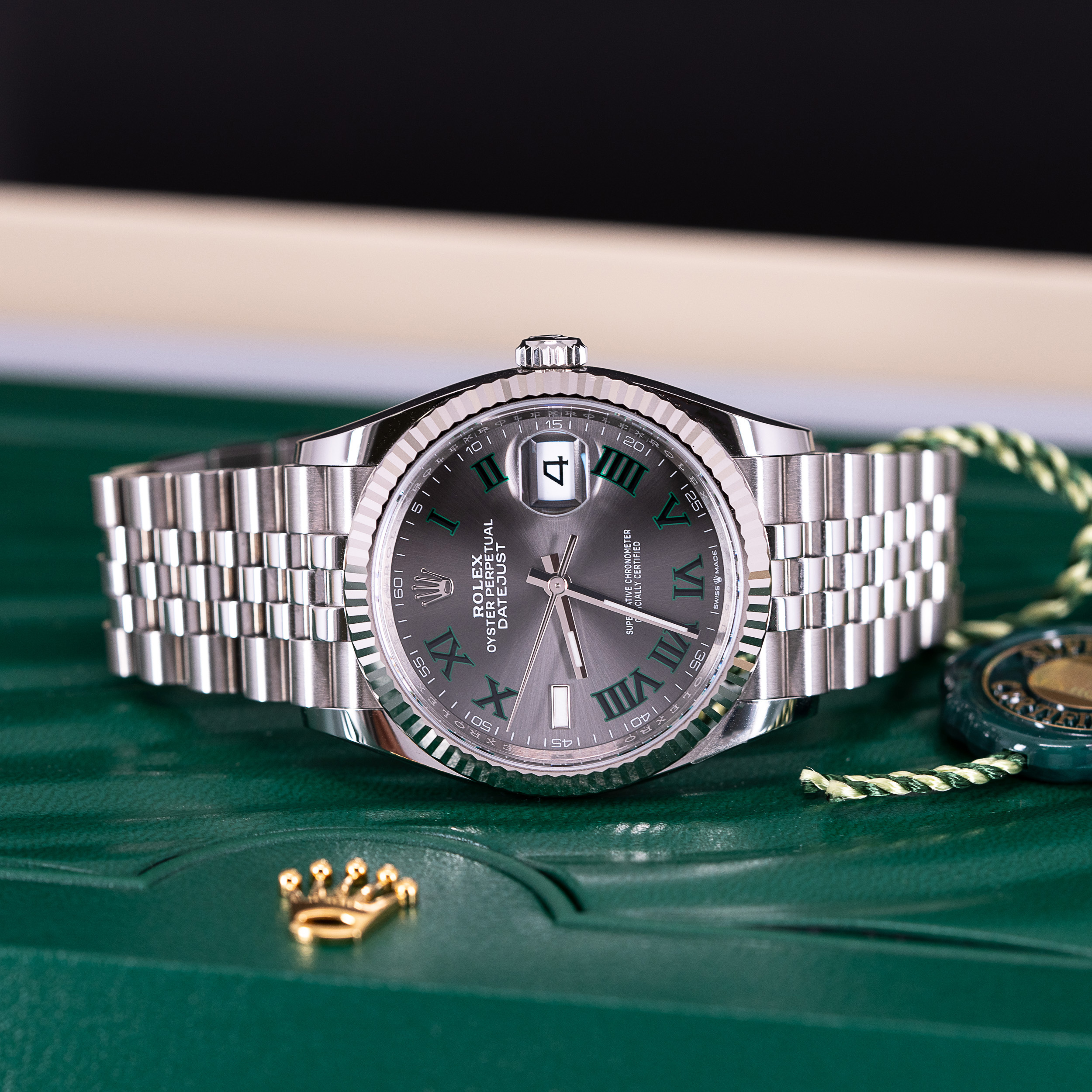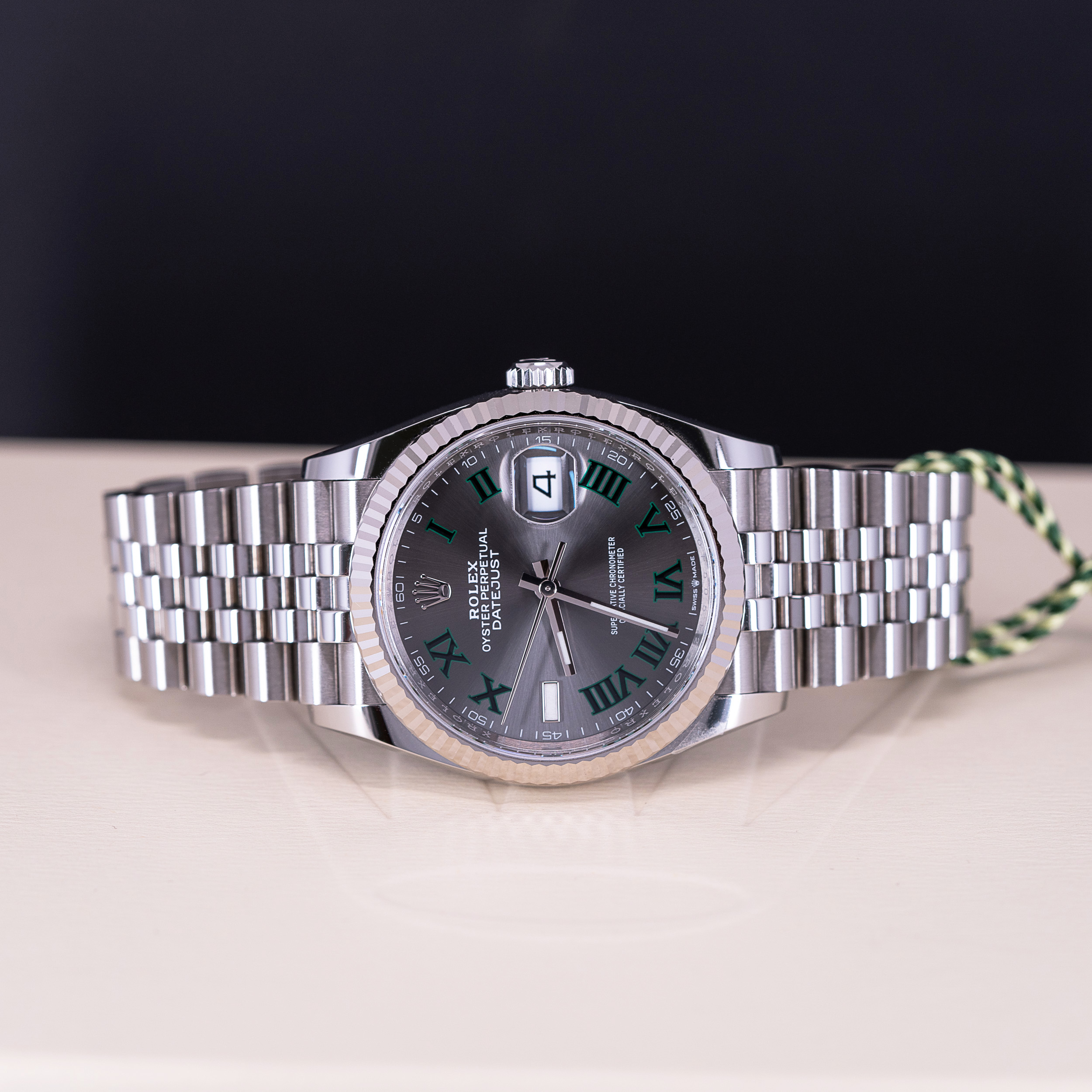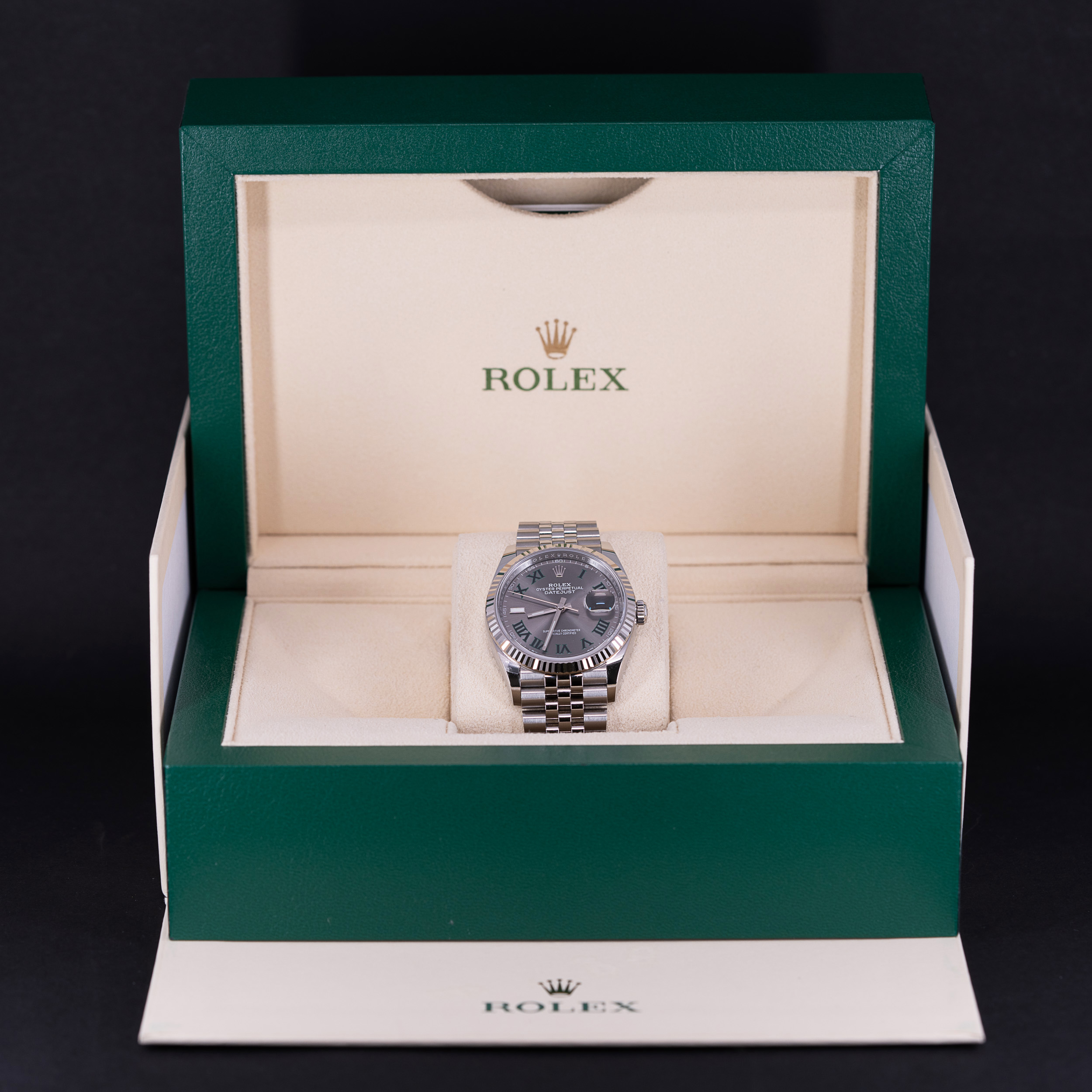 Hyvin vähän käytetty Rolex Oyster Perpetual Datejust 36 ref.126234 vuodelta 2022. Full-set, kaikki laatikot ja paperit. Kellossa on kaunis harmaa ”Wimbledon” kellotaulu roomalaisilla numeroilla. Osoittimissa on Chromalight-loistemassa. Kuoren koko on 36mm.