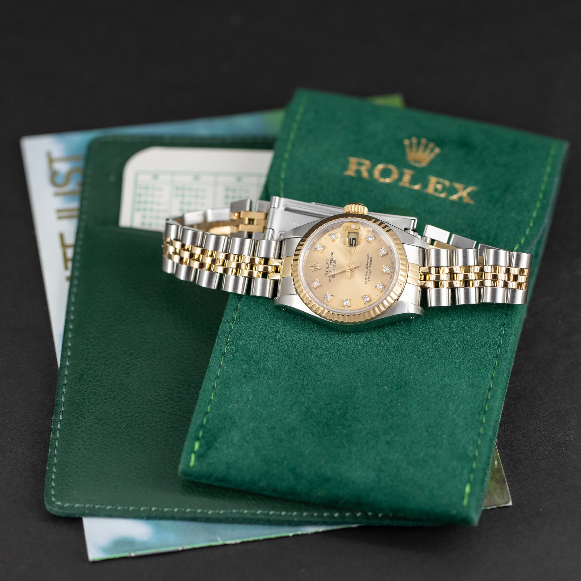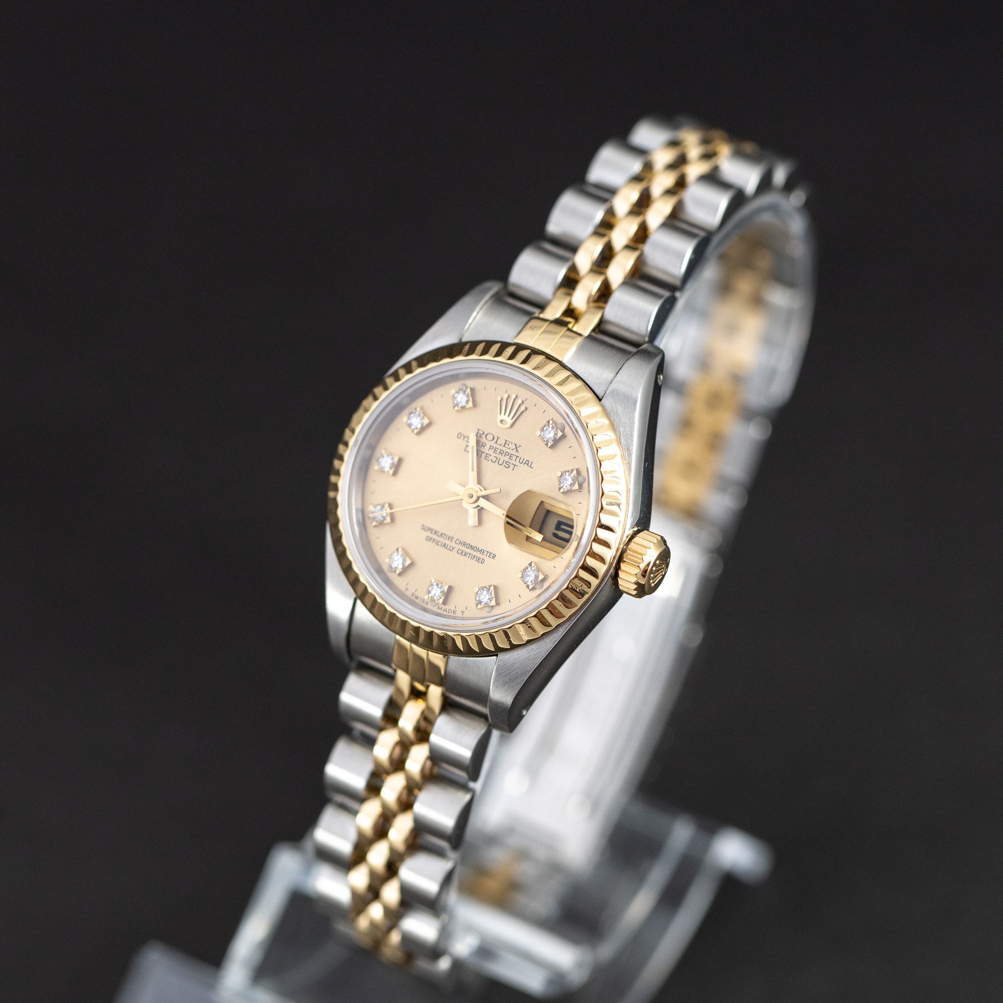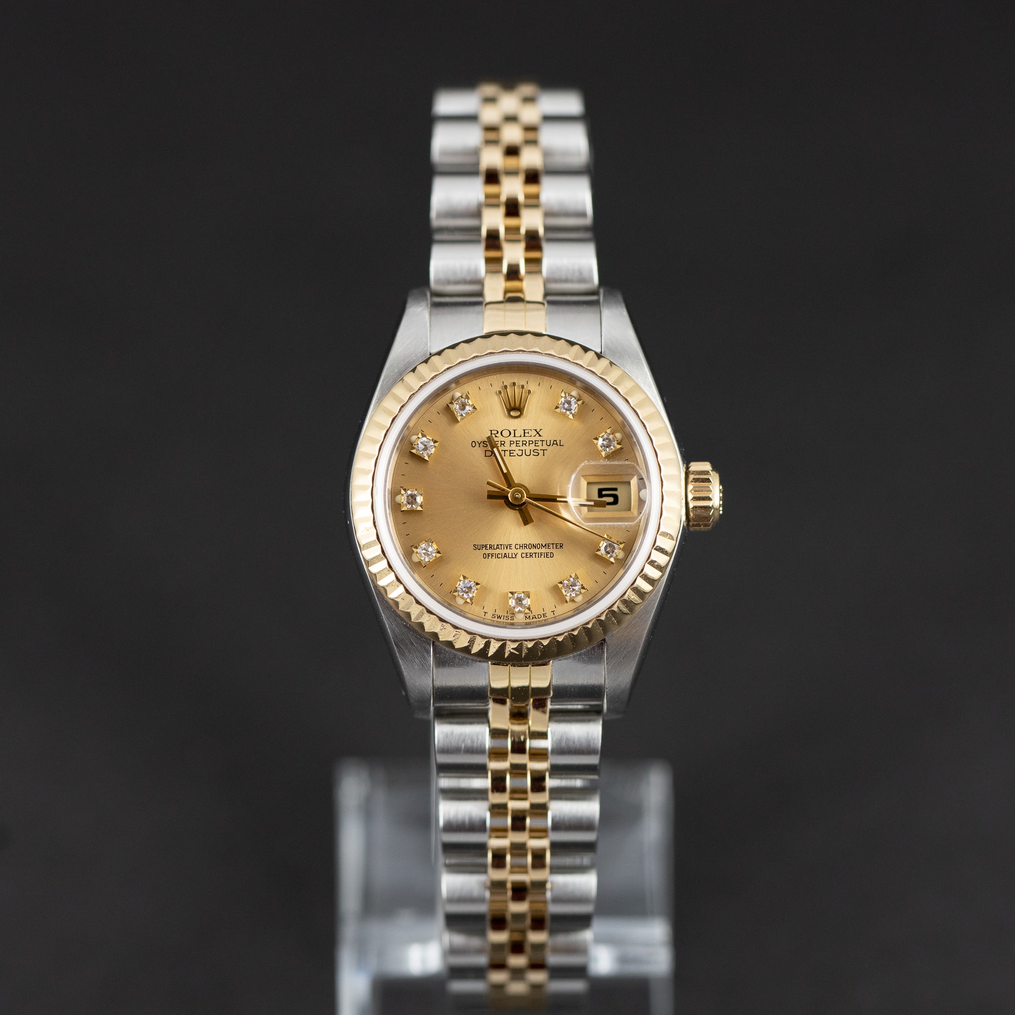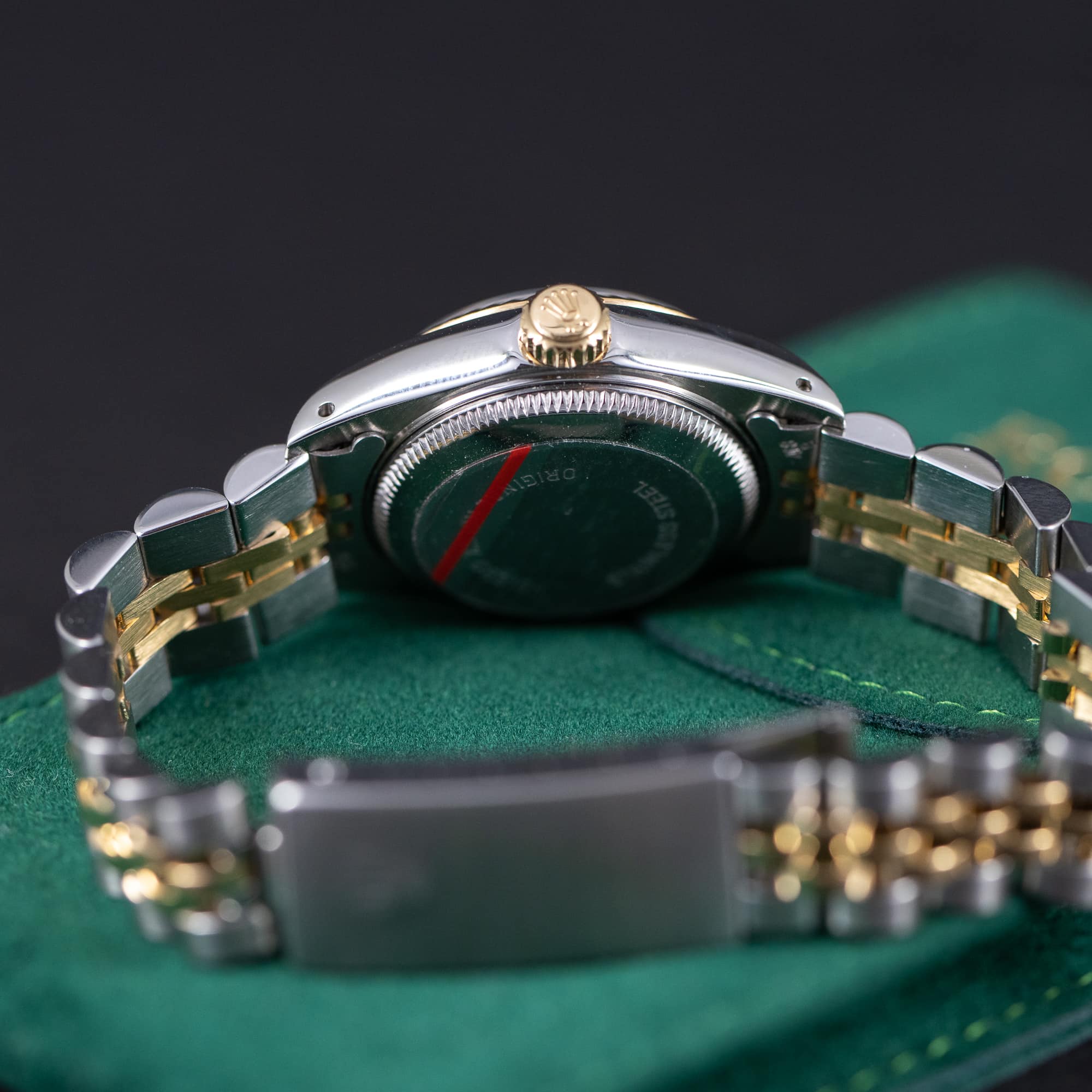 Rolex Oyster Perpetual Datejust Lady 69173 vuodelta 1987. Juuri täydellisesti kunnostettu kokonaisuus. Teräs-kulta kuori ja Jubilee ranneke. Alkuperäinen Rolexin timanttitaulu ja alkuperäiset tritium osoittimet. Koneisto on täysin kunnostettu. Kuoren koko on 26mm.
