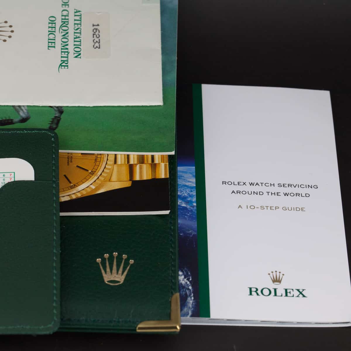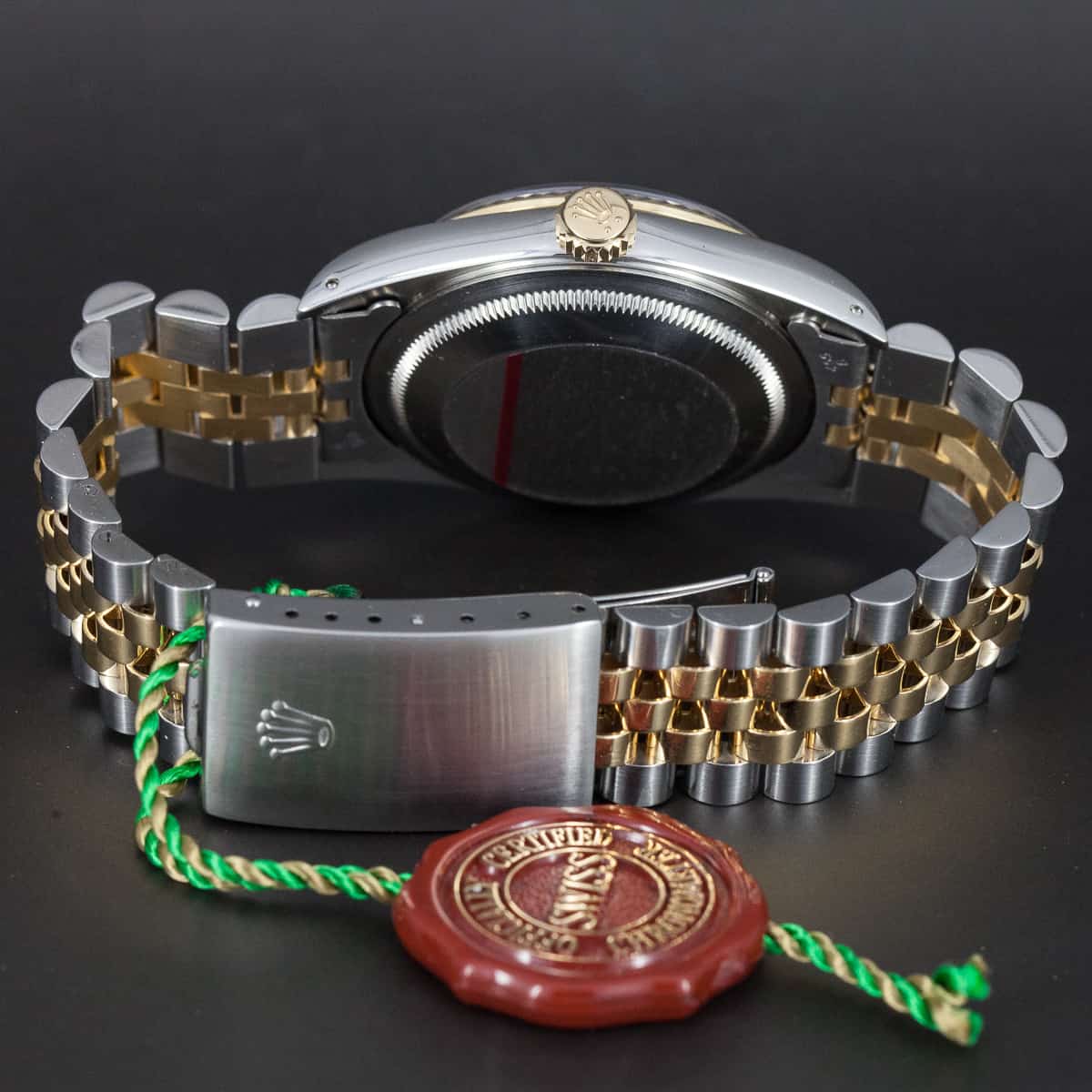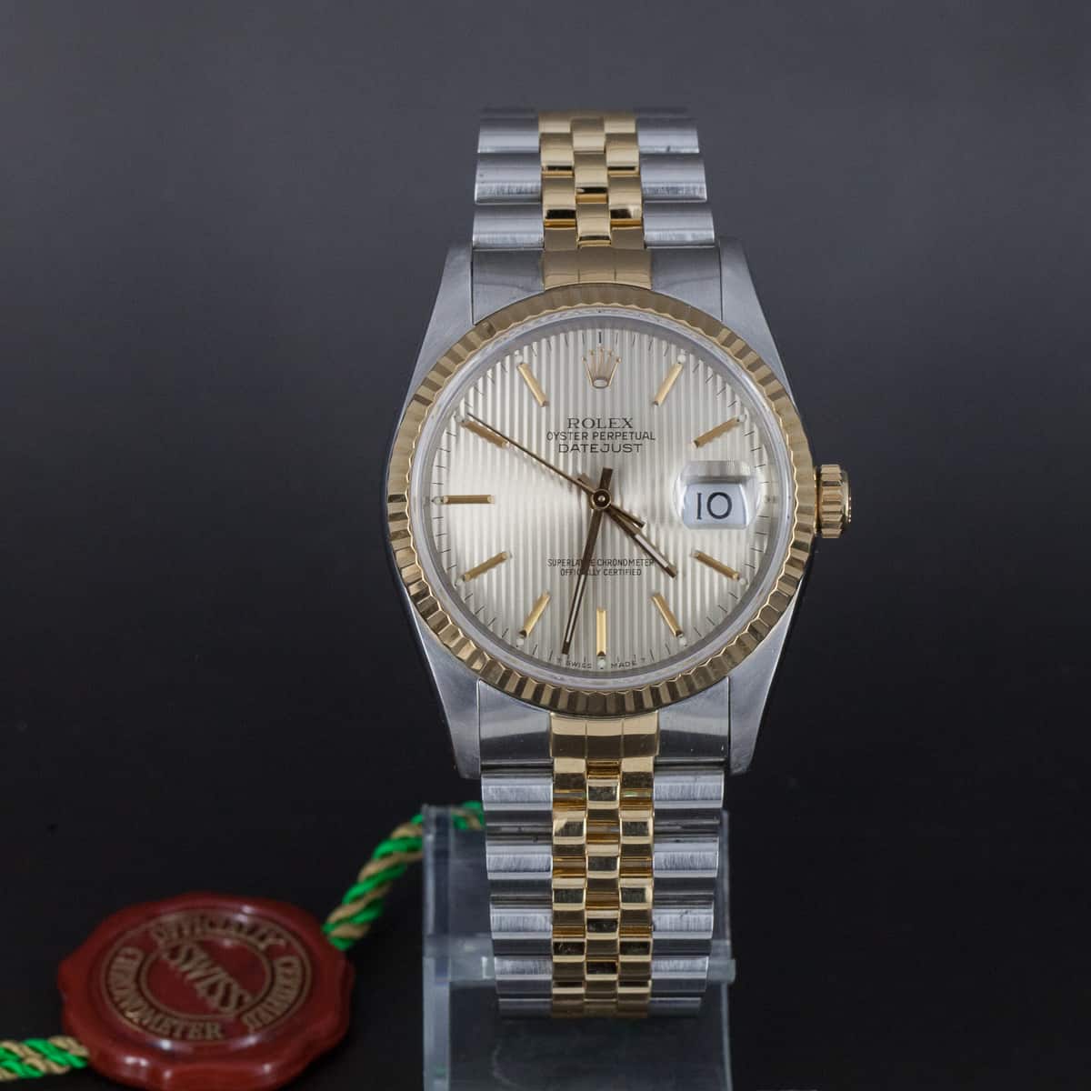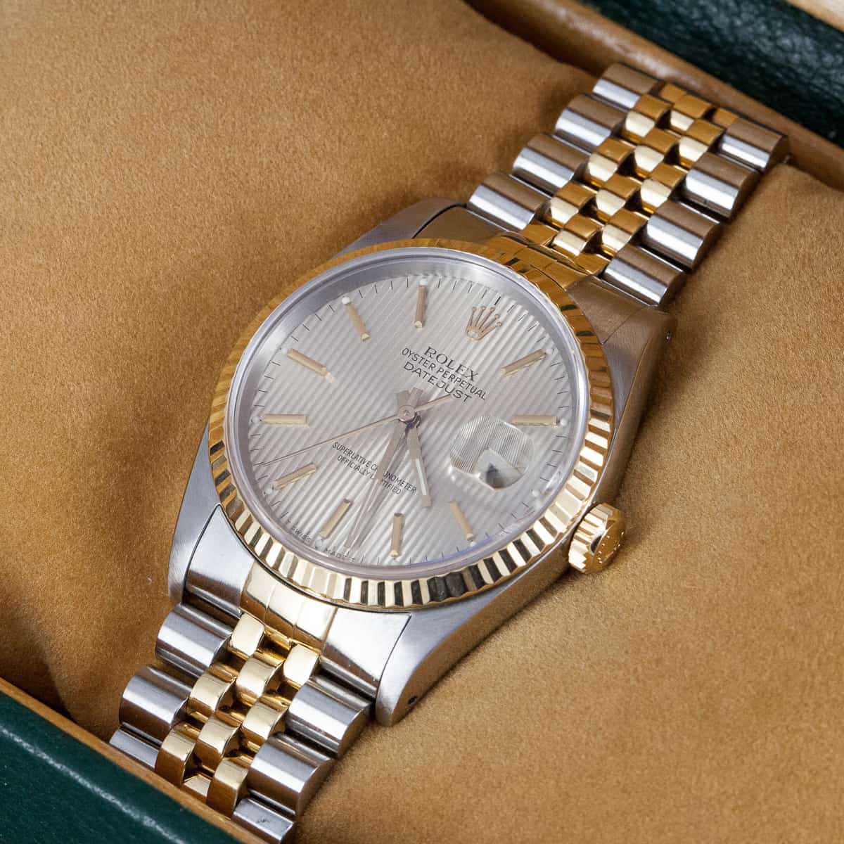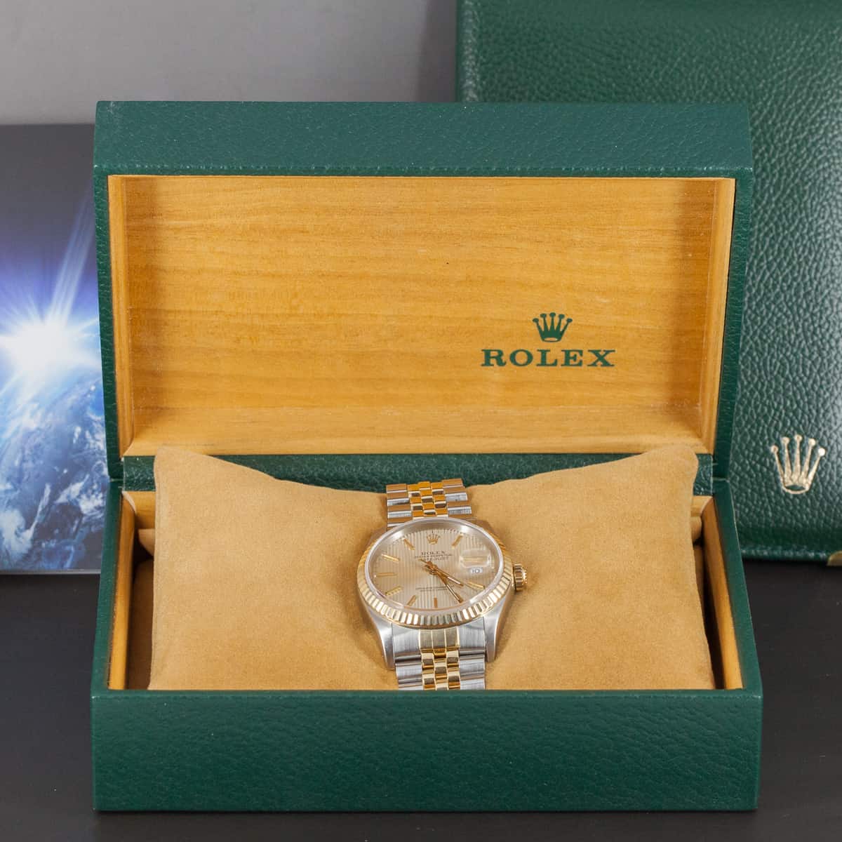 Rolex Oyster Perpetual Datejust ref.16233 vuodelta 1990. Teräs-kulta malli kultaisella kehällä. Tapestry mallinen kellotaulu. Lähes käyttämätön ja juuri täysin maahantuojalla kunnostettu kokonaisuus. Rolexin oma cal. 3135 automaattikoneisto. Uudenveroinen terä-kulta Jubilee ranneke. Kaikki boksit ja paperit (full set). Kuoren koko 36mm.