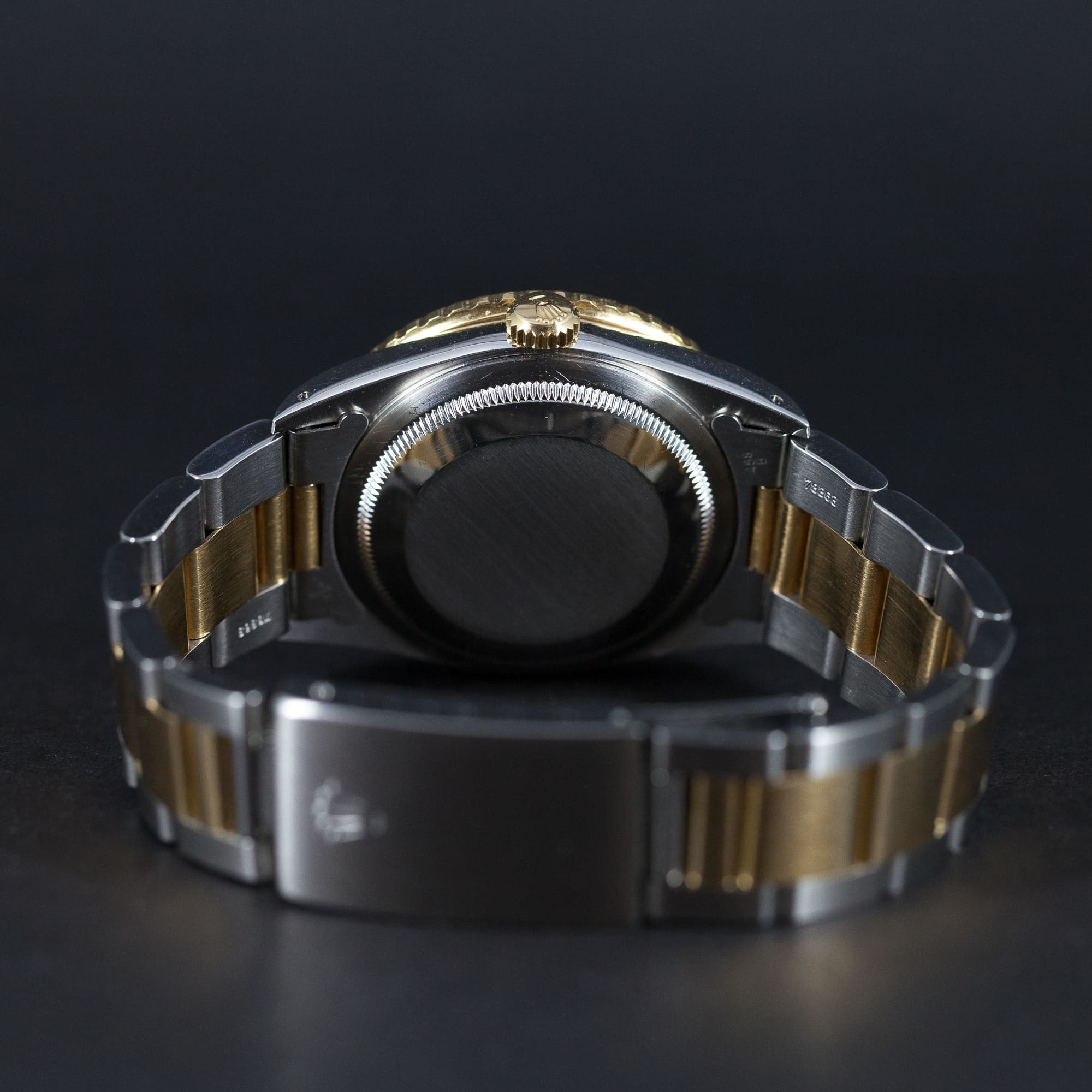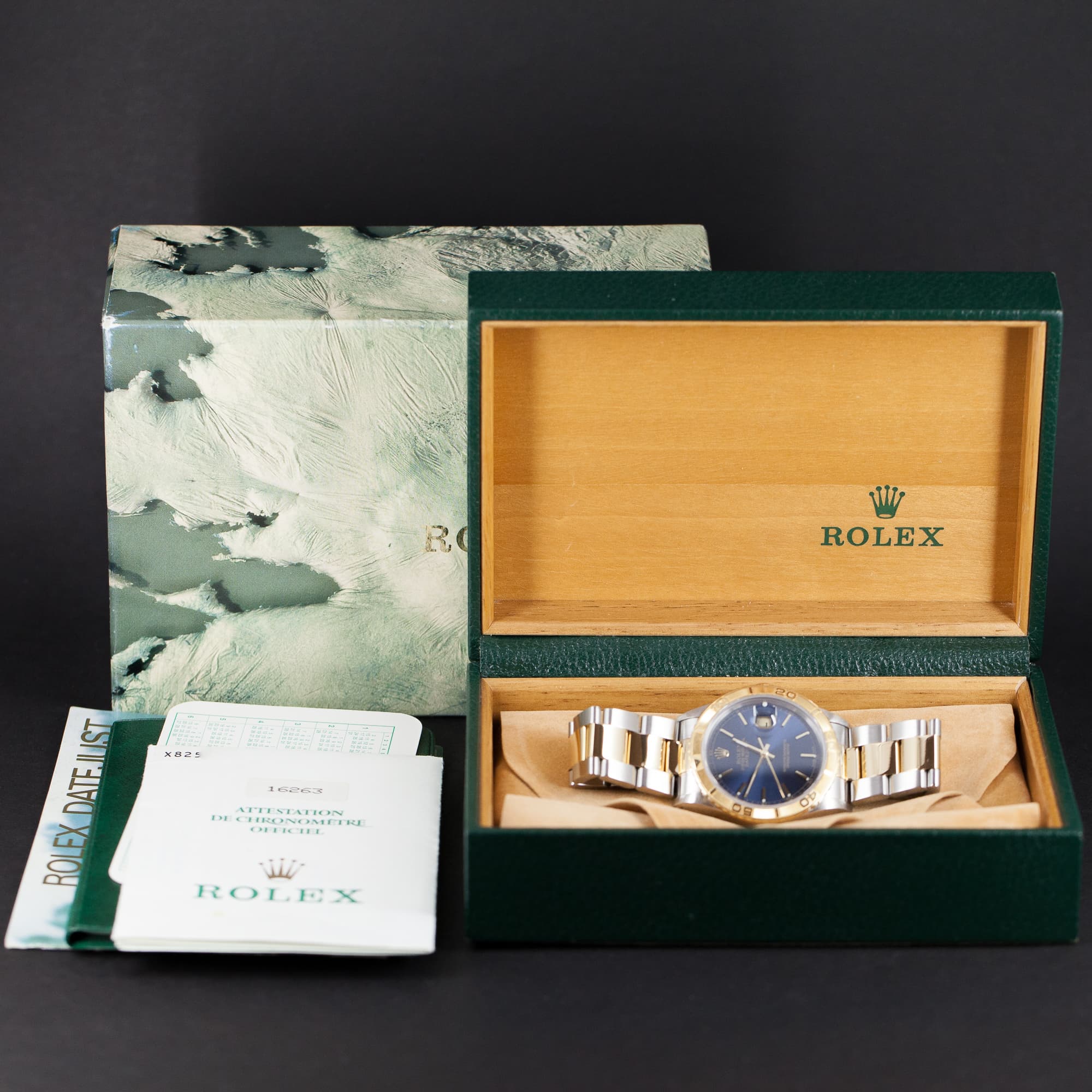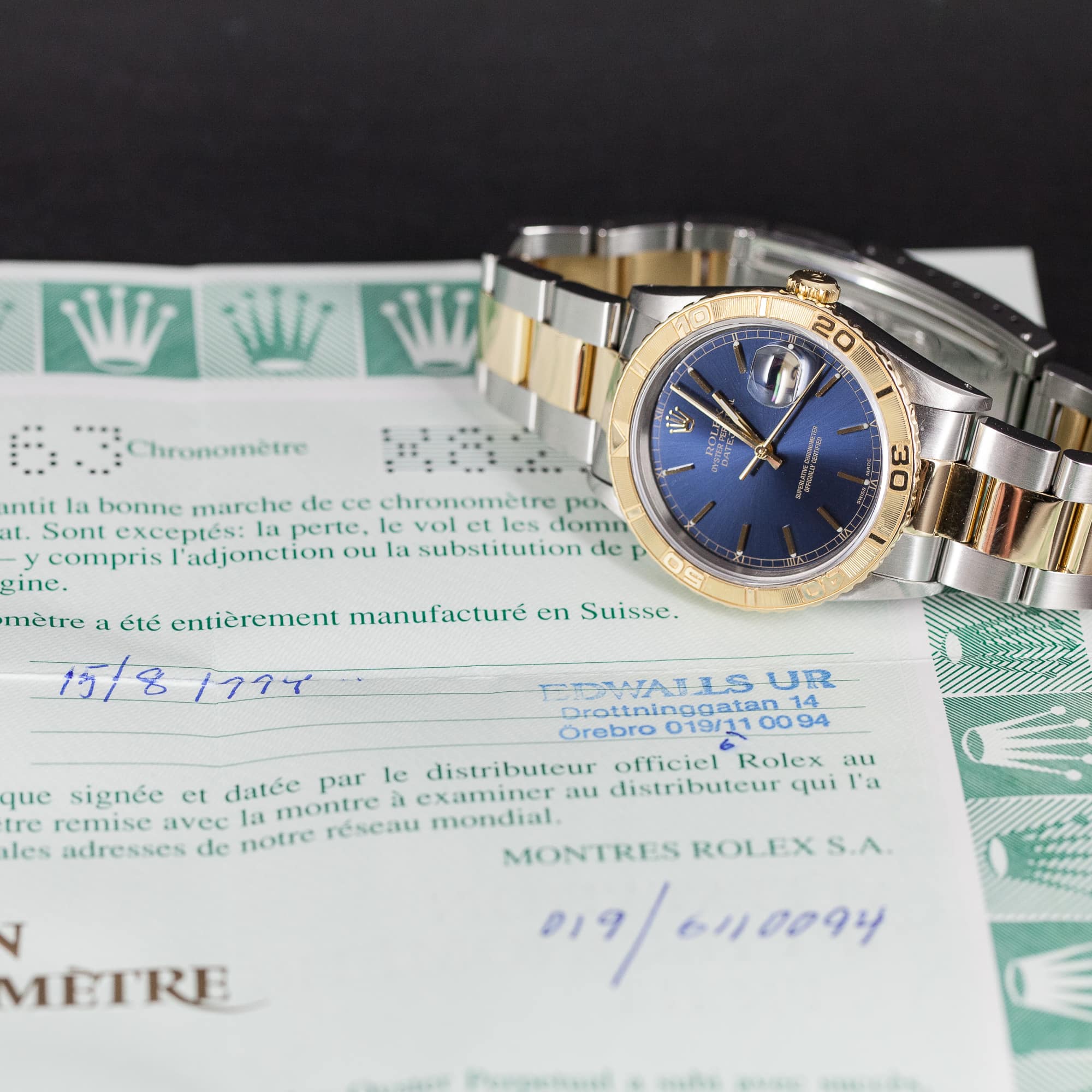 Rolex Datejust Turn-o-Graph Thunderbird 16263 vuodelta 1994. Teräs-18k kulta. Full-set, kaikki laatikot ja paperit. Erittäin hyväkuntoinen kokonaisuus. Rolexin cal.3135 automaattikoneisto on hienossa kunnossa. Kello on täysin vesitiivis, testattu +10/-0,7bar. Ranneke on alkuperäinen ref.78363.18/458B S8 (Elokuu 1994). Kuoren koko 36mm.