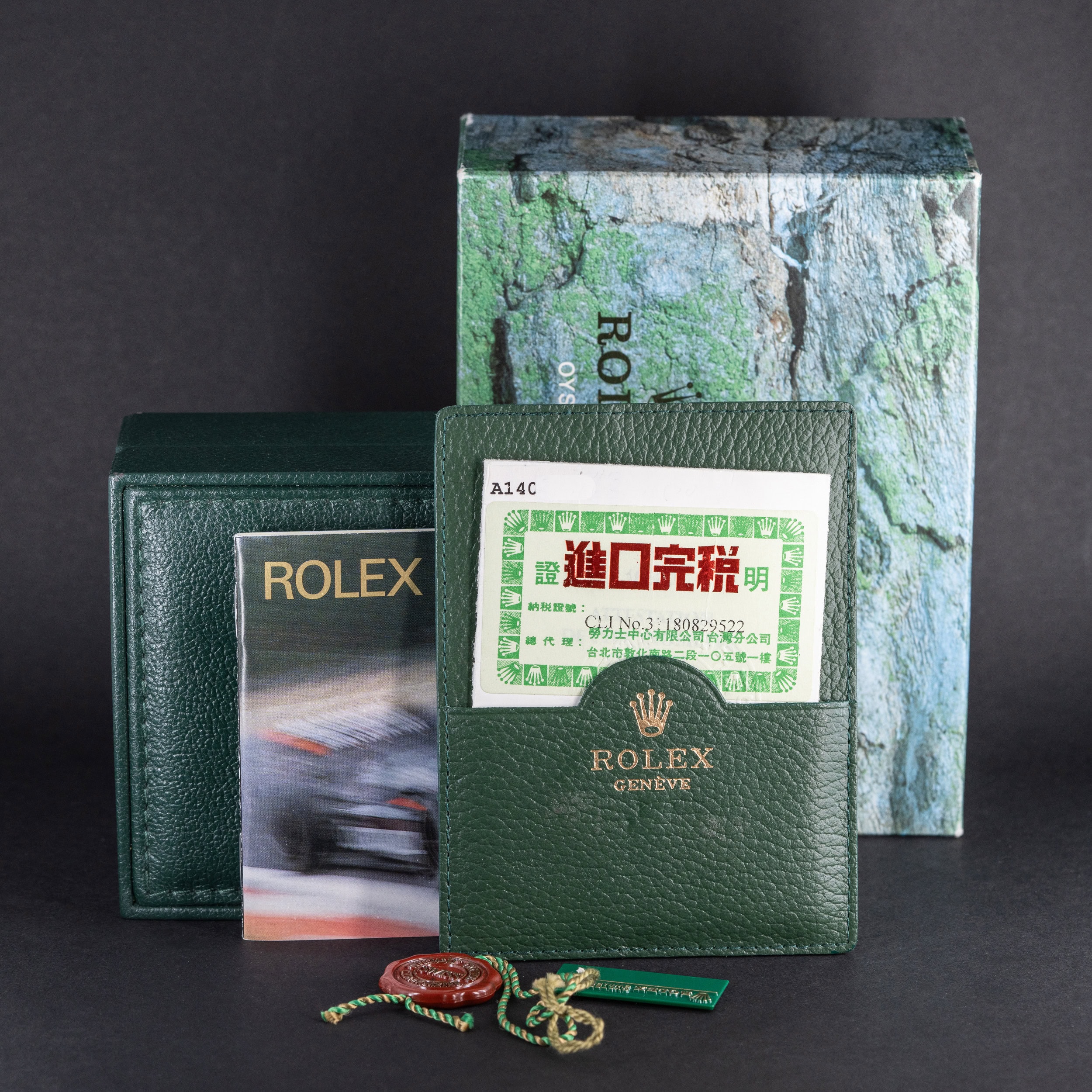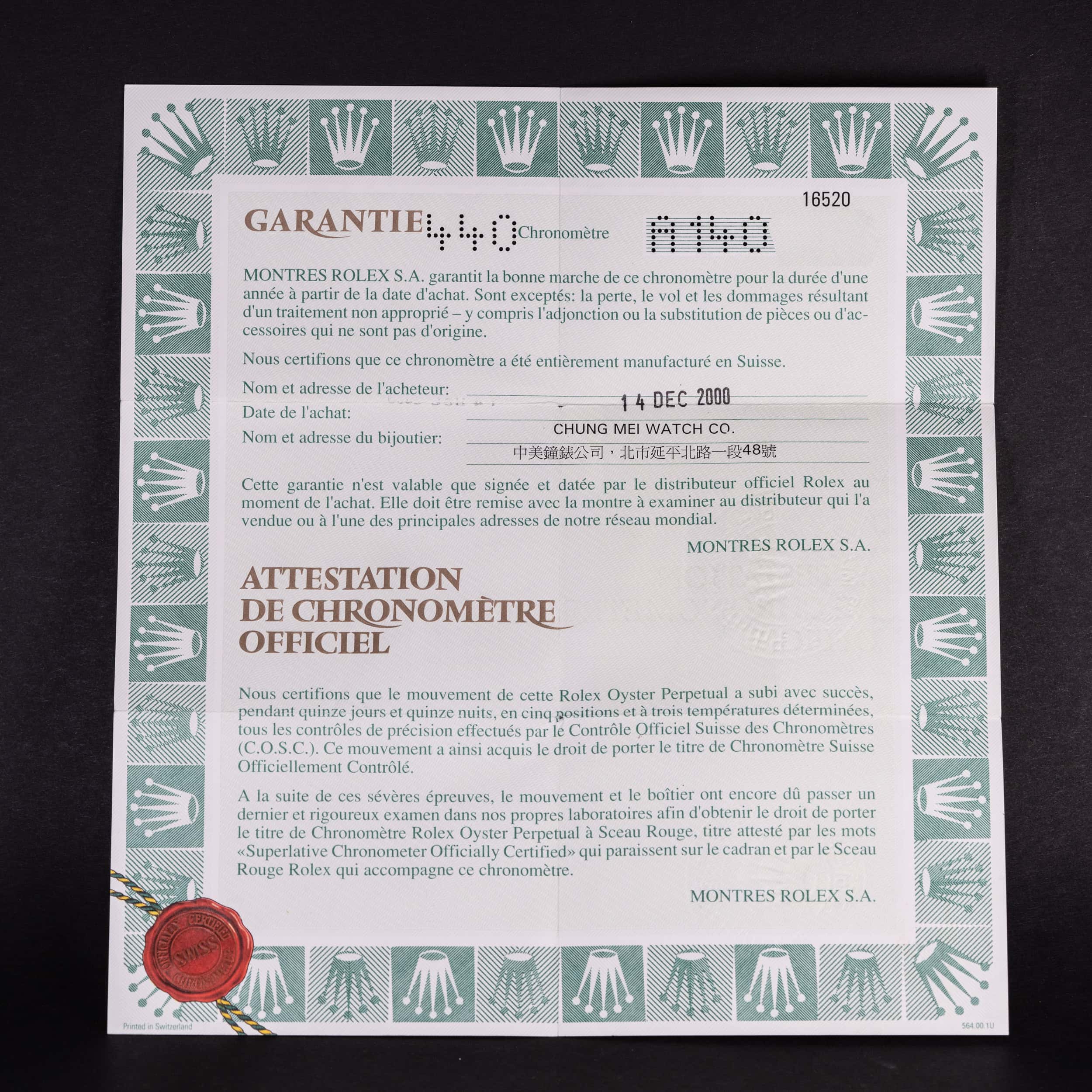 Sarjanumeron A140XXX mukainen valmistusvuosi on 1999. Kello on alunperin ostettu Taipeista, Chung Mei kelloliikkeestä 12/2000. Kellon historia on myös tarkistettu Rolexin tietokannasta.
