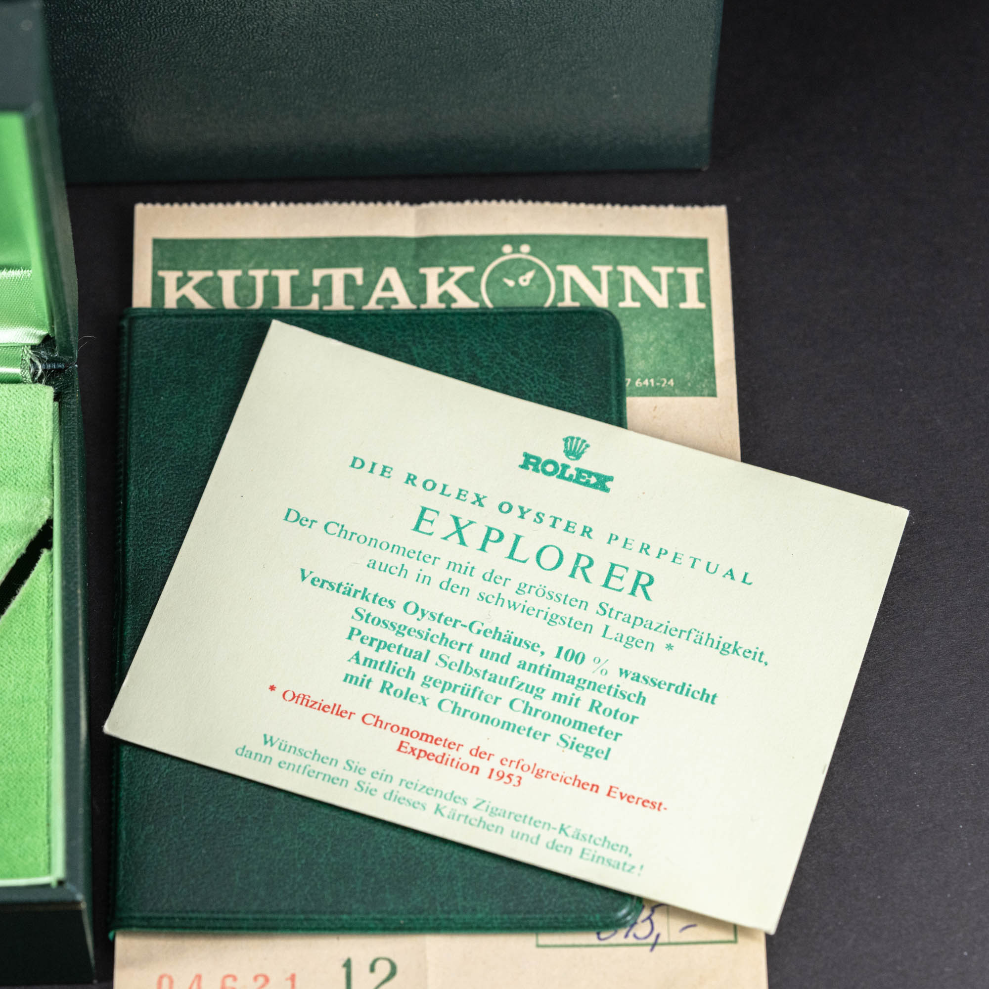 Kellossa on sen alkuperäinen 7206/58 riveted-teräsranneke (lukkokoodi 4/69). Kellon mukana tulee Rolexin alkuperäinen uudenveroinen vihreä arkkumallinen kellolaatikko ja ulkolaatikko, alkuperäinen Kultakönnin ostokuitti vuodelta 1975, Rolexin vihreä suojatasku ja punainen kronometri-tagi. Kuori on vesitiivis, testattu +3/-0,7bar. Kuoren koko on 36mm.