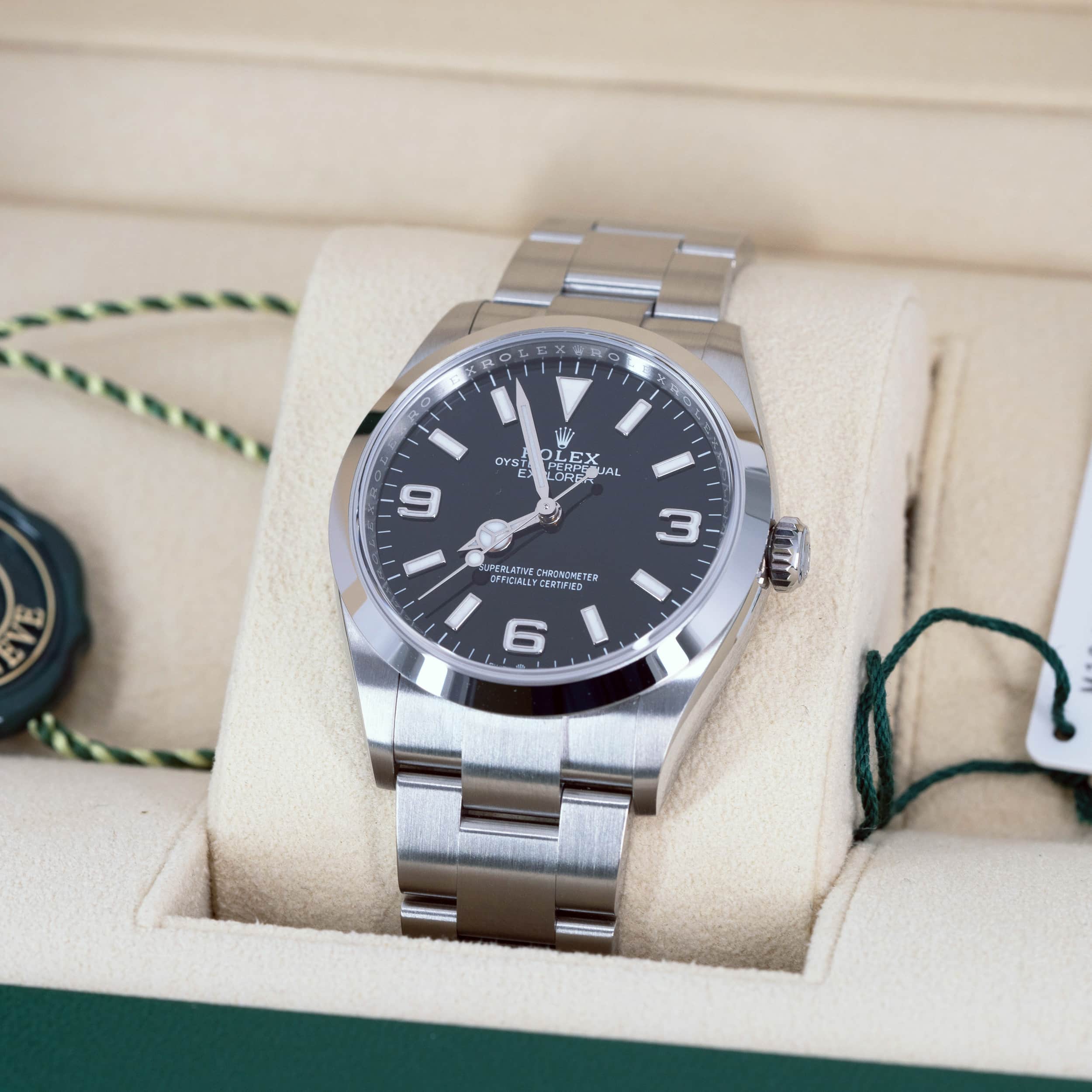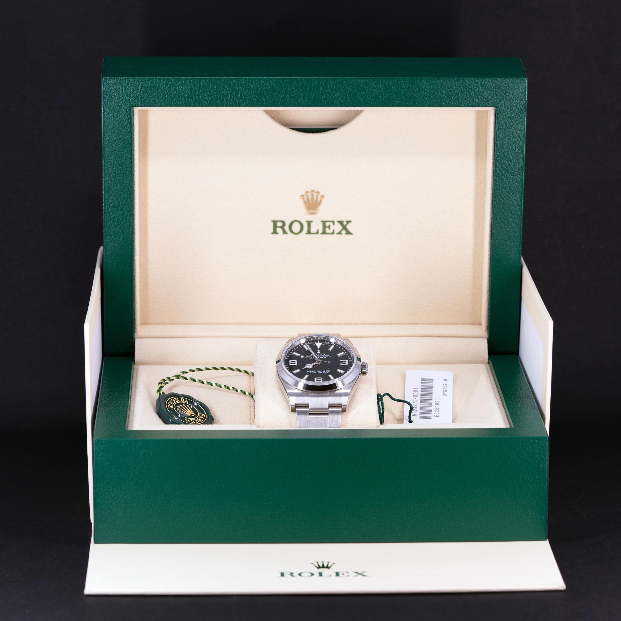 Käyttämätön Rolex Oyster Perpetual Explorer 36 vuodelta 2023. Full-set ja suomikello.