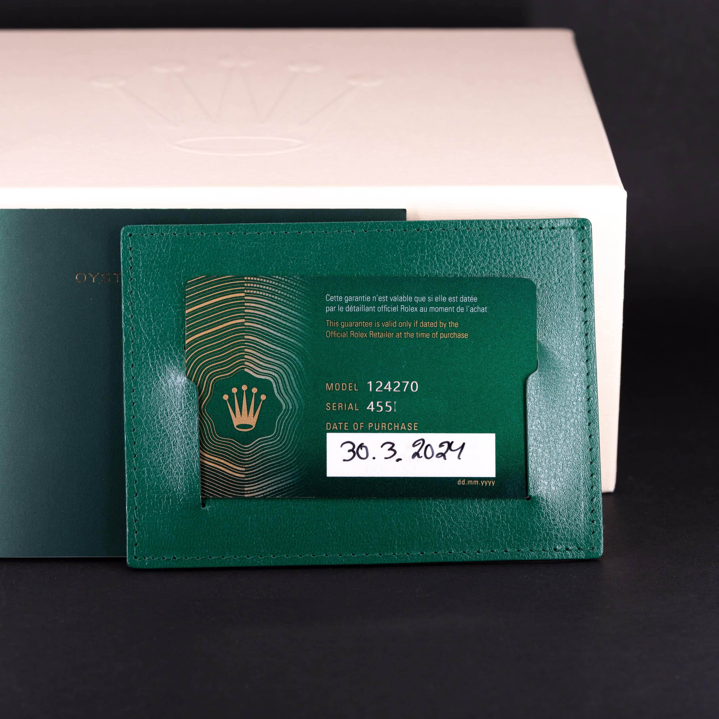 Kellolla on Rolexin kansainvälinen takuu voimassa vuoteen 2029 asti.