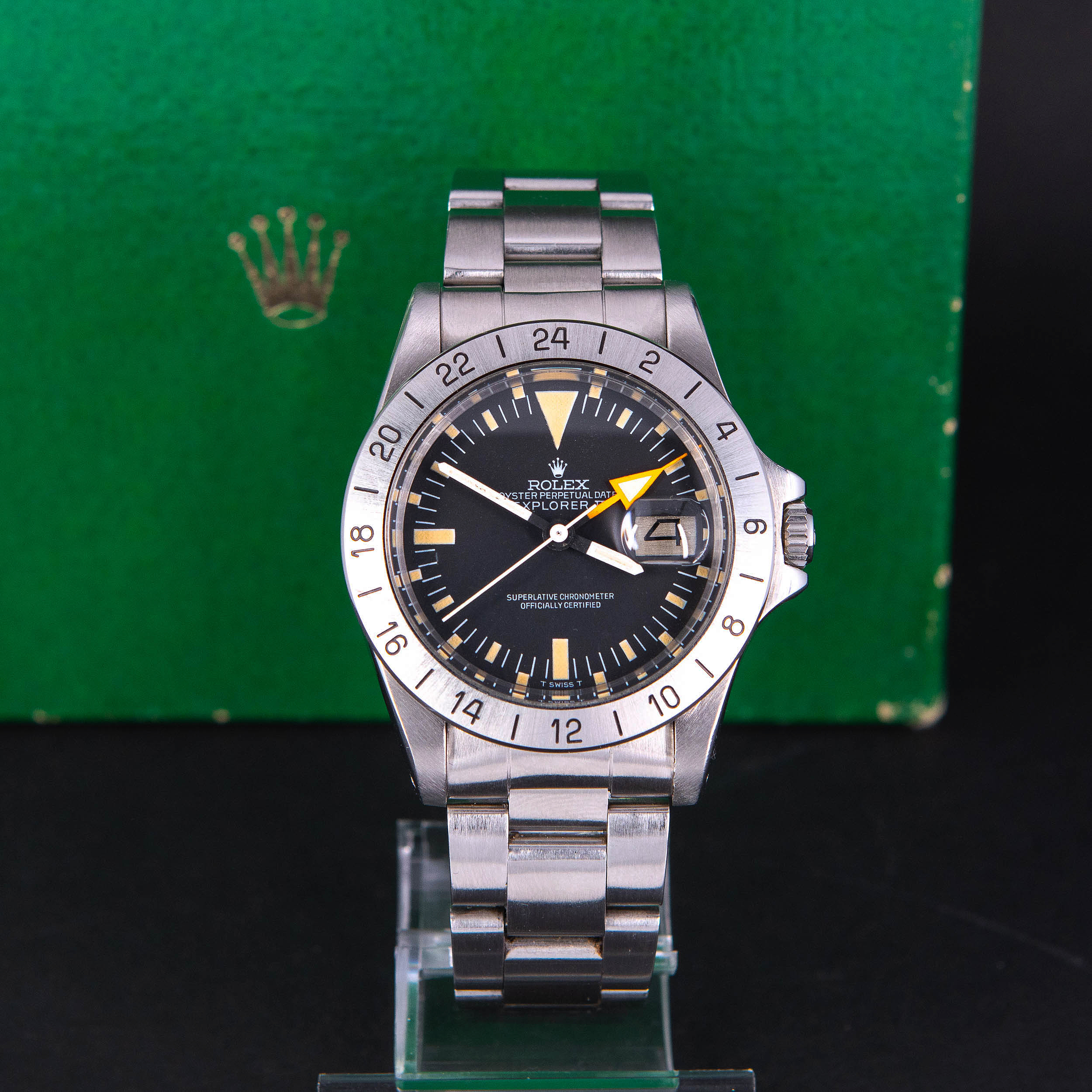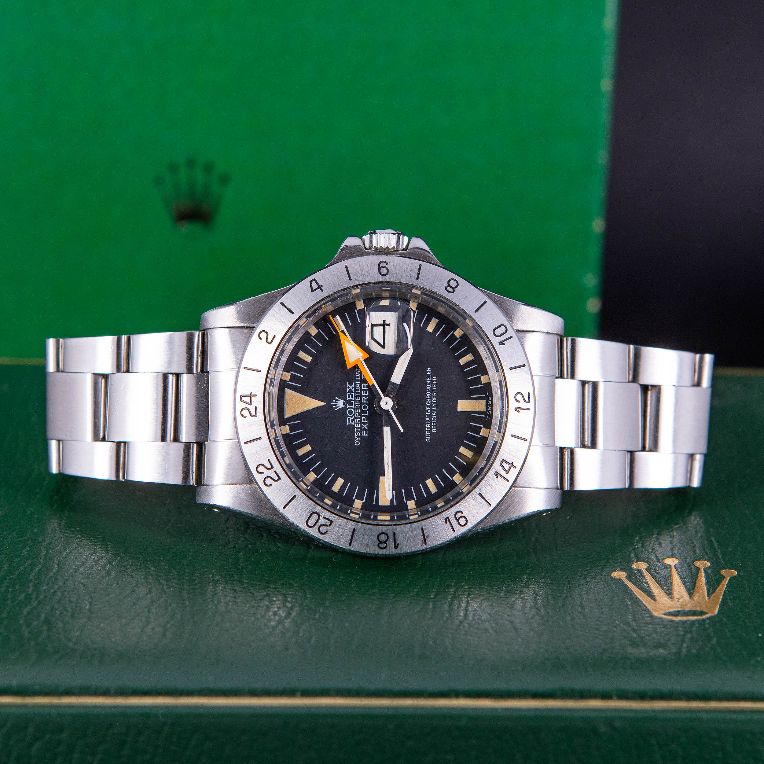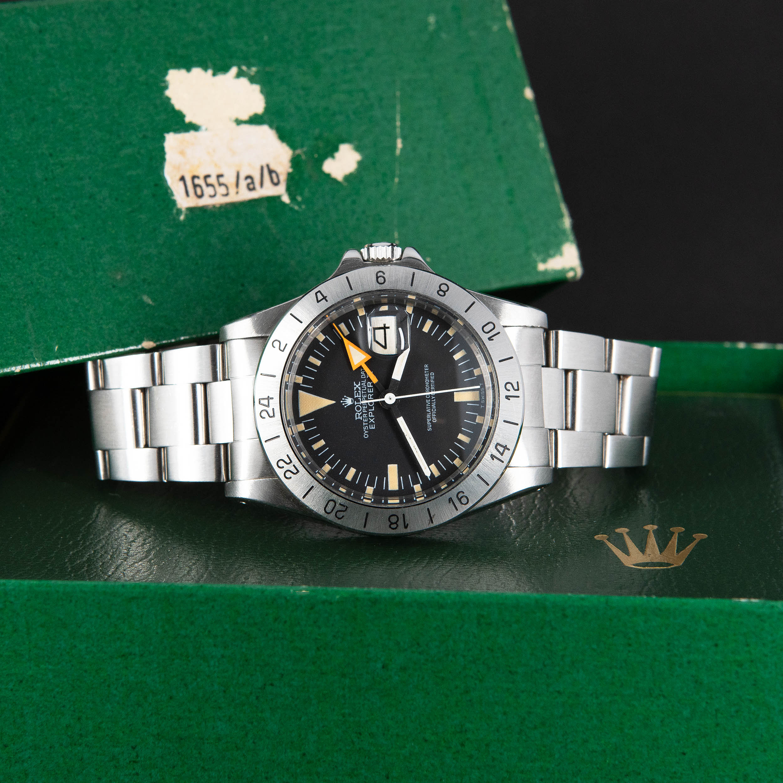 Harvinainen Rolex Oyster Perpetual Explorer II 1655 vuodelta 1974. Huippukuntoinen ja huollettu yksilö. Virheetön ja kauniisti ikääntynyt Sternin valmistama Mk2 musta kellotaulu tritium-lumella ja alkuperäiset tritium osoittimet. Alunperin punainen nuoliosoitin ”freccione” on muuttunut oranssiksi. Teräsbezel on uutta mallia. Kello on vesitiivis, testattu +5.0/-0,7bar. Kuoren koko on 39mm.