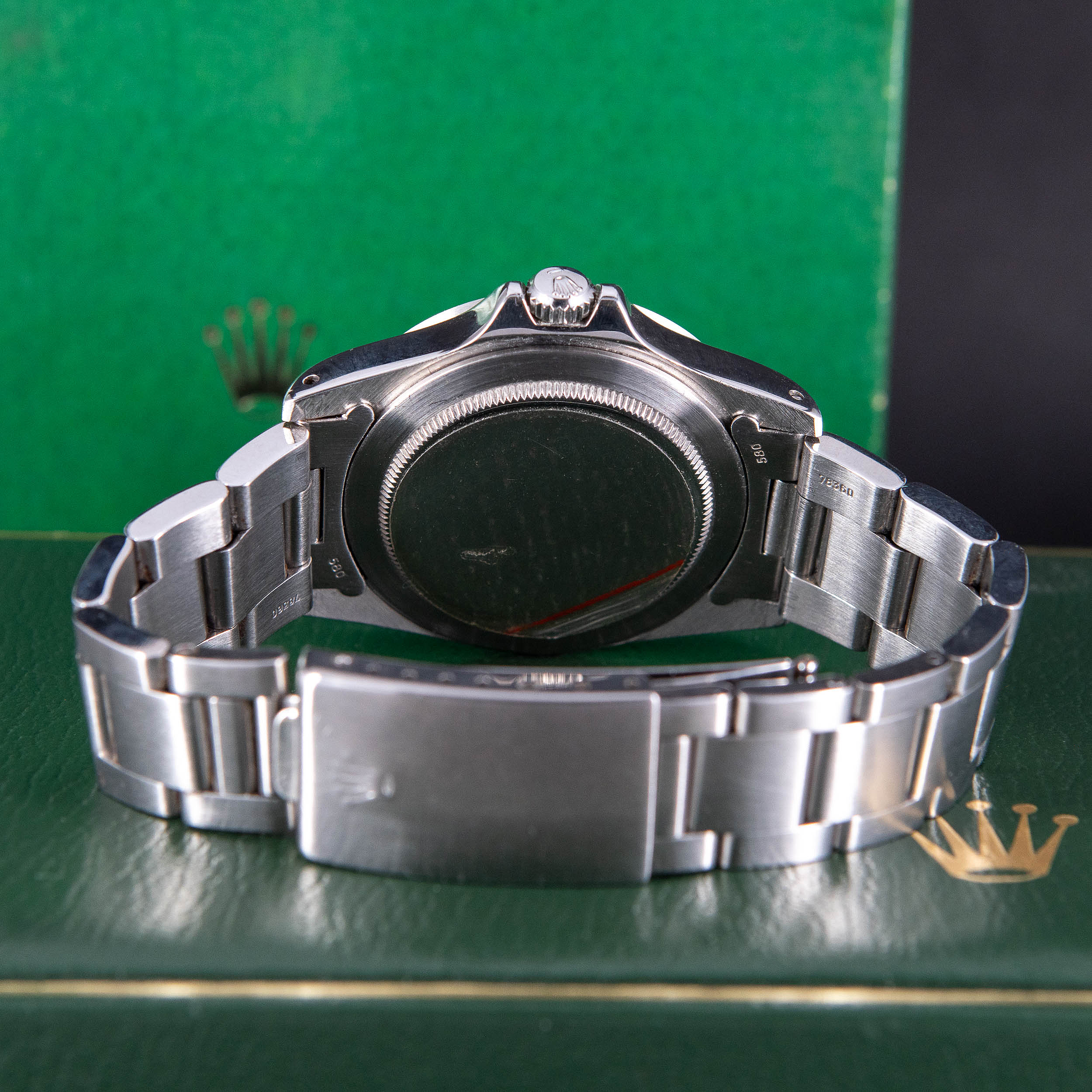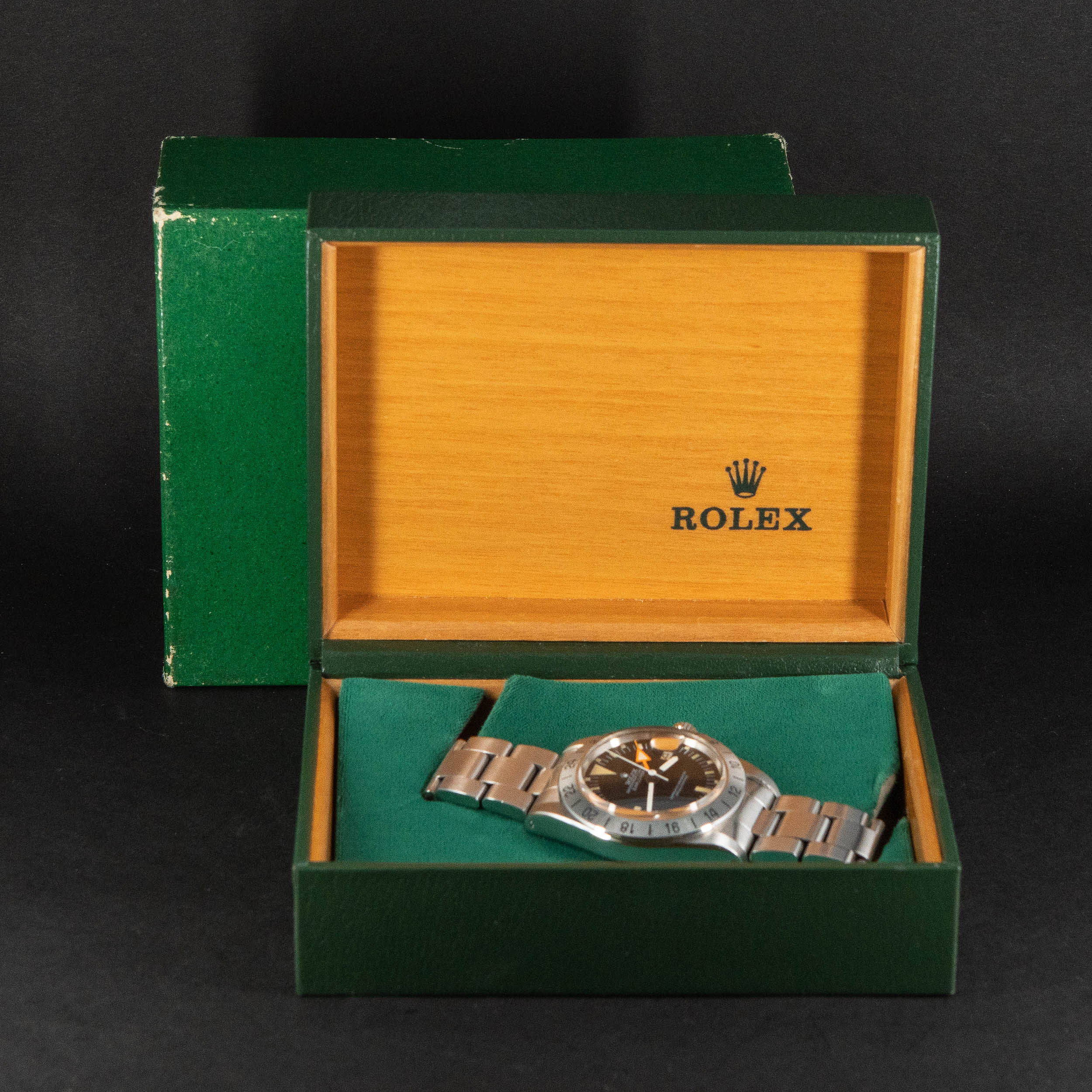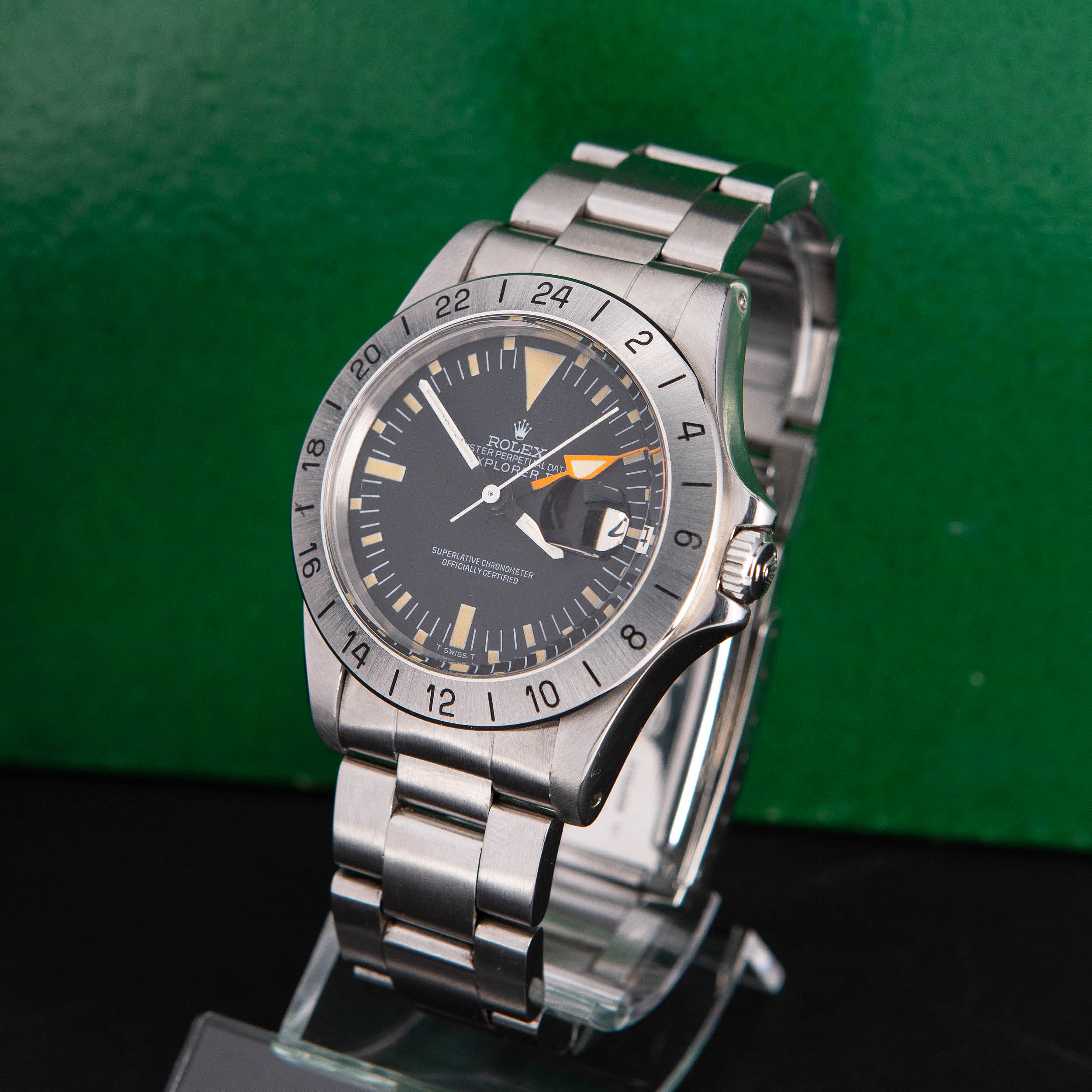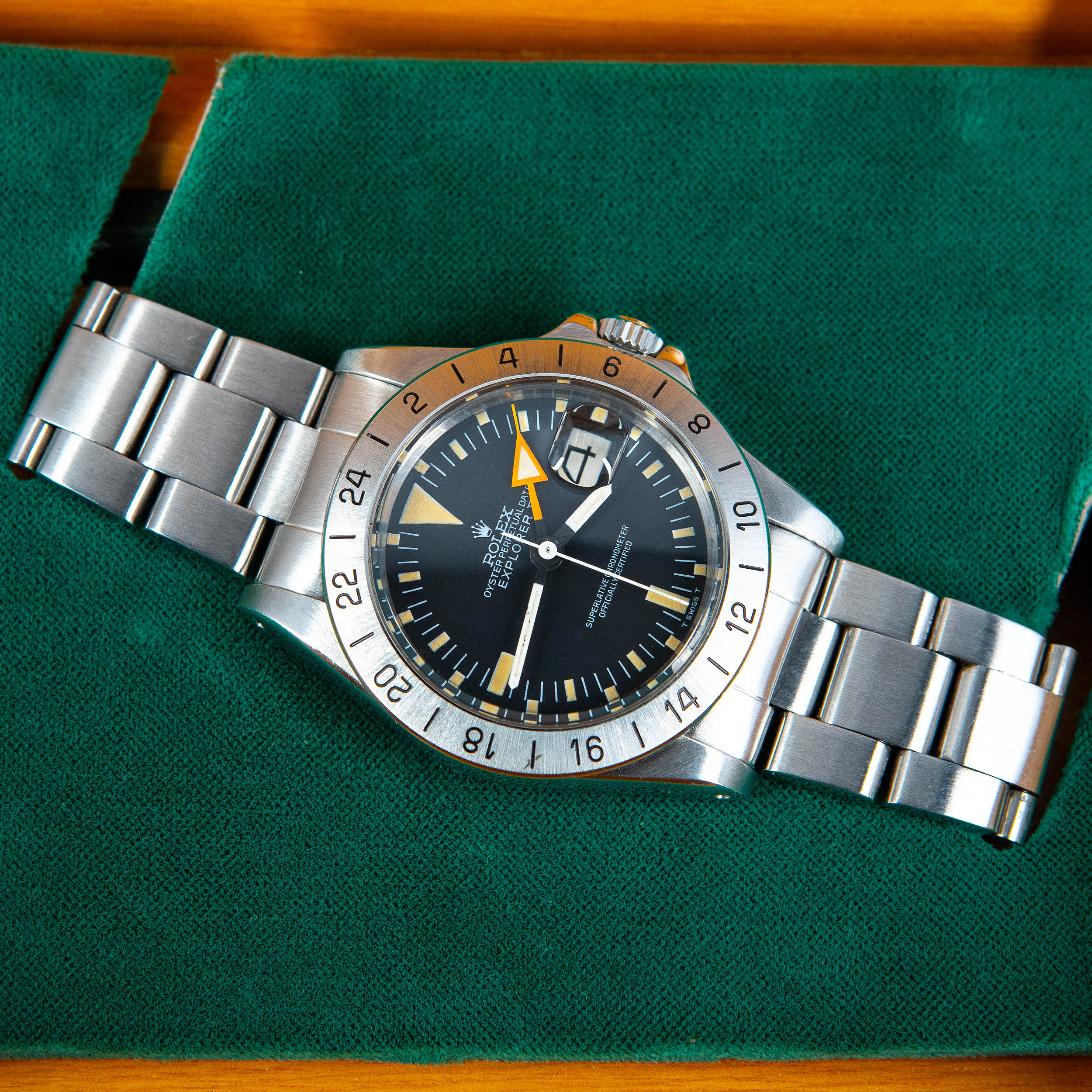 Harvinainen Rolex Oyster Perpetual Explorer II 1655 vuodelta 1974. Huippukuntoinen ja huollettu yksilö. Virheetön ja kauniisti ikääntynyt Sternin valmistama Mk2 musta kellotaulu tritium-lumella ja alkuperäiset tritium osoittimet. Alunperin punainen nuoliosoitin ”freccione” on muuttunut oranssiksi. Teräsbezel on uutta mallia. Kello on vesitiivis, testattu +5.0/-0,7bar. Kuoren koko on 39mm.