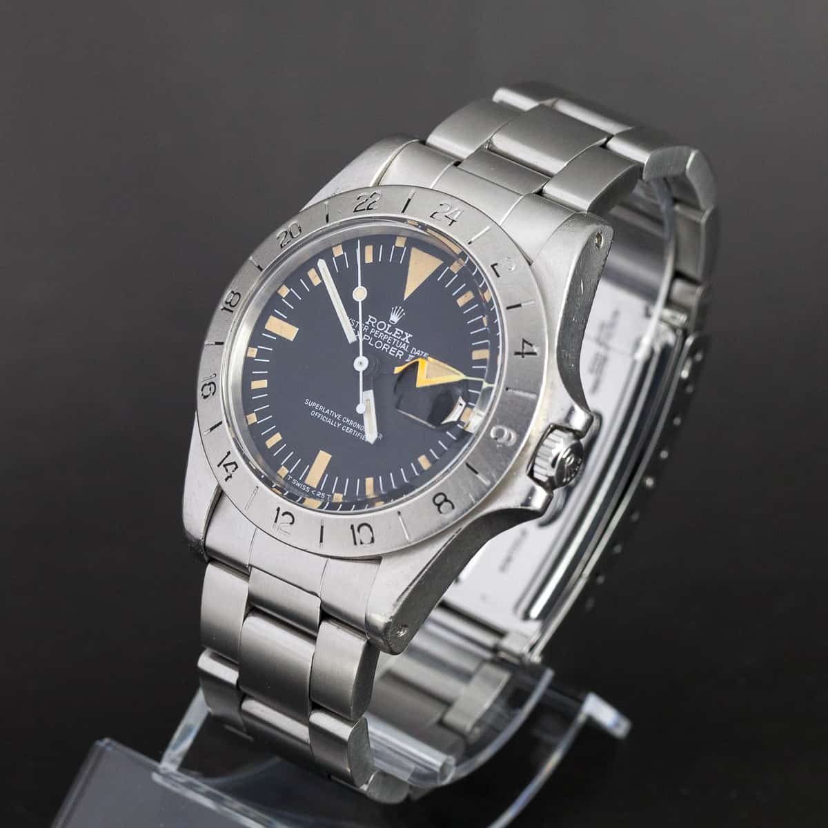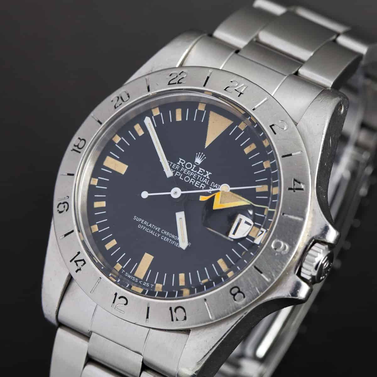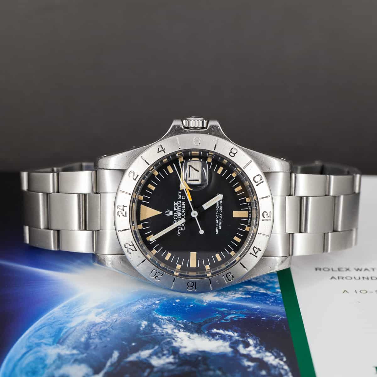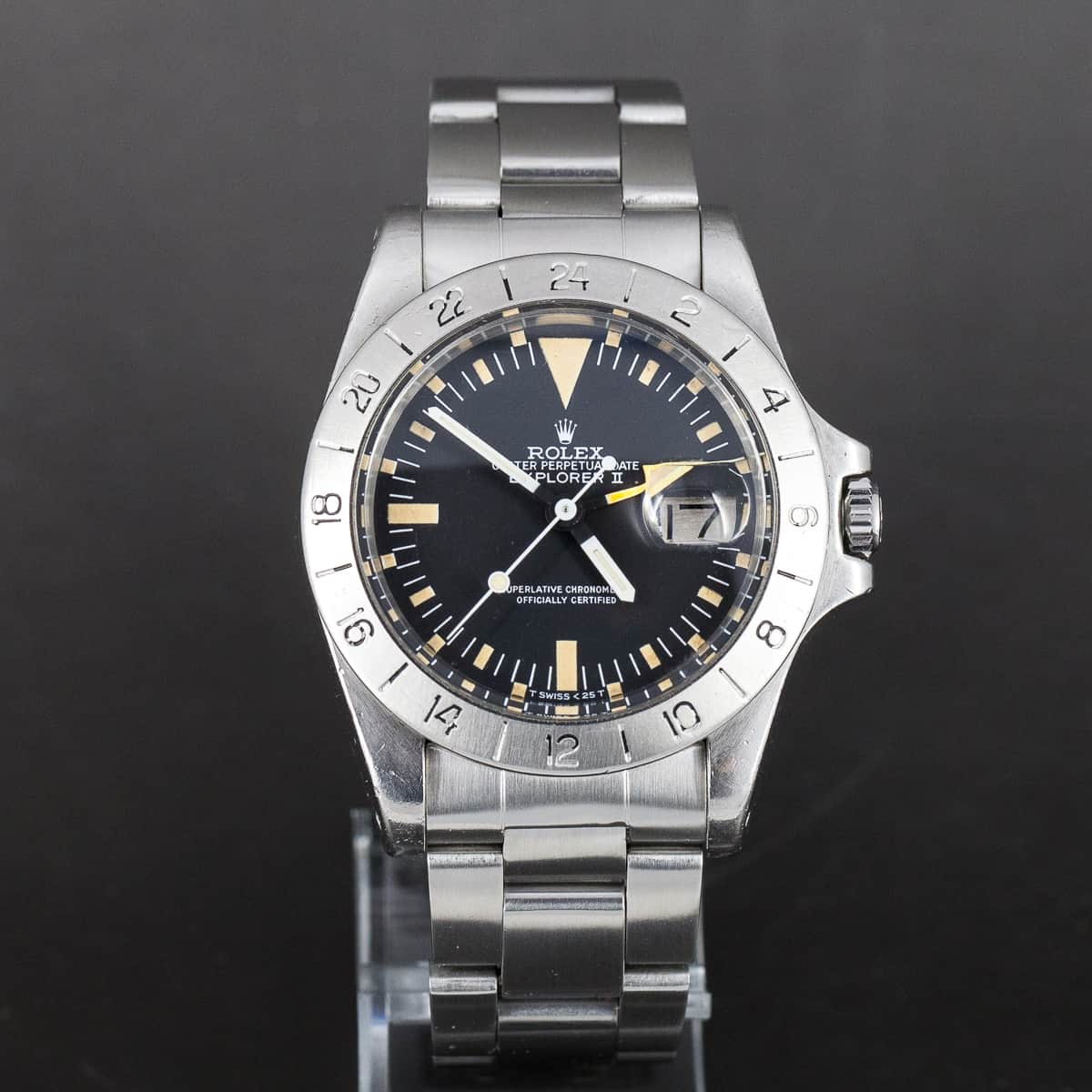Harvinainen Rolex Explorer II ref. 1655 ”Freccione/Steve McQeen” vuodelta 1978. Alkuperäinen kauniisti ikääntynyt ja virheetön tritium kellotaulu ja alkuperäiset tritium osoittimet. GMT-osoittimen pigmentti on muuttunut punaisesta keltaiseksi.