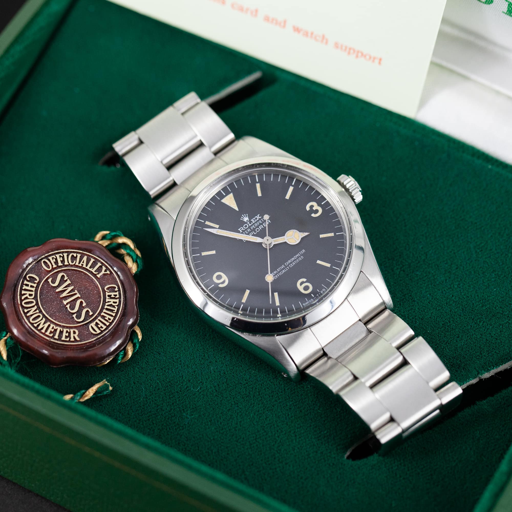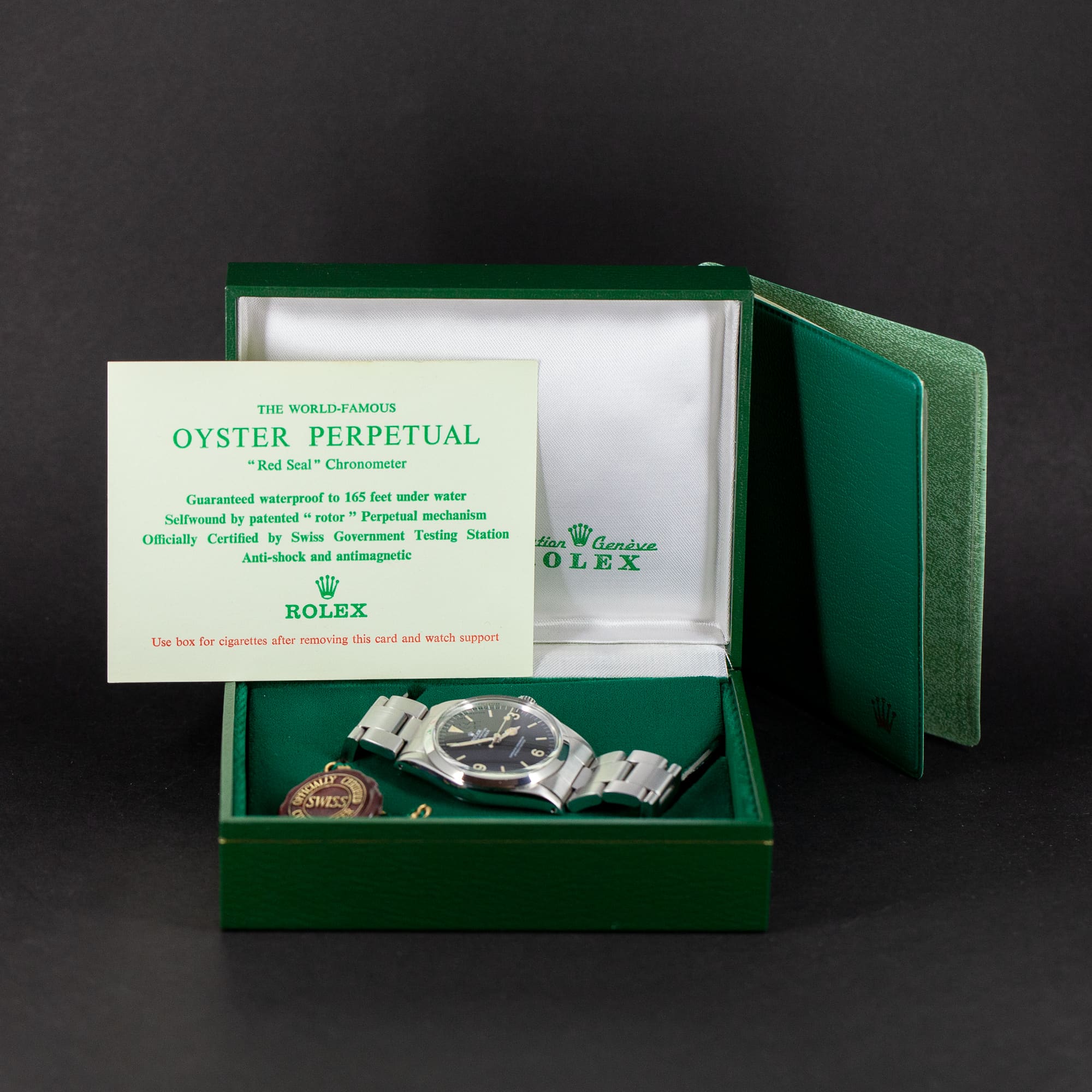 Kellon mukana tulee Rolexin huippukuntoinen laatikko, red-seal kronometri kortti (ei kronometritodistusta), red-seal tagi, muovitasku ja käännös doku.