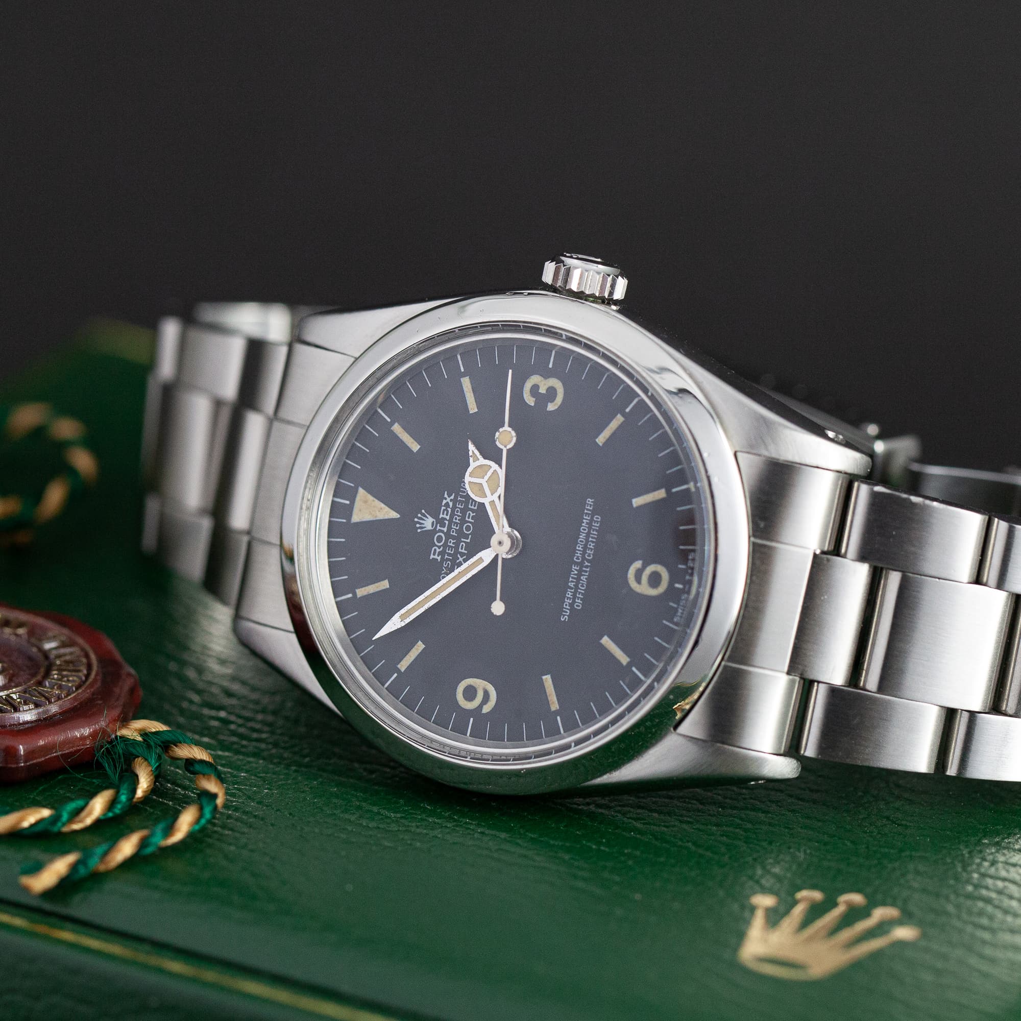 Harvinainen Rolex Explorer 1016 vuodelta 1975. Kauniisti ikääntynyt ja juuri täysin huollettu yksilö. Alkuperäinen Rolexin ”frog-foot-coronet” tritium kellotaulu ja osoittimet. Rolex cal.1570 kronometri automaattikoneisto on juuri täysin kunnostettu. Teräskuoressa ja takapohjassa on käytön jälkiä. Rolex Oyster 78360/580 teräsranneke. Kuoren koko on 36mm. Kello soveltuu hyvin jokapäiväiseen käyttöön. Vesitiivis, testattu +3/-0,4bar.