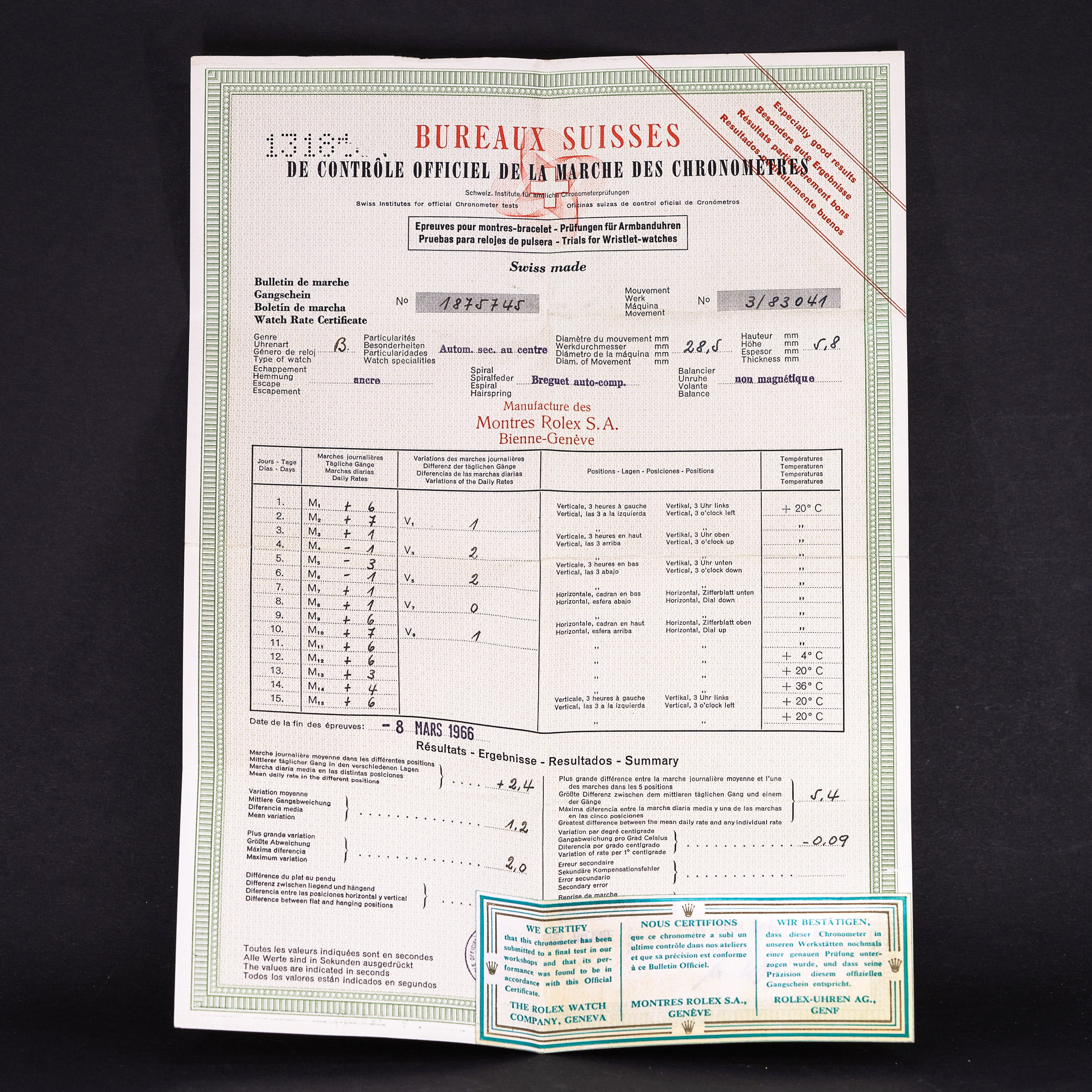 Rolex cal.1570-GMT koneisto on juuri täydellisesti kunnostettu ja se toimii moitteettomasti. Koneiston sarjanumero täsmää kronometrisertifikaatin numeroon. Koekäytössä kronometritodistuksen maininta: Especially good results sai uudelleen vahvistuksen. Kello käy erittäin tarkasti.