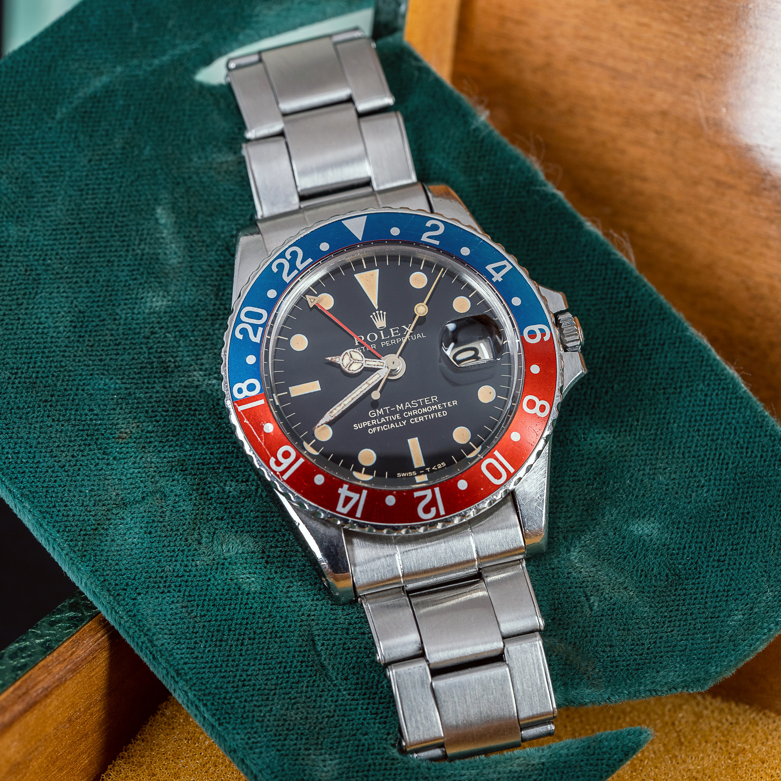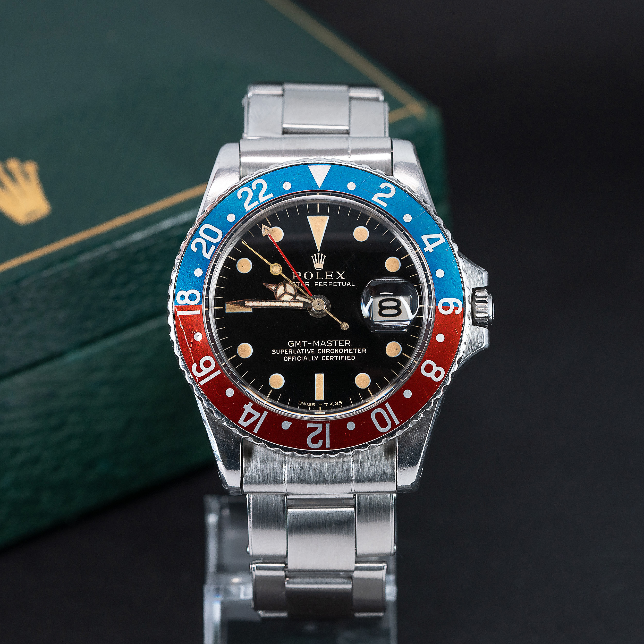 Kellossa on virheetön, alkuperäinen gilt/gloss kellotaulu kullan värisillä teksteillä ja tritium lumella. Kellotaulun Flat-short minuuttiosoitin ja flat -mallinen tuntiosoitin ovat alkuperäiset. Punainen GMT-osoitin on pienellä kolmio-kärjellä. Osoittimien tritium loistemassa loistaa yhä voimakkaasti UV-valolla aktivoituna. Lasisarjassa on vakiomallinen teräsrunko, jossa on kauniisti ikääntynyt 24h fat-font, red-back bezel insert.