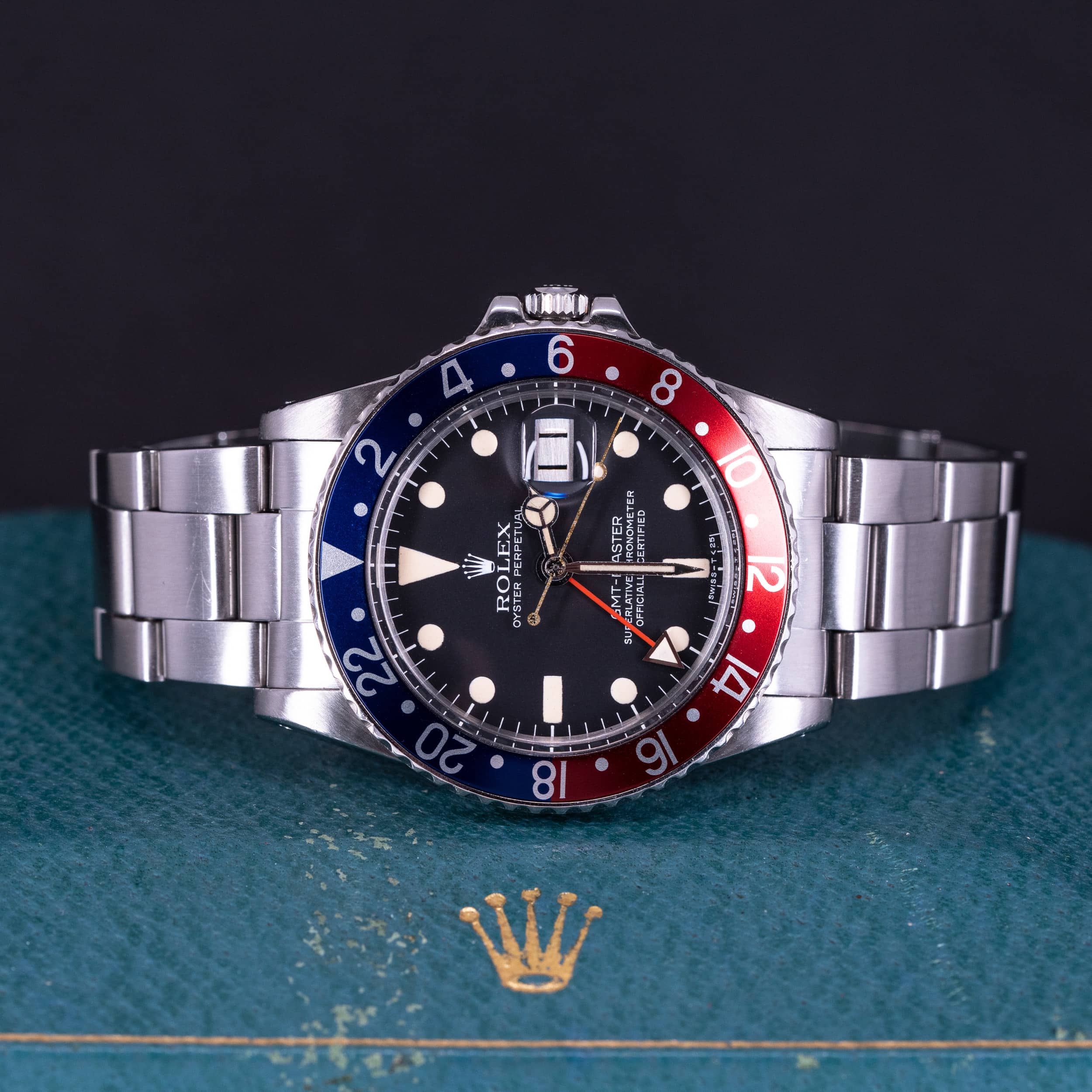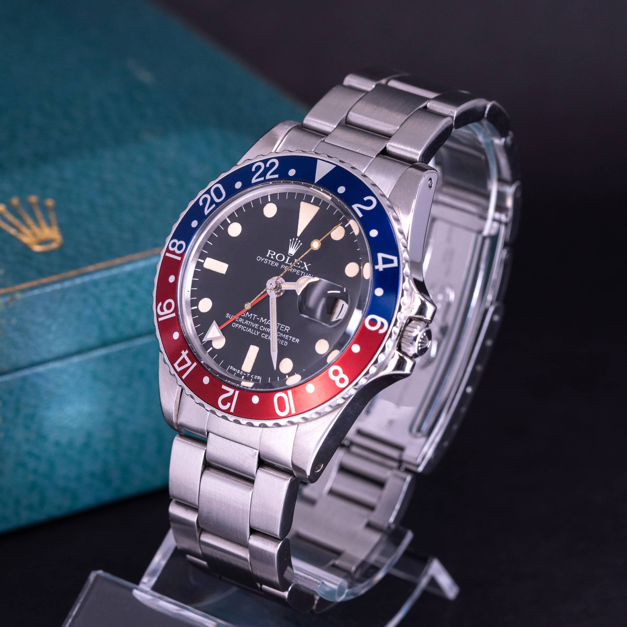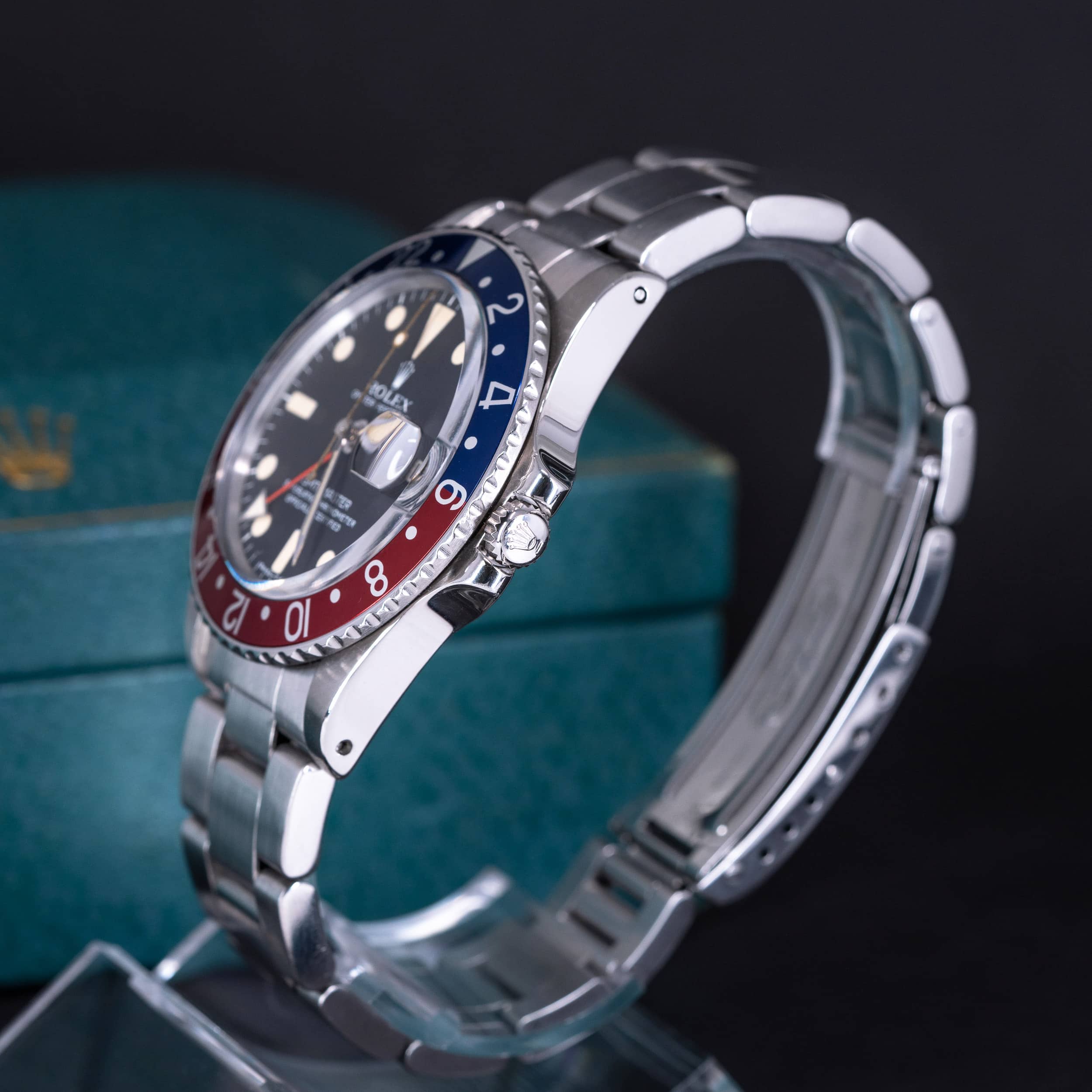 Harvinainen Rolex Oyster Perpetual GMT-Master ref. 1675. Sarjanumeron 555xxxx mukainen valmistusvuosi on 1978.