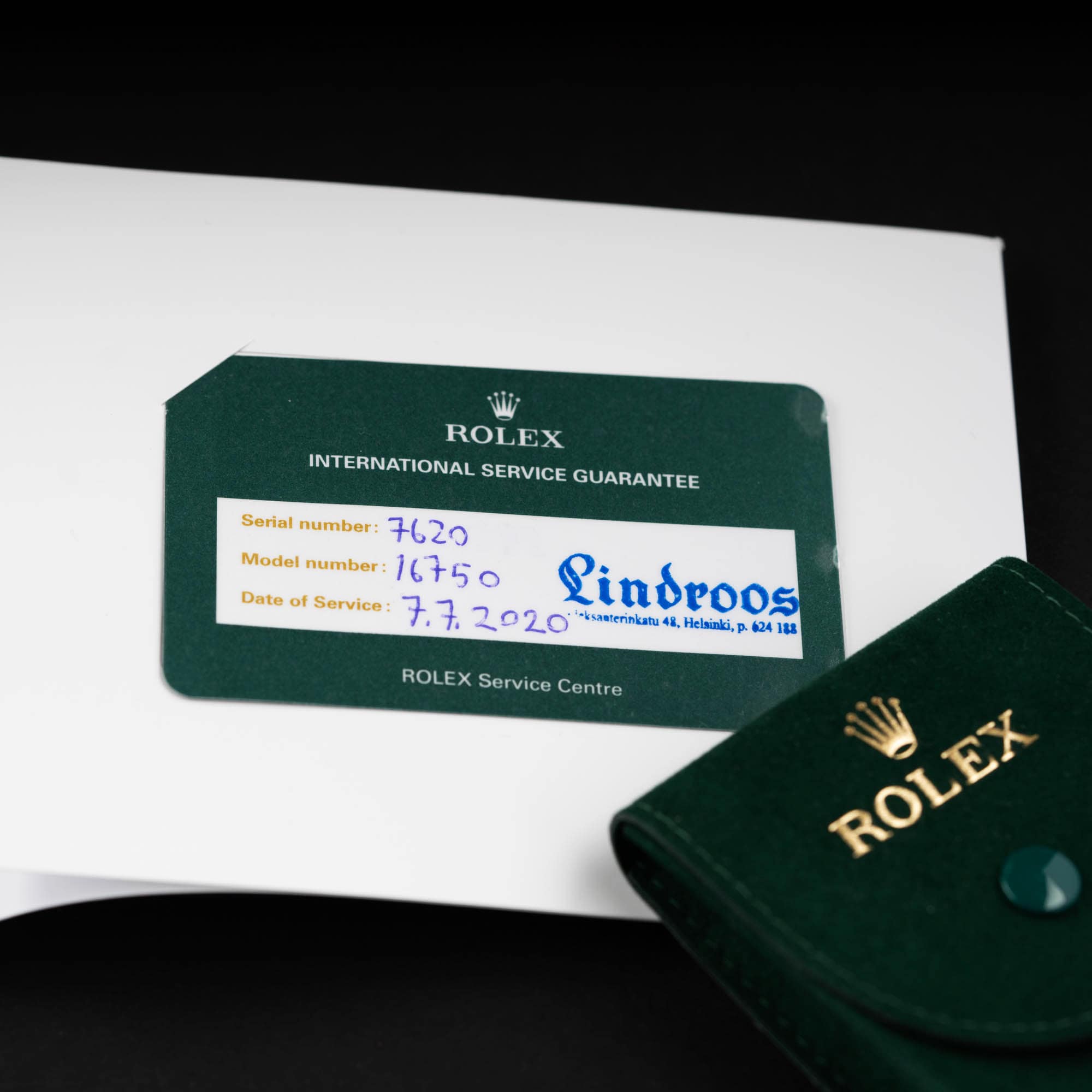 Teräsranneke on kellon alkuperäinen Rolex Oyster ref. 78360/580, H lukkokoodilla (1983). Kellon mukana tulee hyväkuntoinen Rolexin vihreä kellolaatikko, Rolex huoltopussi sekä Lindroosin huoltotodistus.