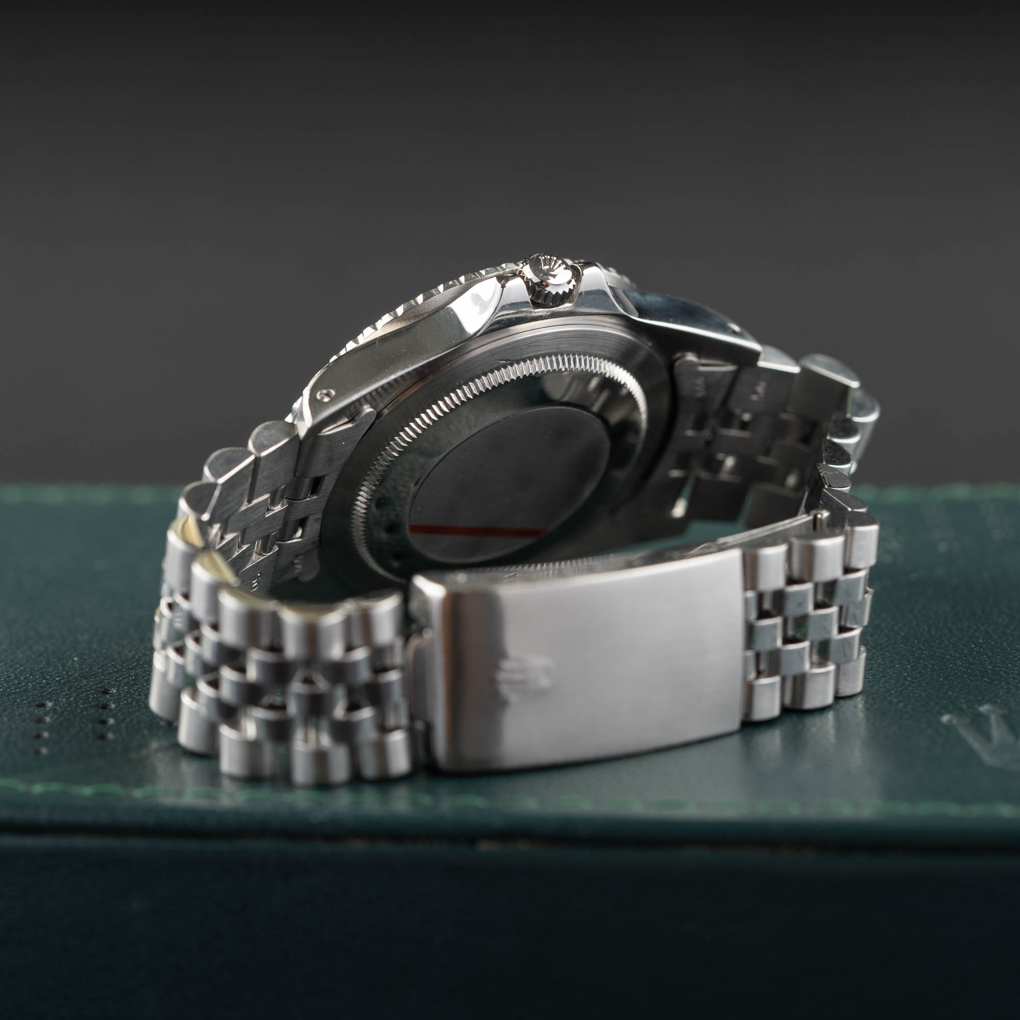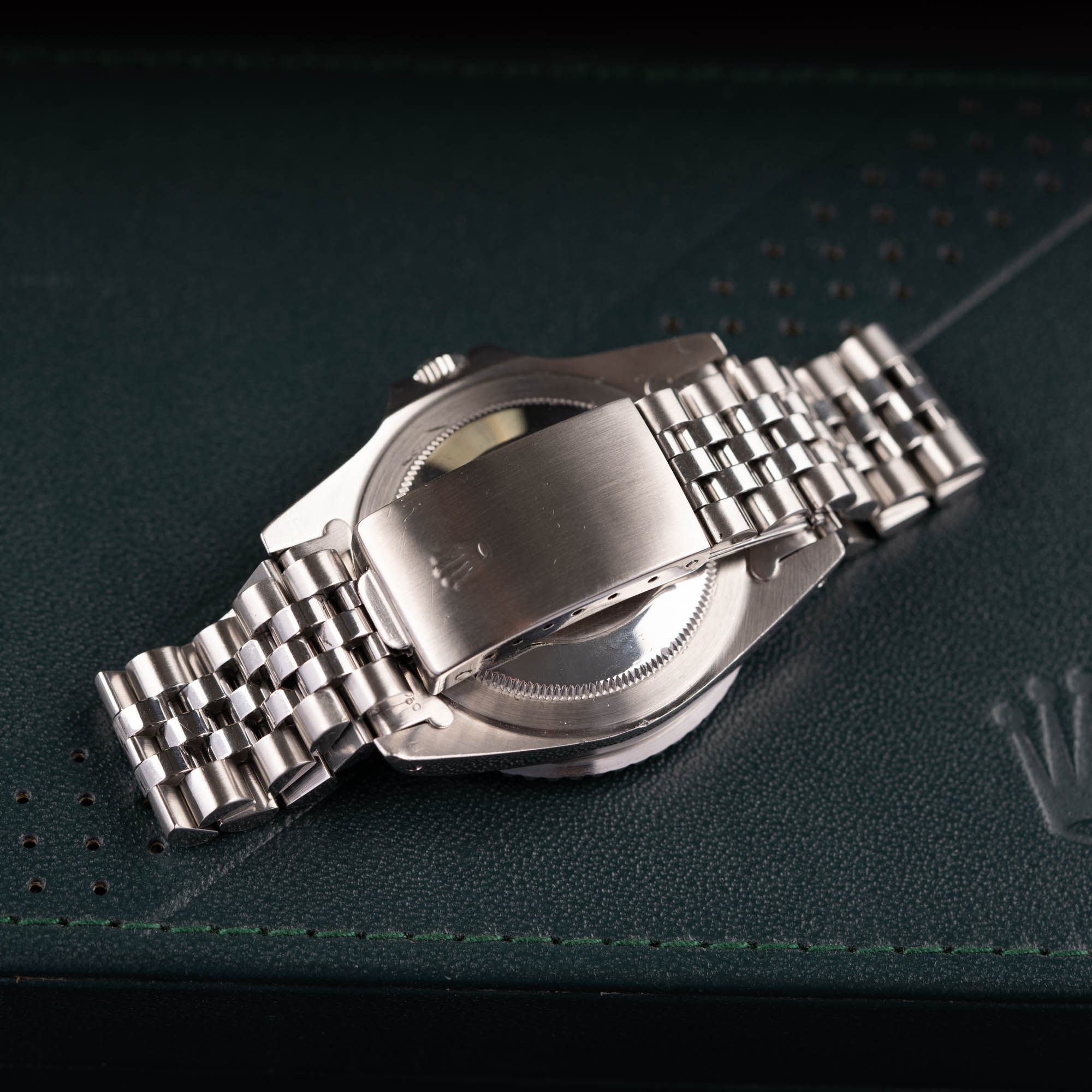 Teräsranneke on kellon alkuperäinen Jublee 62510/550 lukkokoodilla I 10 (lokakuu, 1985). Kellon mukana tulee hyväkuntoinen Rolexin vihreä kellolaatikko sekä Lindroosin huoltotodistus.
