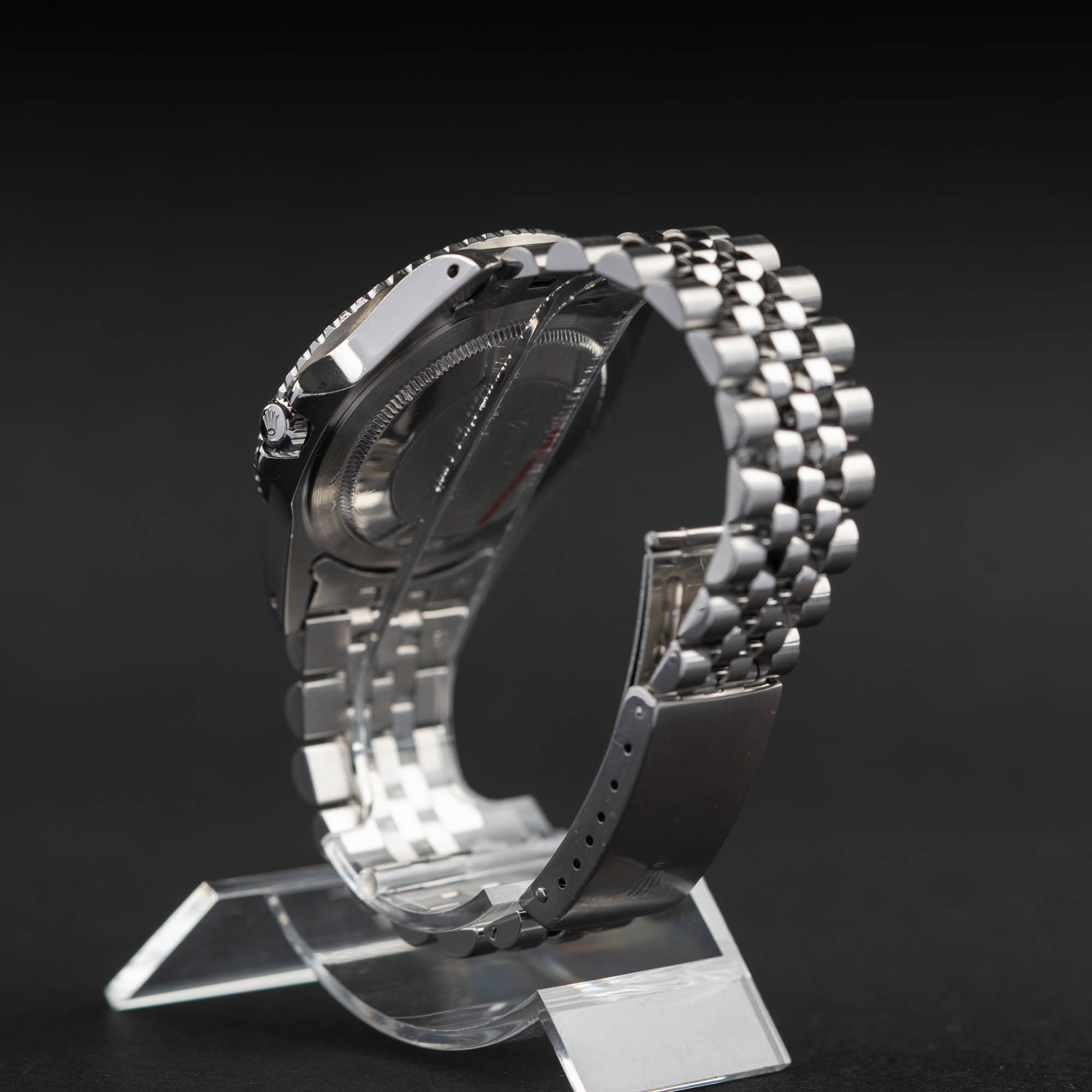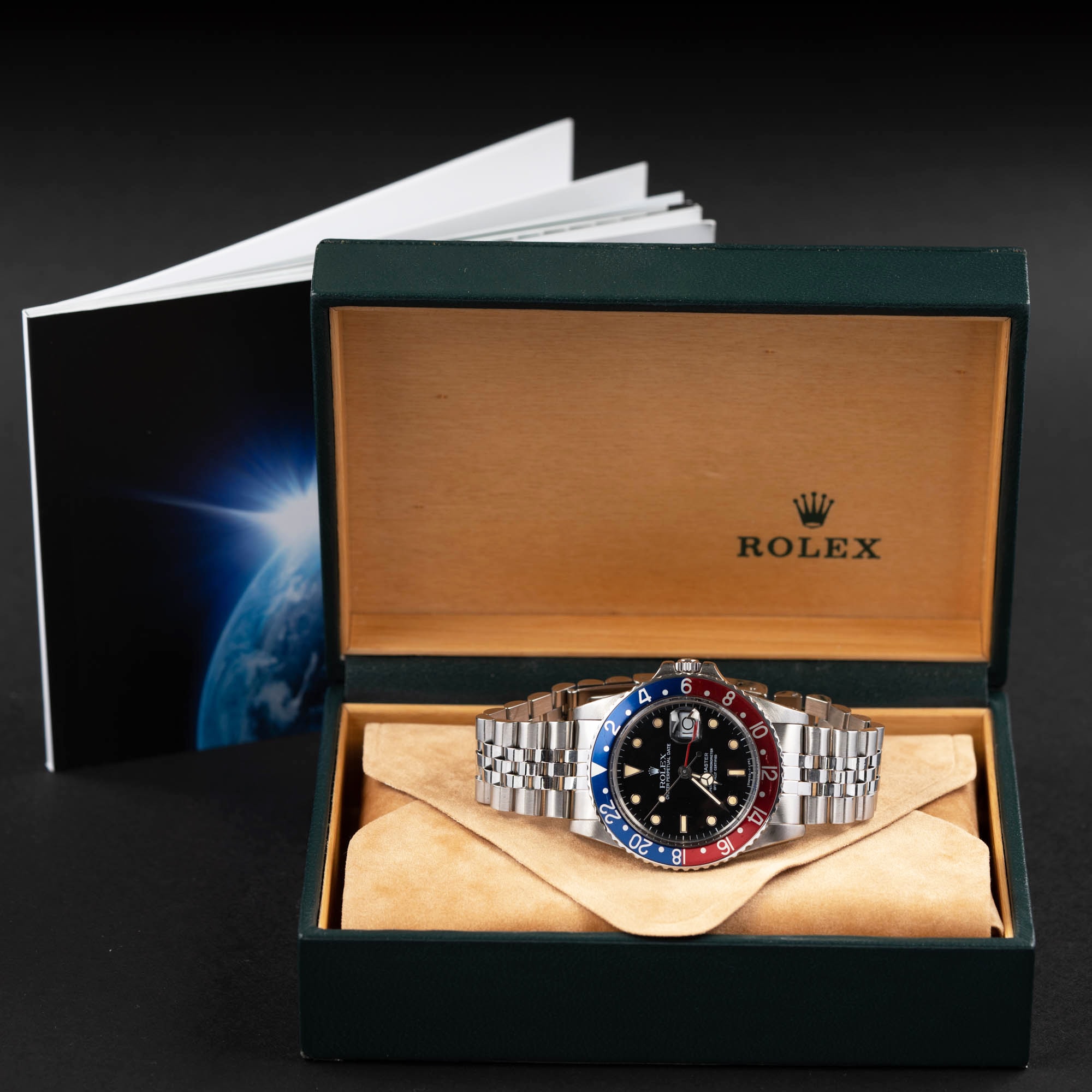 Rolex Oyster GMT-Master 16750 vuodelta 1985. Sn. 865xxxx. Kellossa on hienokuntoinen gloss Mk1 kellotaulu tritium indekseillä ja alkuperäset tritium-osoittimet. Pepsi-bezel on hyväkuntoinen. Taulun ja osoittimien lume on erittäin kauniisti ja tasaisesti ikääntynyt. Rolexin cal. 3075GMT quickset- automaattikoneisto on täydellisesti kunnostettu Lindroosin huollossa 8/2019. Teräskuori on yhä vesitiivis, testattu +5/-0.7bar. Kuoren koko on 40mm.