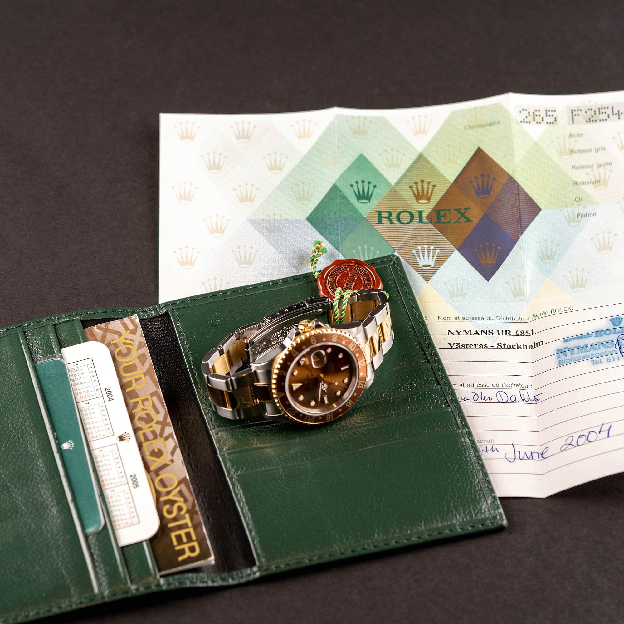 Kellon mukana tulee Rolexin vihreä sisä ja ulkolaatikko, Rolexin tasku jossa on 2004/2005 kalenteri, kronometri tagi, Your Rolex Oyster esite ja kronometritodistus.