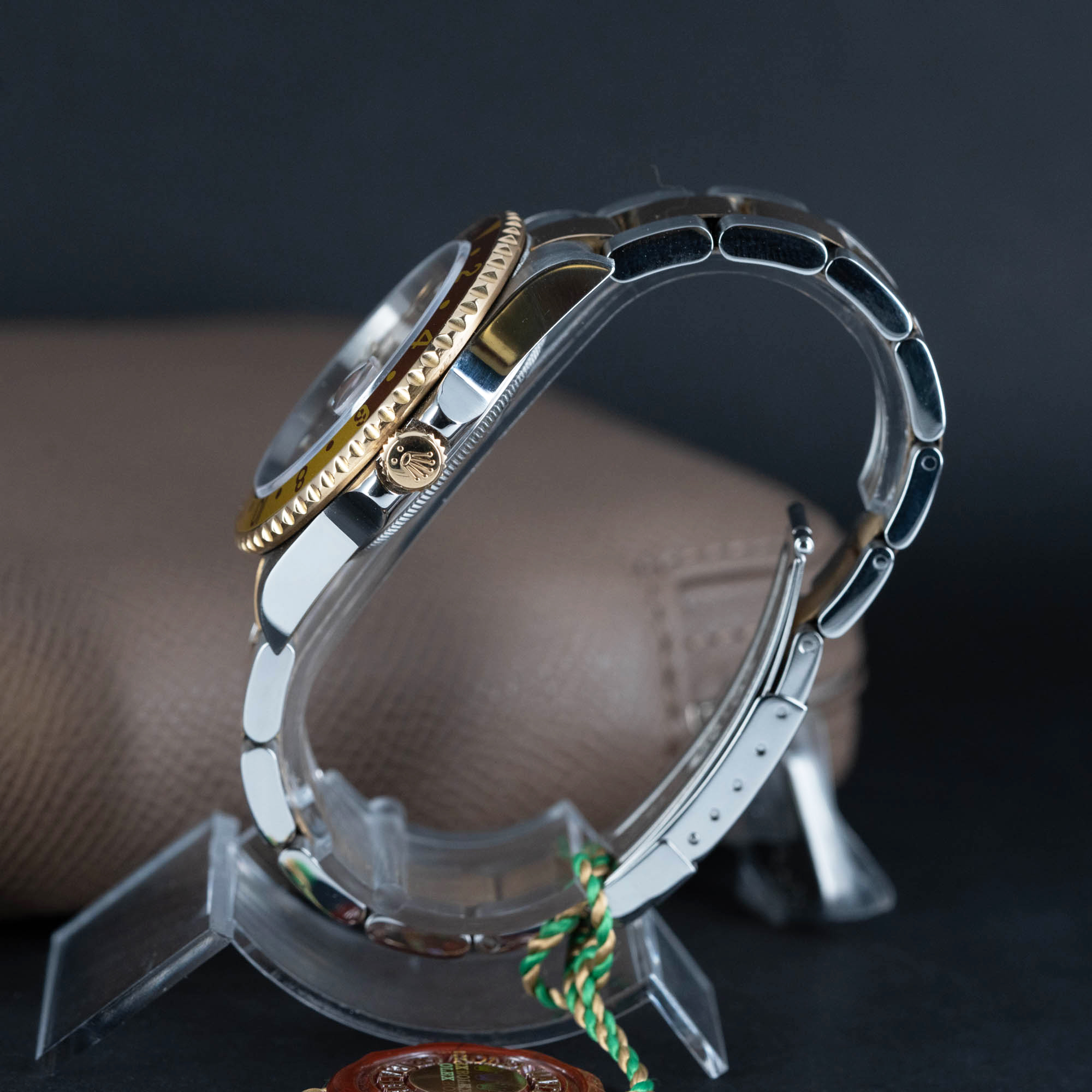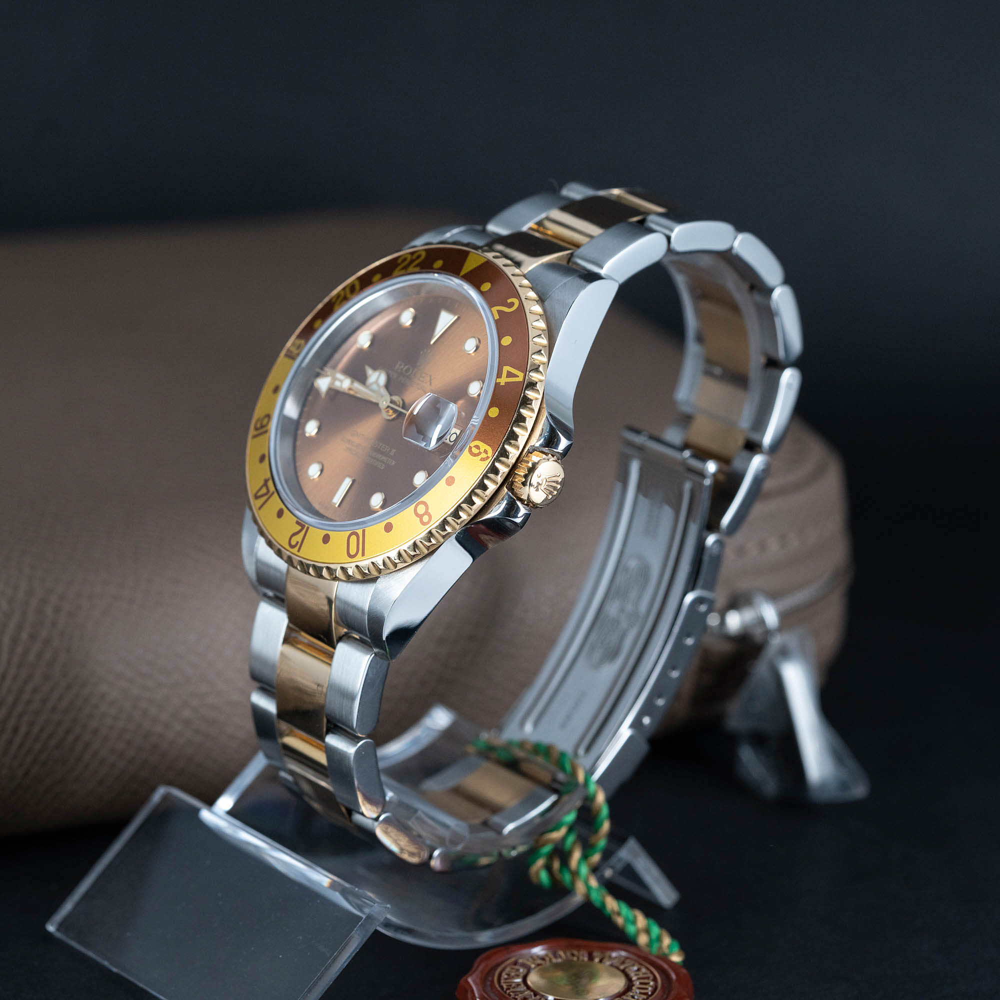 Rolex GMT-Master II 16713-T vuodelta 2004. Full-set, kaikki laatikot ja paperit. Hankittu 2004 Nymans Ur:lta. Huippukuntoinen ruskea luminova kellotaulu ja kullanväriset -osoittimet. Ruskea-kulta 24h bezel. Teräs-kulta kuori on erittäin hienossa kunnossa. Kellossa on Rolexin cal.3185GMT automaatti kronometrikoneisto. Kuoren koko on 40mm.