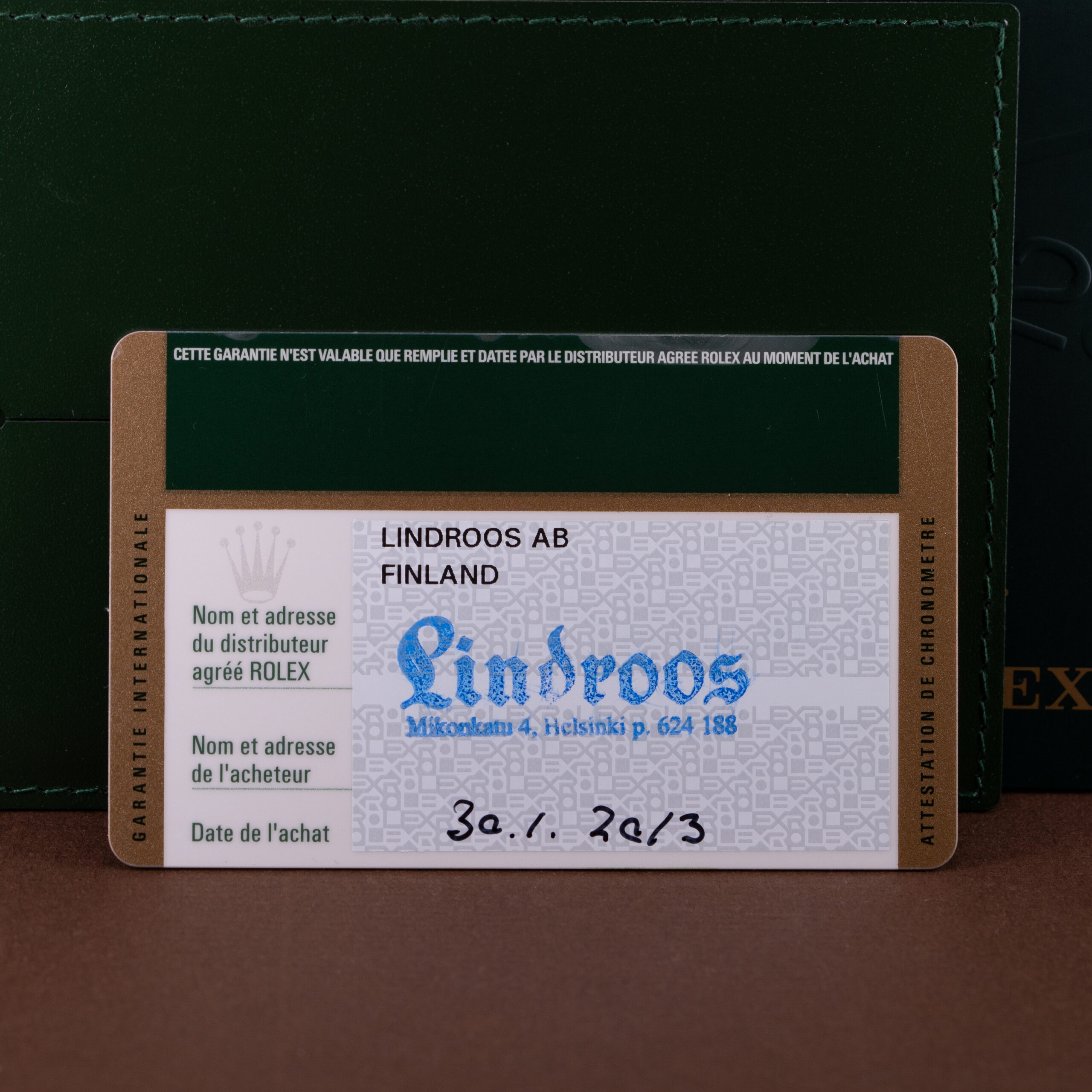Kellon mukana tulee kaikki alkuperäisen myyntikokonaisuuden osat: molemmat laatikot, käyttöohjeet, takuukortti (Lindroos 1/2013) ja punainen kronometritagi.