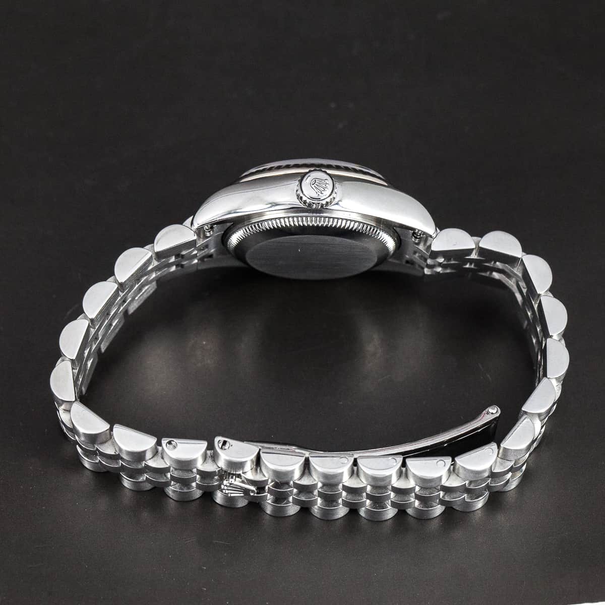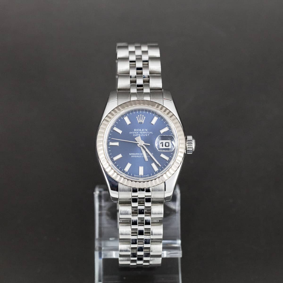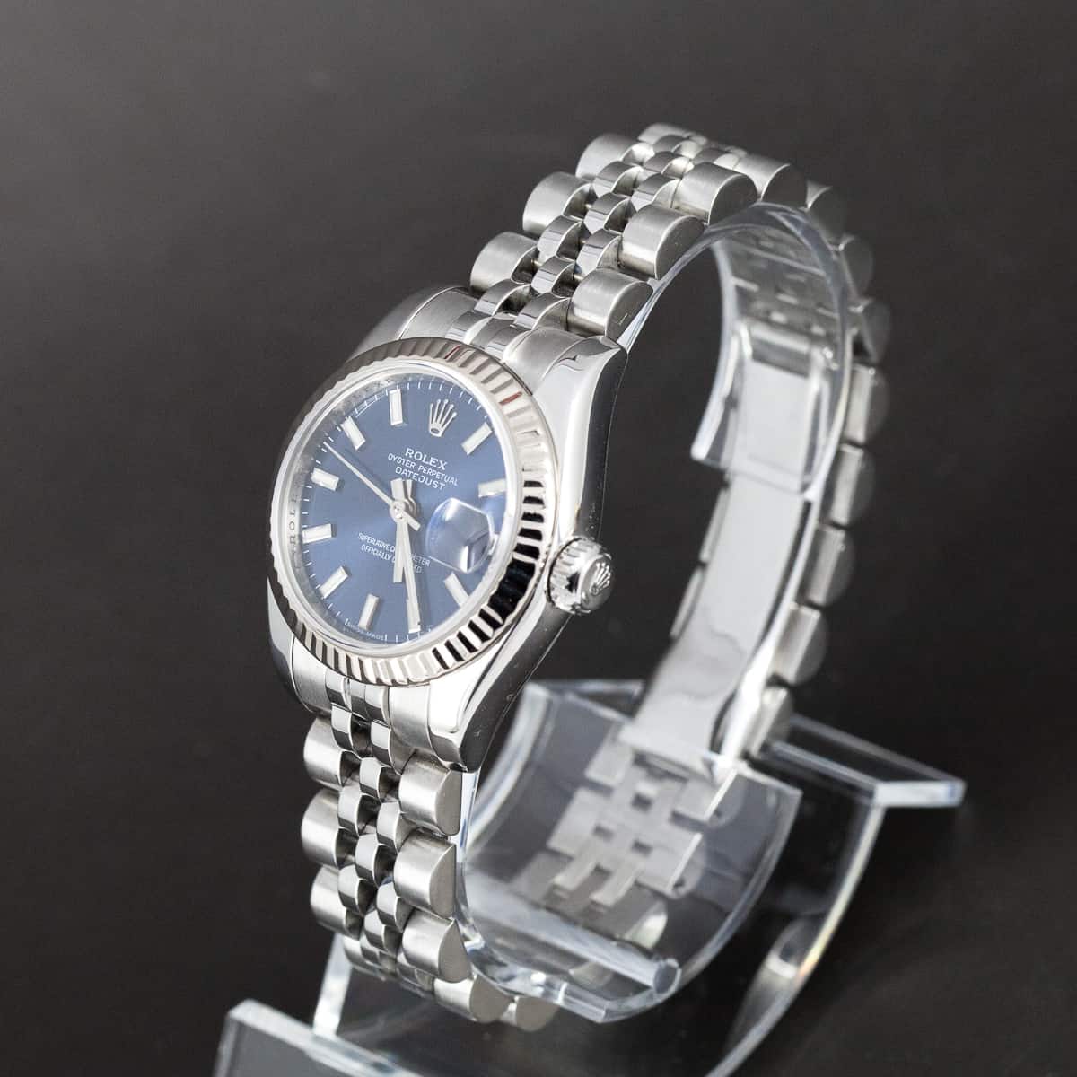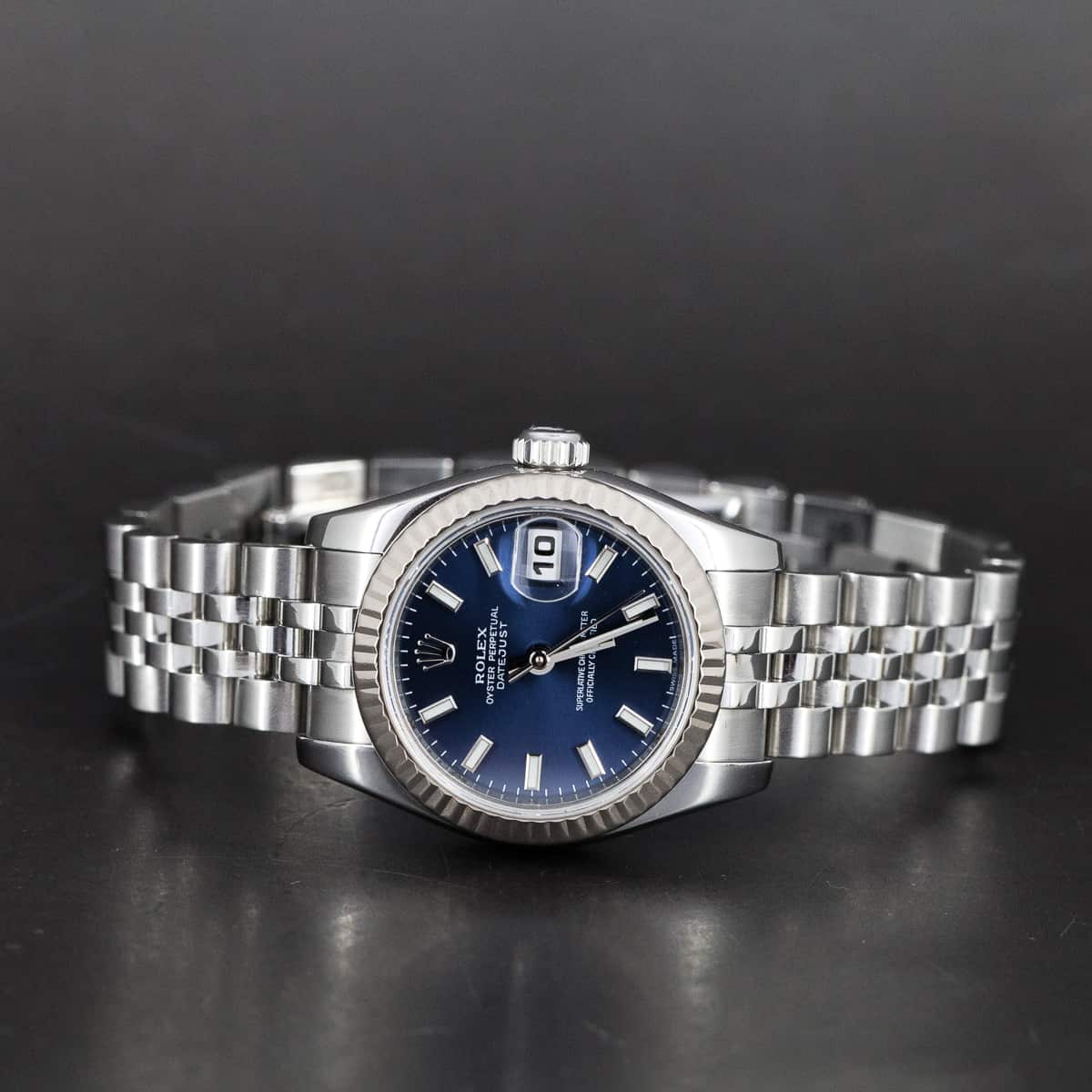 Teräskuorinen Rolex Oyster Lady-Datejust ref.179174 vuodelta 2006-7. Erittäin hyväkuntoinen yksilö. Valkokultainen lasisarja. Alkuperäinen ja uudenveroinen Jubilee teräsranneke piilolukolla. Automaattikoneisto on testattu ja sille tulee 12kk huoltotakuu. Täysin vesitiivis yksilö, testattu +10/-0,7bar. Kuoren koko 26mm. Mukana alkuperäinen laatikko, ei papereita.