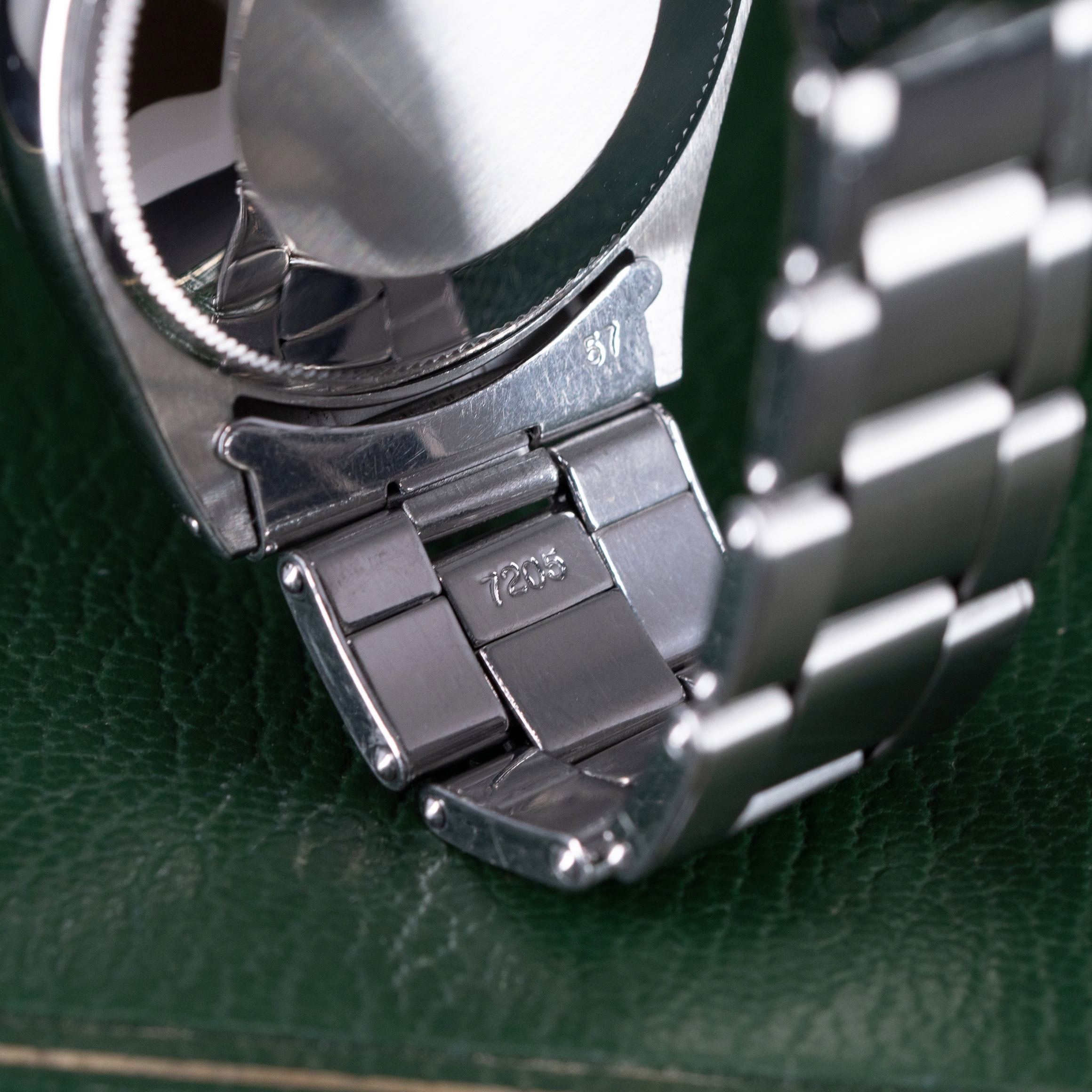 Kellossa on sen alkuperäinen Rolex Riveted ref. 7205/57 teräsranneke. Ranneke on erittäin hyvässä kunnossa. Lukossa on vuosikoodi 2/68.