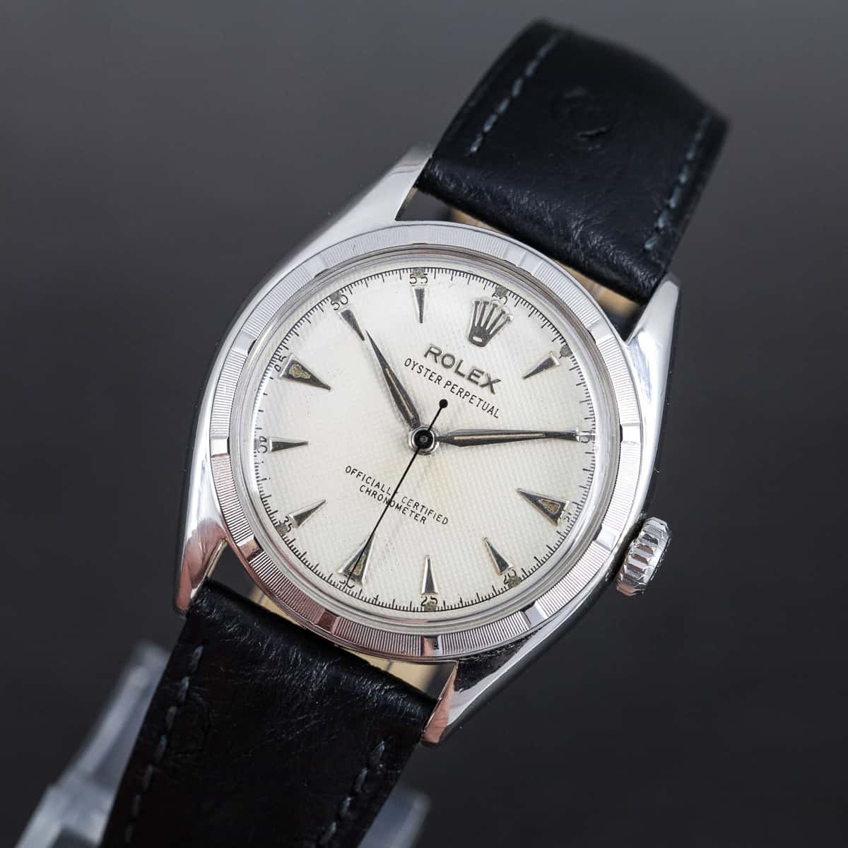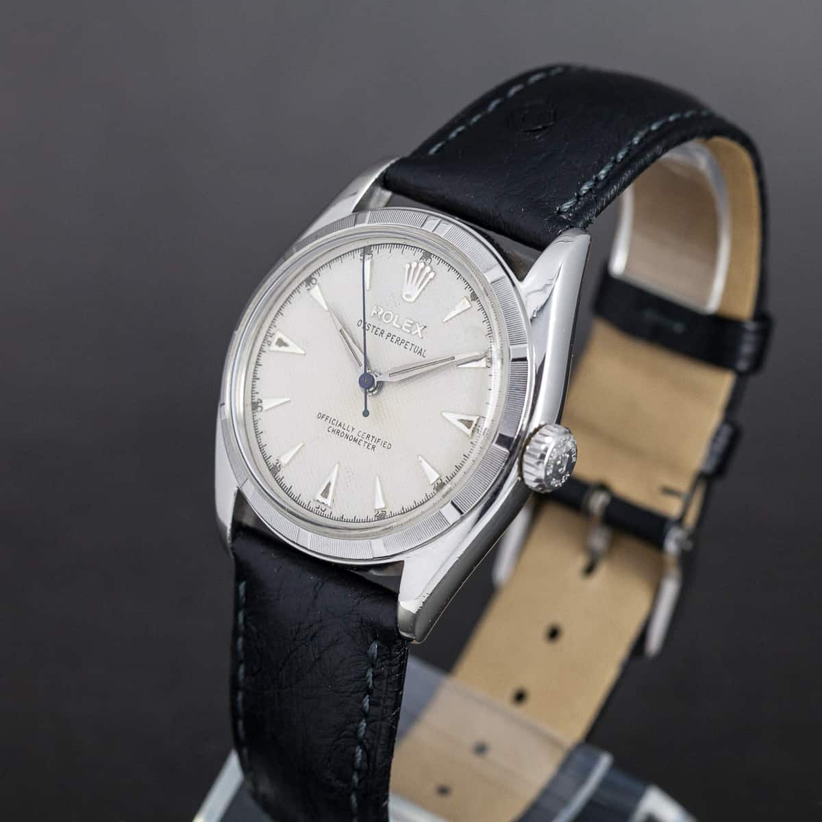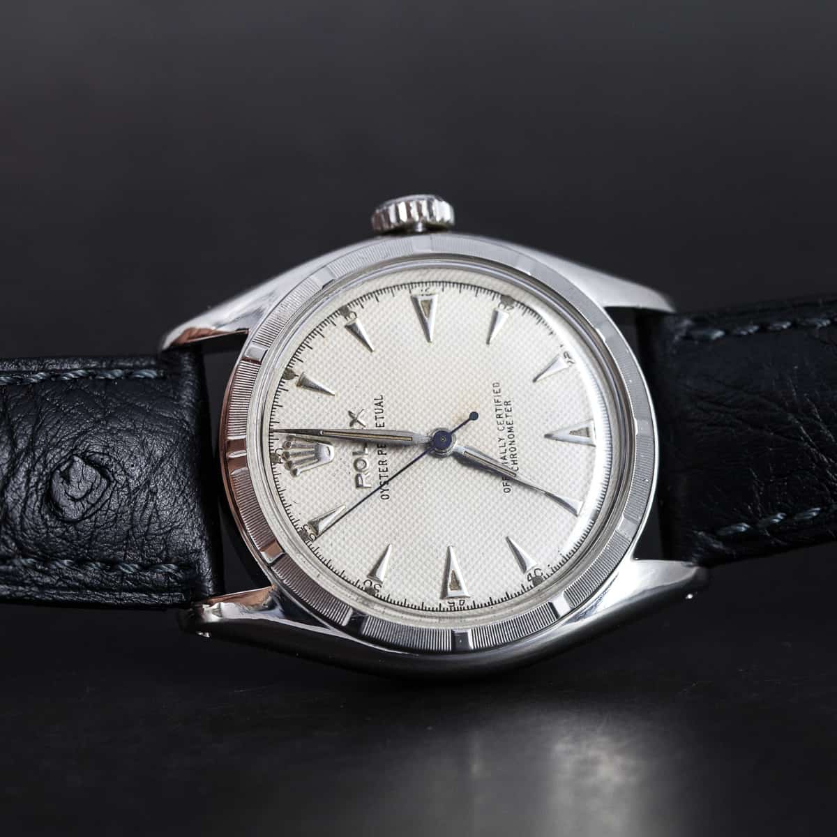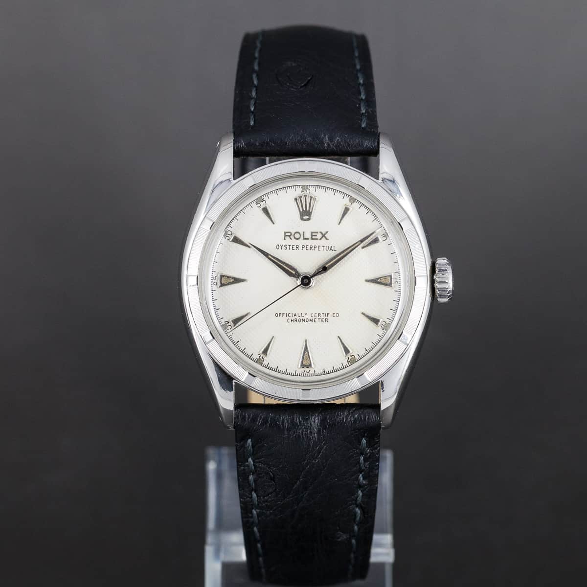 Harvinainen Rolex Oyster ”Bubble-back” Perpetual Chronometer ref. 6085 vuodelta 1961. Hopeoitu waffle-tyyppinen kellotaulu ja teräksiset osoittimet. Rolexin automaattikoneisto on juuri täydellisesti huollettu. Alkuperäinen nuppi ja Bubble-back takapohja. Hirsch Genuine Ostrich ranneke. Kuoren koko on 34mm.