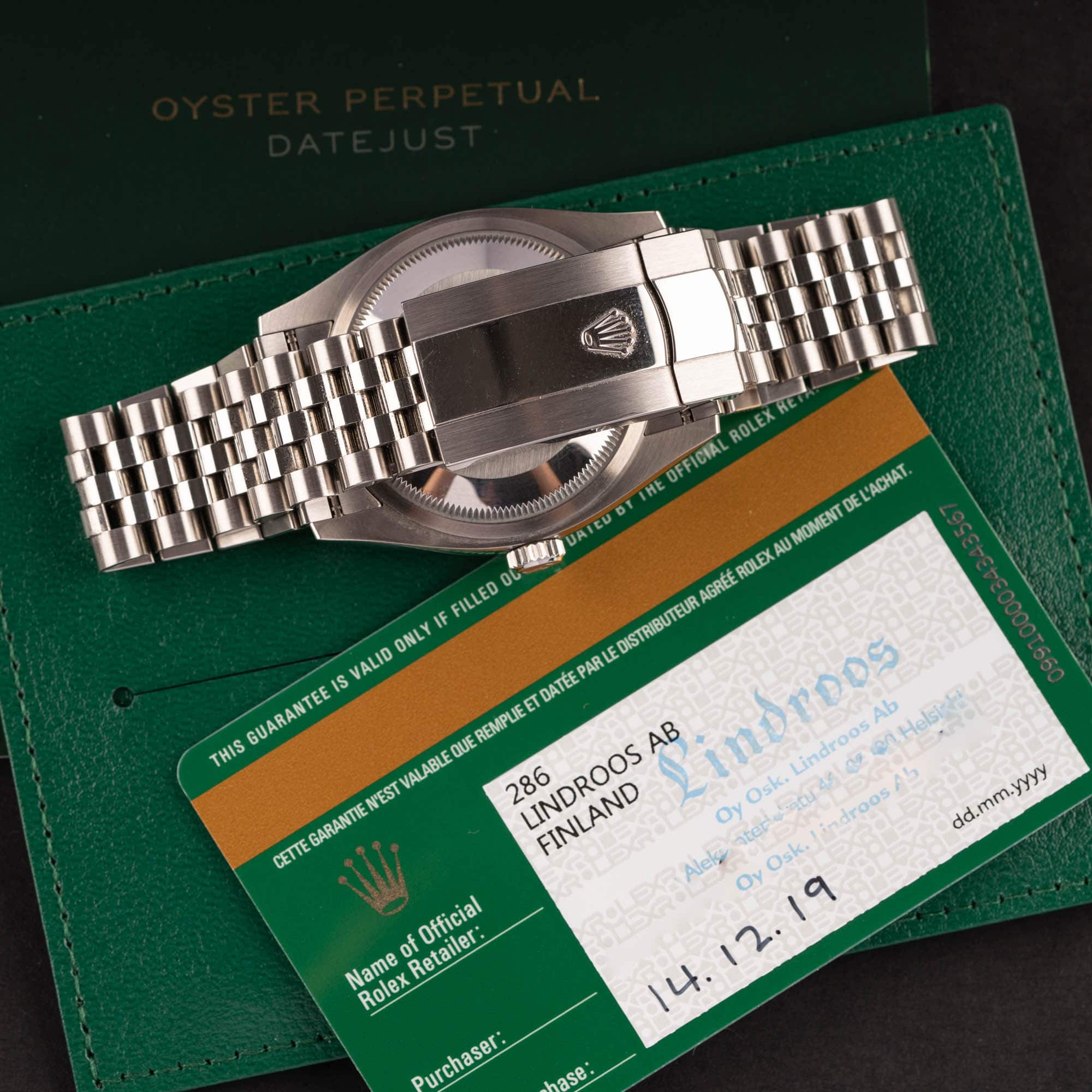 Uudenveroinen Rolex Oyster Perpetual Datejust ref.126234 vuodelta 2019. Full-set, kaikki laatikot ja paperit. Ostettu Lindroosilta 12.2019. Virheetön 18k valkokultainen fluted-bezel. Teräskuori on hienossa kunnossa. Koneisto on Rolexin uusin 3235 automaattikoneisto. Kuoren koko on 36mm. Rolexin Jubilee teräsranneke.