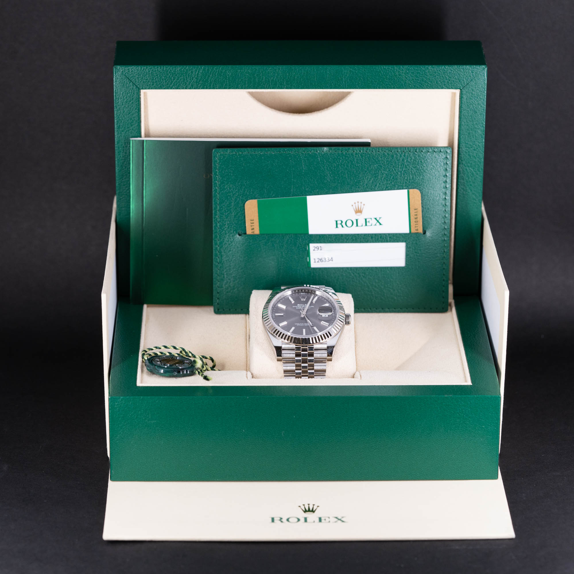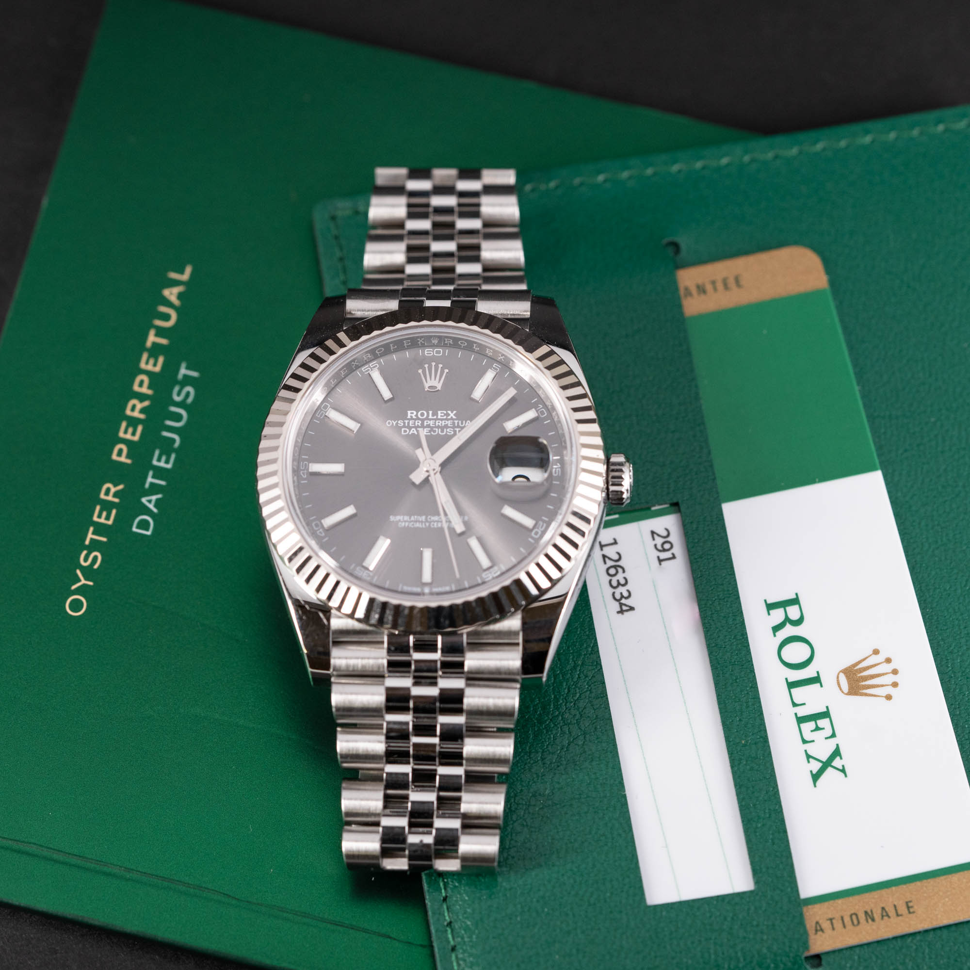 Rolex Oyster Perpetual Datejust 41 ref.126334 vuodelta 2019. Full-set, kaikki laatikot ja paperit. Erittäin hyväkuntoinen teräskuori ja 18k valkokultainen lasisarja. Virheetön harmaa Chromalight kellotaulu ja -osoittimet. Rolexin Jubilee teräsranneke pikasäädöllä.