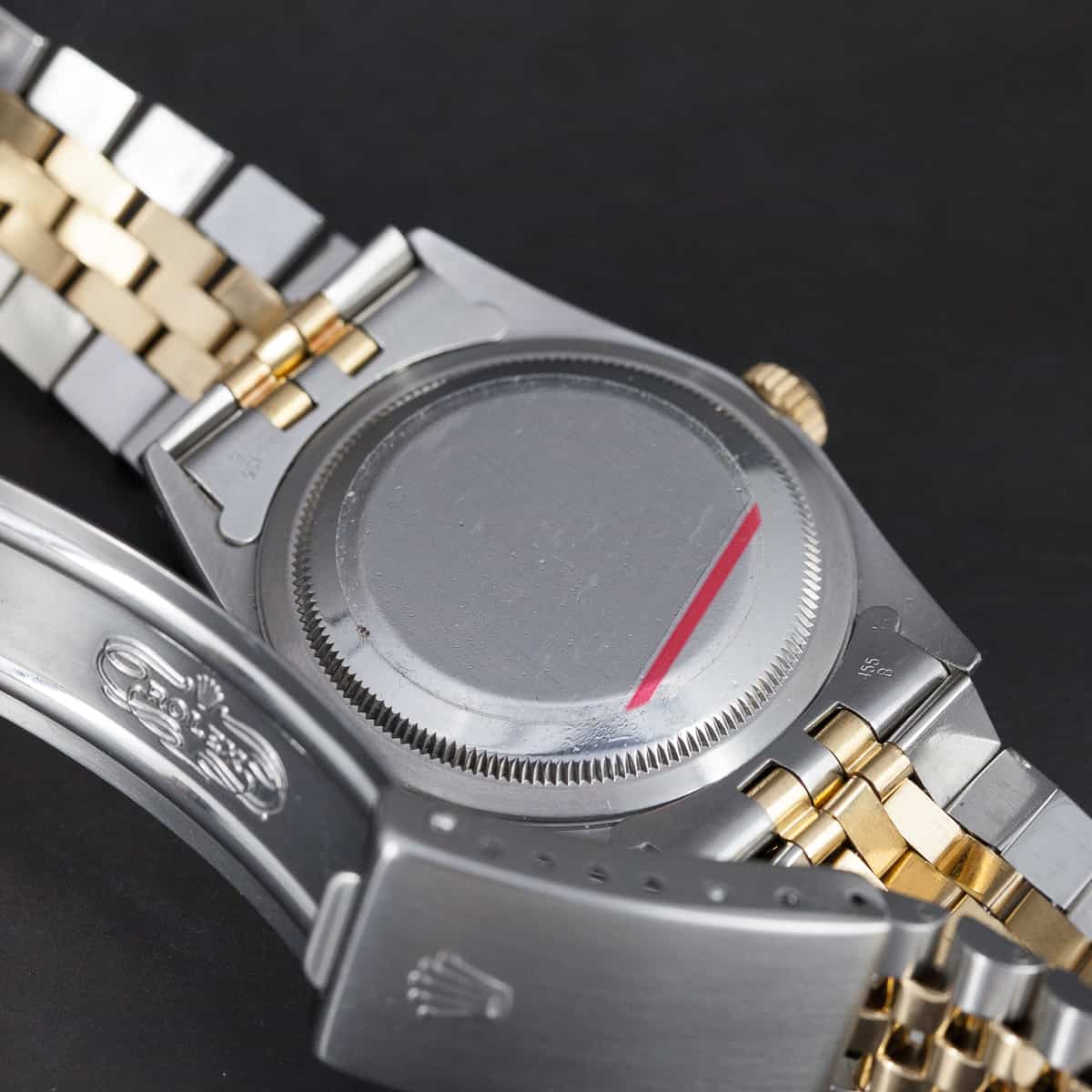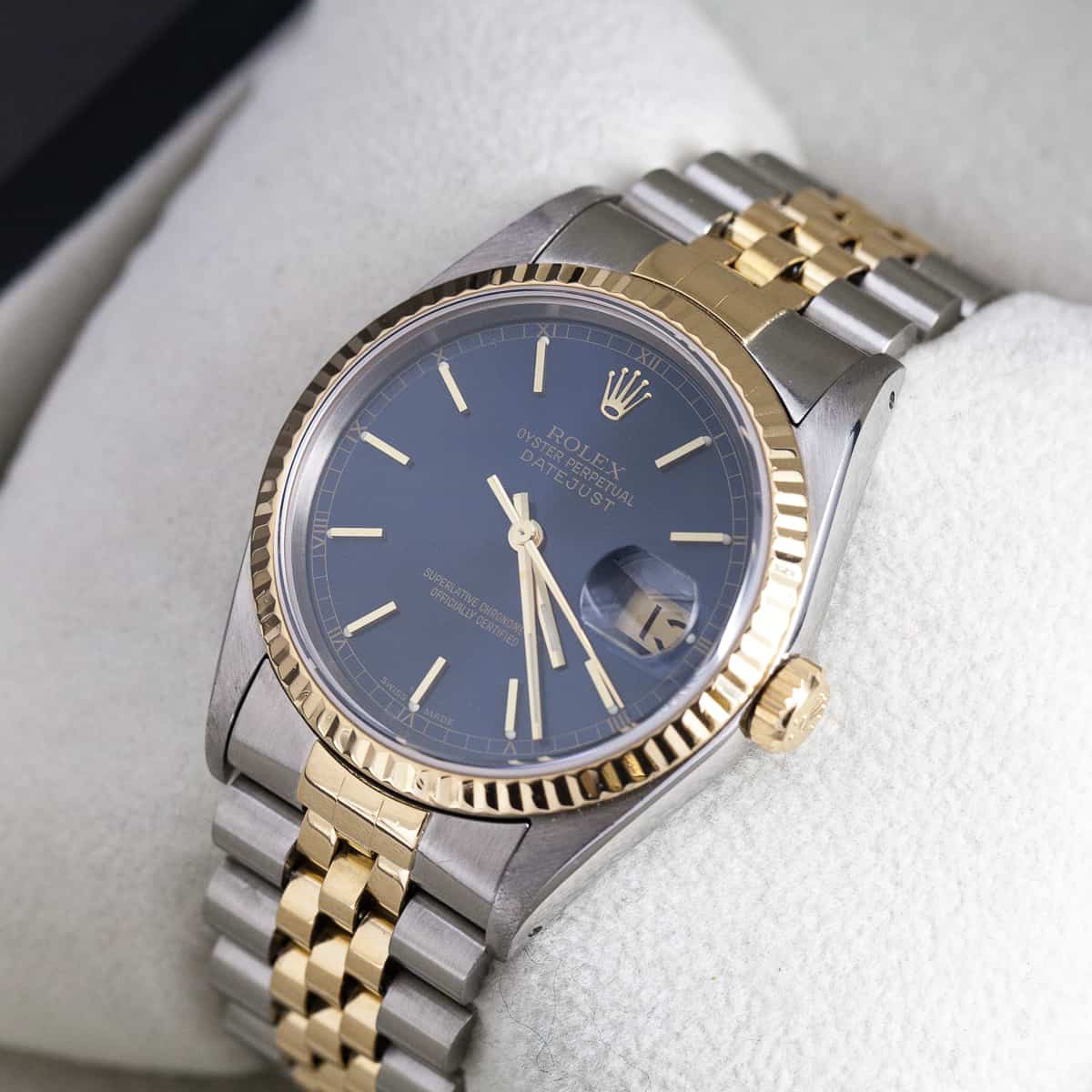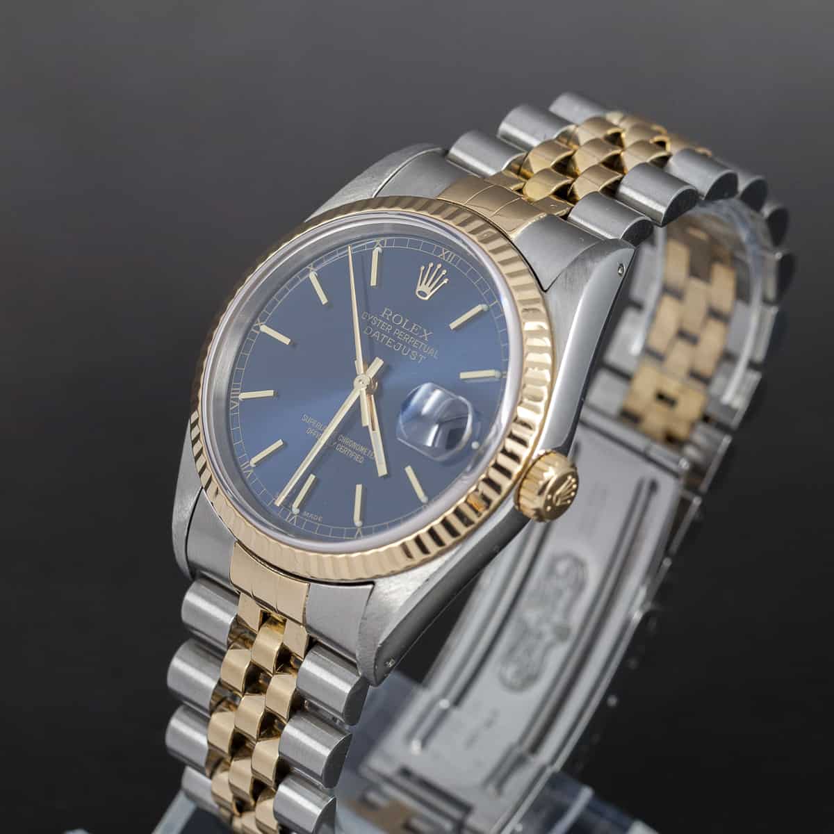 Rolex Oyster Datejust ref. 16233 vuodelta 1993. Rolexin cal. 3135 automaattikoneisto. Juuri täysin Rolexin huollon kunnostama kokonaisuus. Safiirilasi. Ranneke on alkuperäinen Jubilee ref. 62523, 455 päätypaloilla (S2). Vesitiivis, testattu +10/-0,7bar. Ei laatikkoa, papereita. Kuoren koko 36mm.