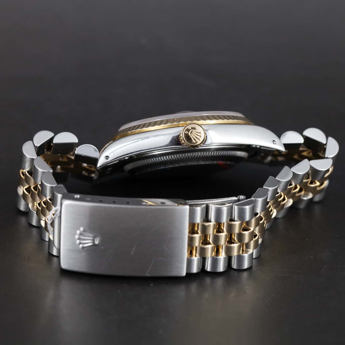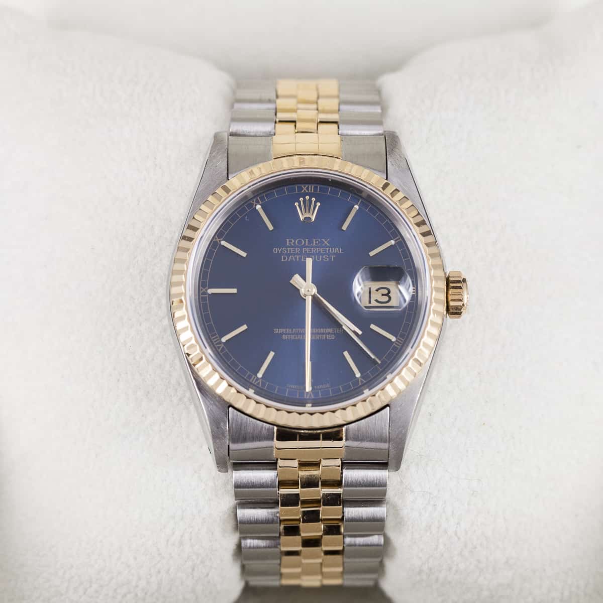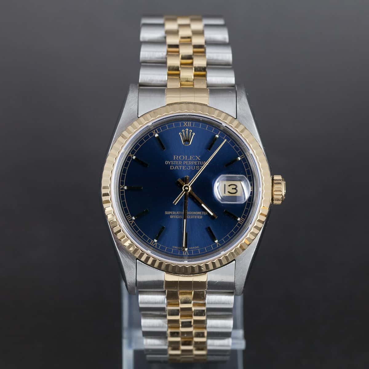 Rolex Oyster Datejust ref. 16233 vuodelta 1993. Rolexin cal. 3135 automaattikoneisto. Juuri täysin Rolexin huollon kunnostama kokonaisuus. Safiirilasi. Ranneke on alkuperäinen Jubilee ref. 62523, 455 päätypaloilla (S2). Vesitiivis, testattu +10/-0,7bar. Ei laatikkoa, papereita. Kuoren koko 36mm.