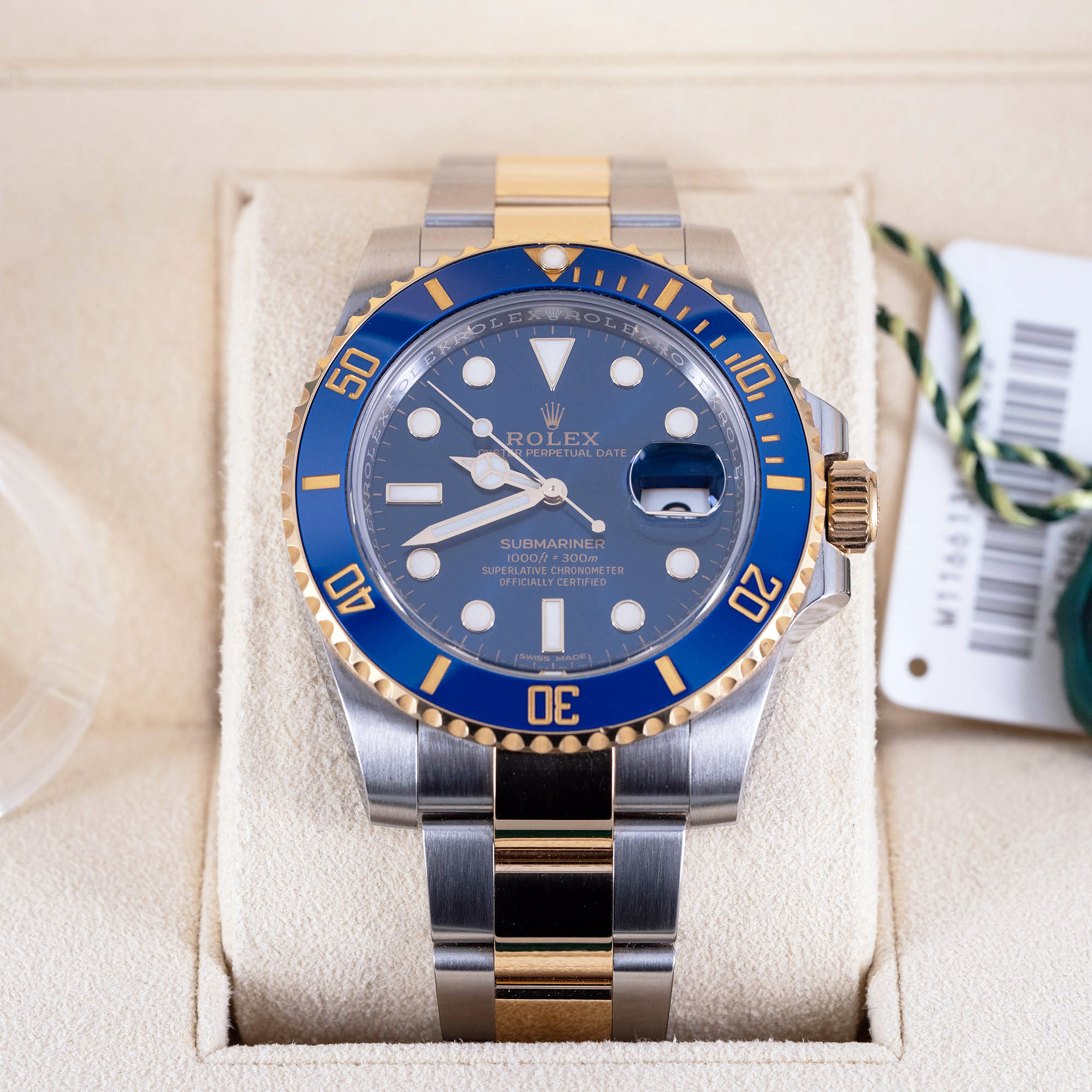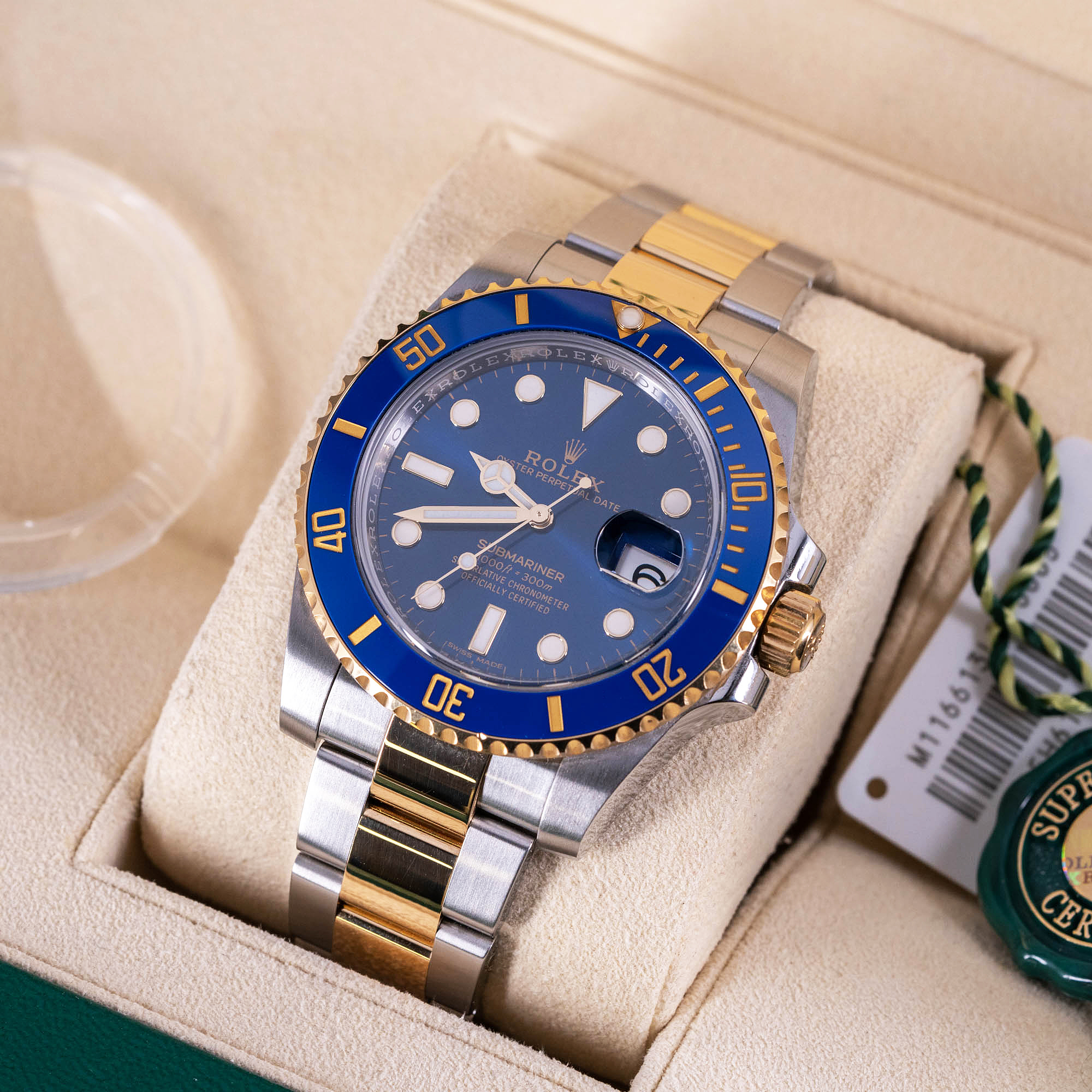 Rolex Oyster Submariner 116613LB vuodelta 2016. Full-set, molemmat laatikot, käyttöohjeet ja todistukset. Erittäin hyväkuntoinen yksilö. Virheetön sininen kellotaulu ja sininen keraaminen bezel insert. Kuoressa ja ranteessa vain vähäisiä käytön jälkiä. Koneisto toimii uudenveroisesti. 40mm teräs-kulta kuori on vesitiivis, testattu +10/-0,7 bar. Alkuperäinen teräs-kulta ranneke on varustettu lukon pikasäädöllä.