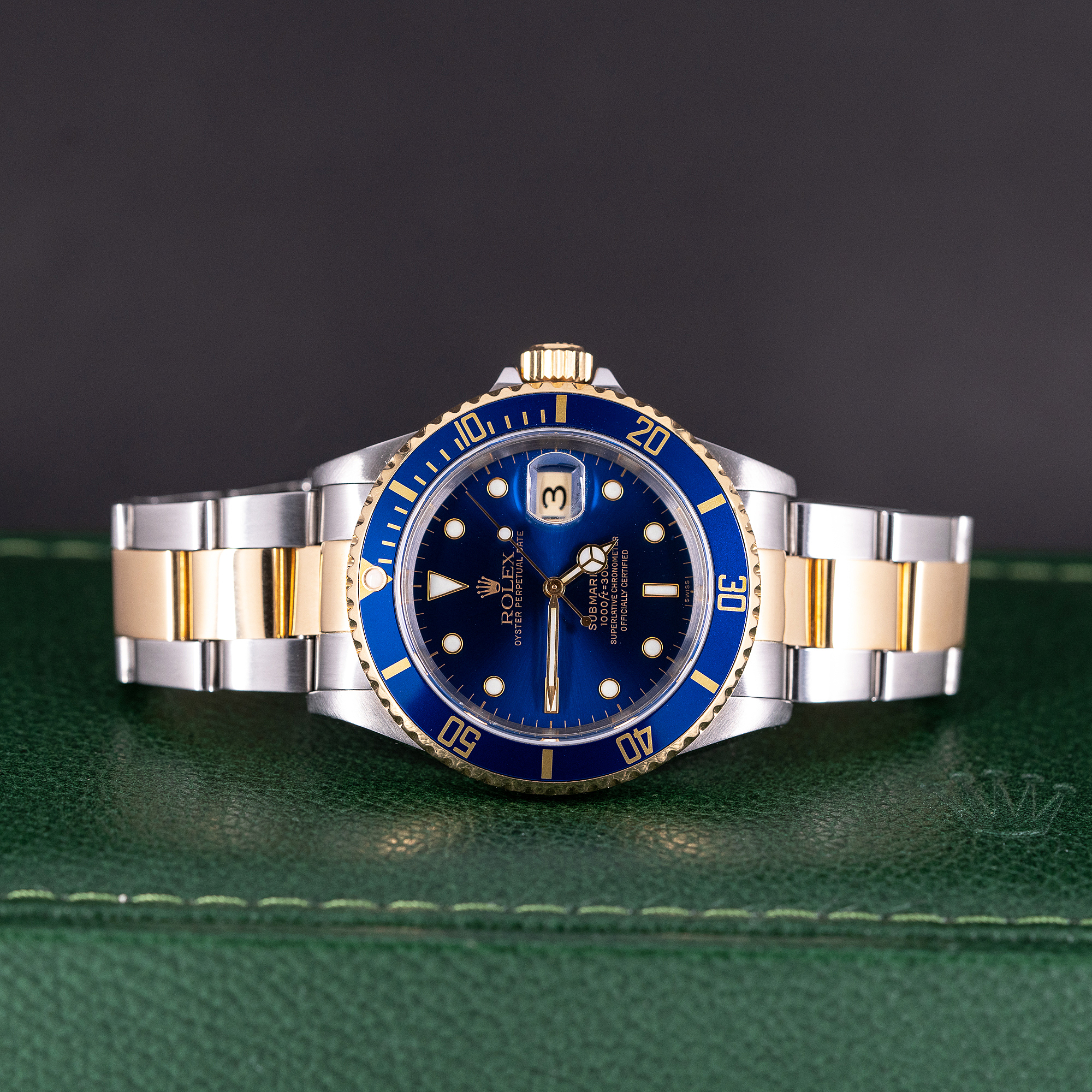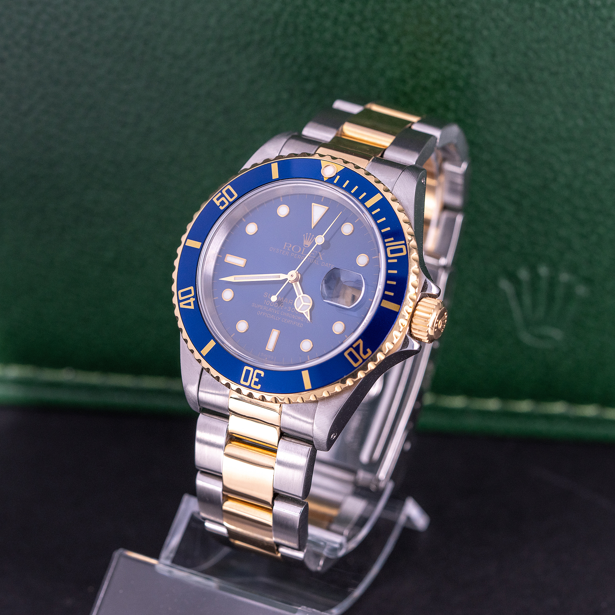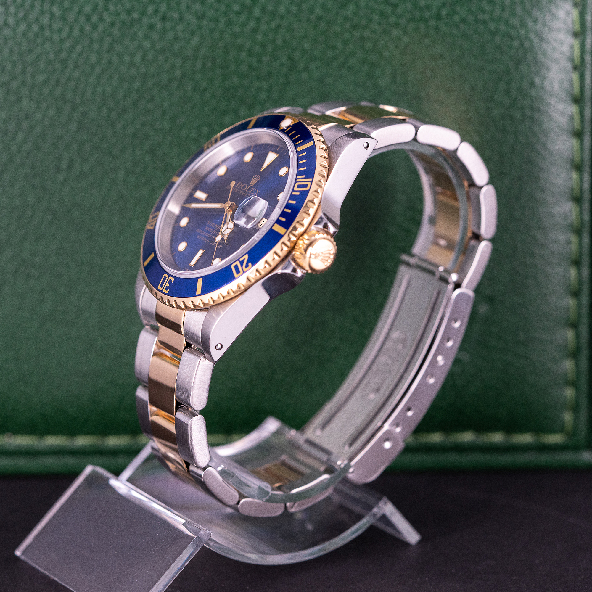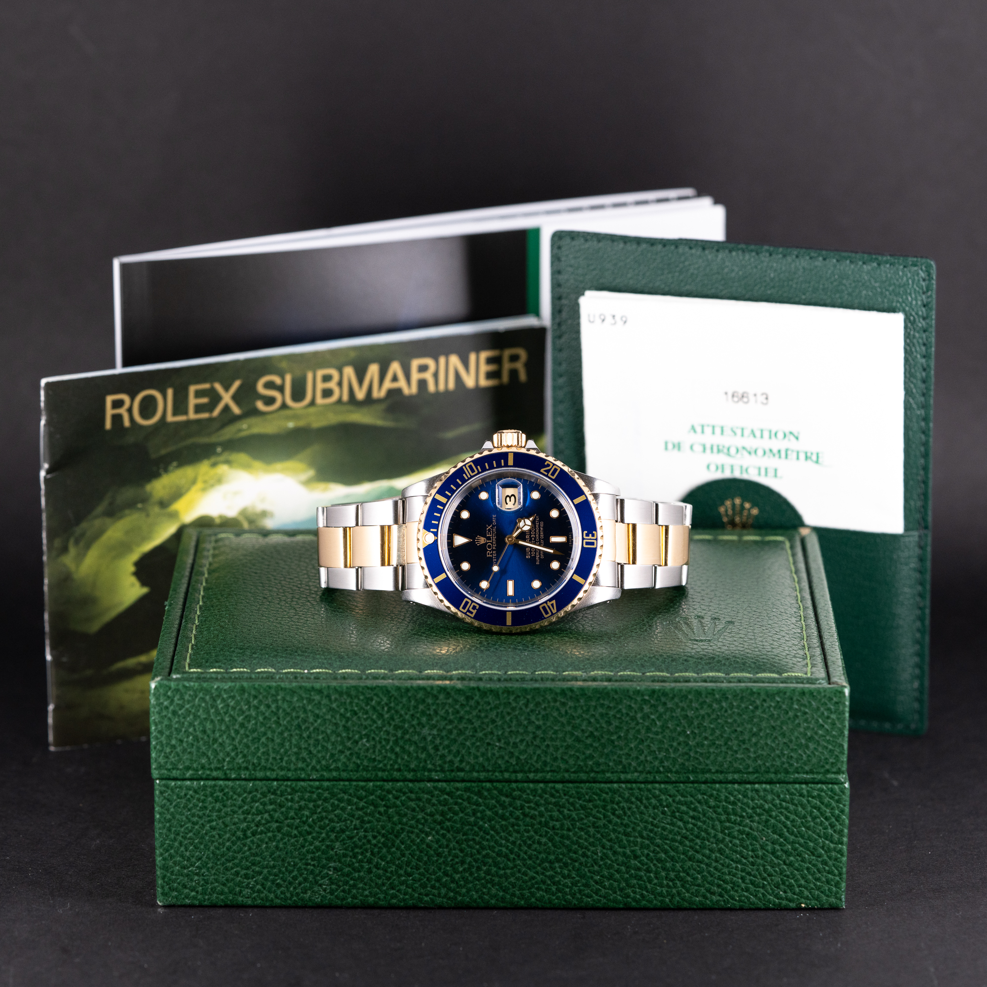 Rolex Oyster Perpetual Submariner 16613 vuodelta 1999. Suomikello, alkuperäinen laatikko ja paperit. Täydellisesti kunnostettu Hovisepillä 10.2020. Teräs-kulta kuori on hienossa kunnossa. Alkuperäinen sininen Swiss-only kellotaulu ja osoittimet ovat virheettömässä kunnossa. Kultainen bezel virheettömällä sinisellä insertillä. Kellossa on Rolexin cal.3135 automaattikoneisto. Kello on vesitiivis. Kuoren koko on 40mm.