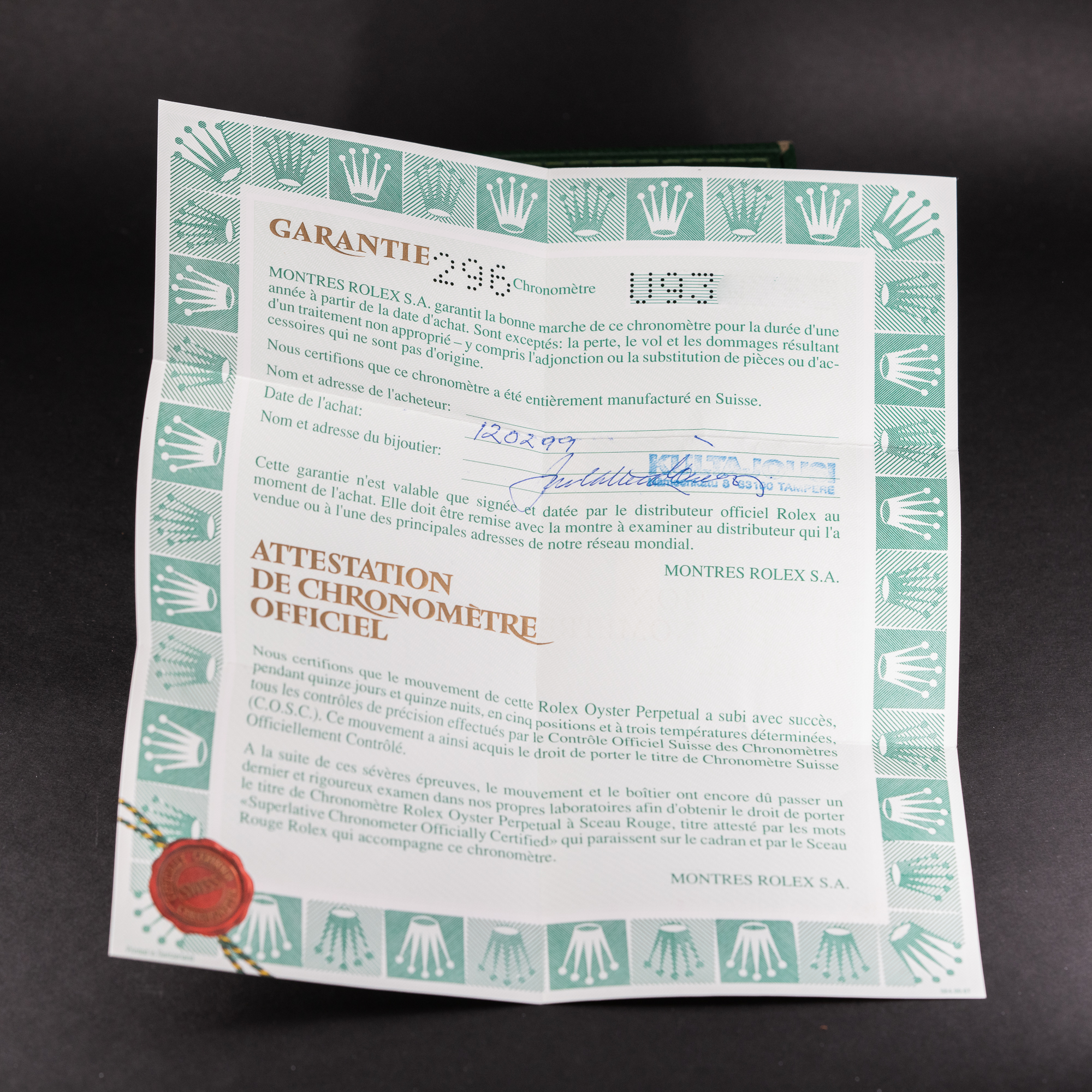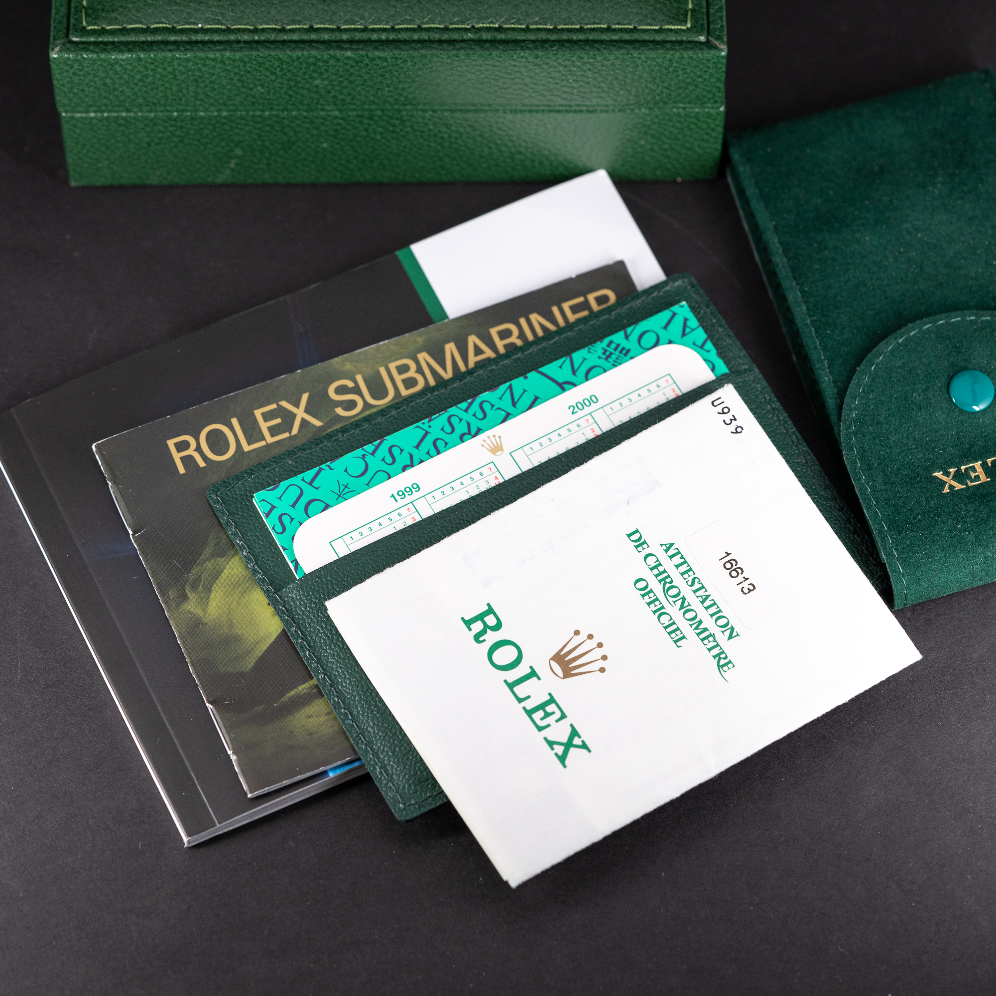 Kellon mukana tulee alkuperäinen laatikko (sisällä Rolexin huoltopussi), kronometritodistus (leimattu Kultajousi, Tampere 2/1999), Submariner käyttöohje, Rolex vihreä kalenteritasku ja kalenteri vuosille 1999/2000, käännösdoku ja huoltotakuuvihko ja kortti.